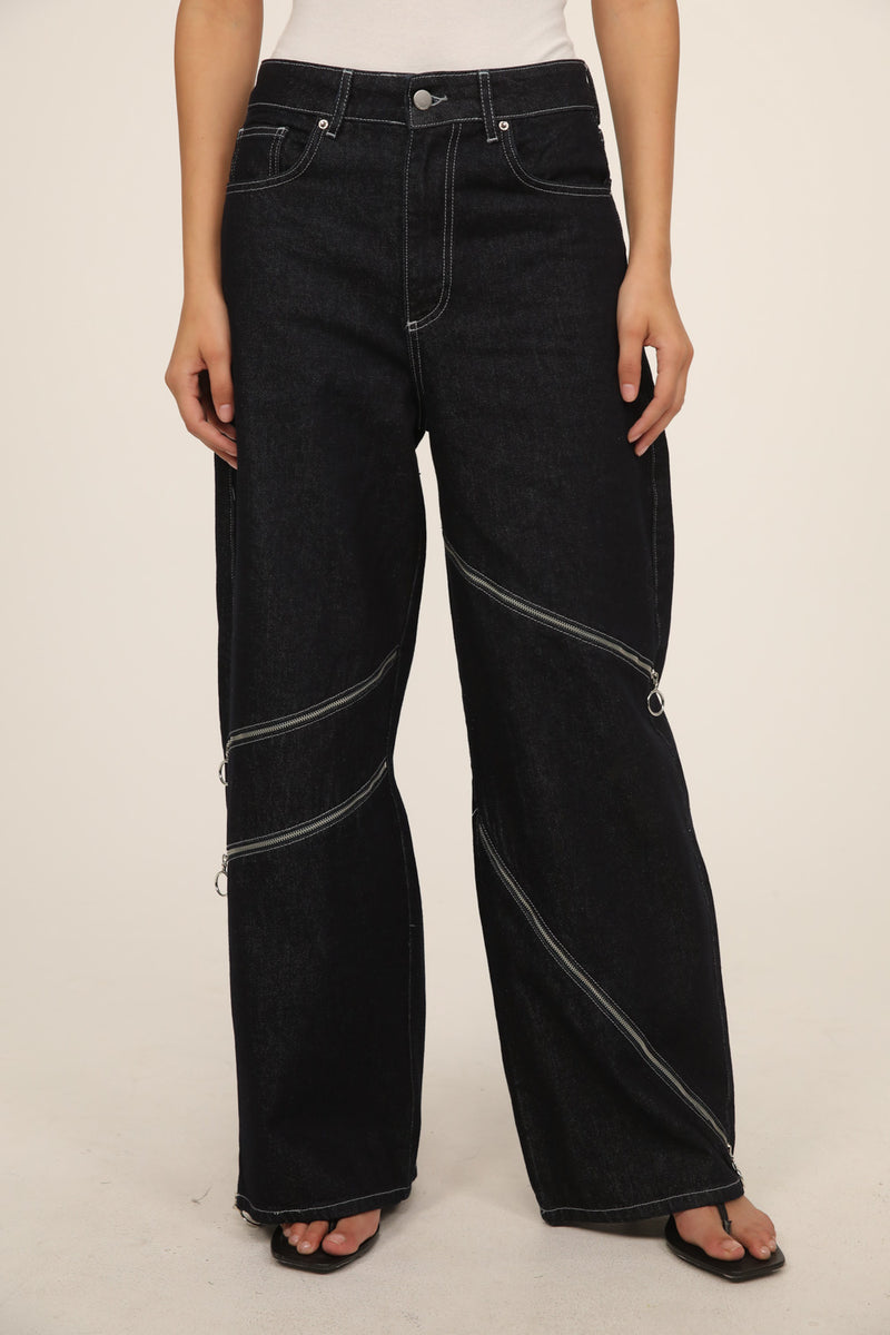 Decorative diagonal zippers are integrated along the leg, creating bold cut lines and a unique look.