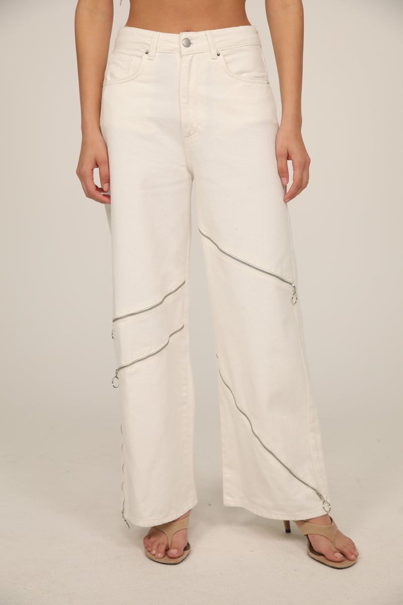 Decorative diagonal zippers are integrated along the leg, creating bold cut lines and a unique look.