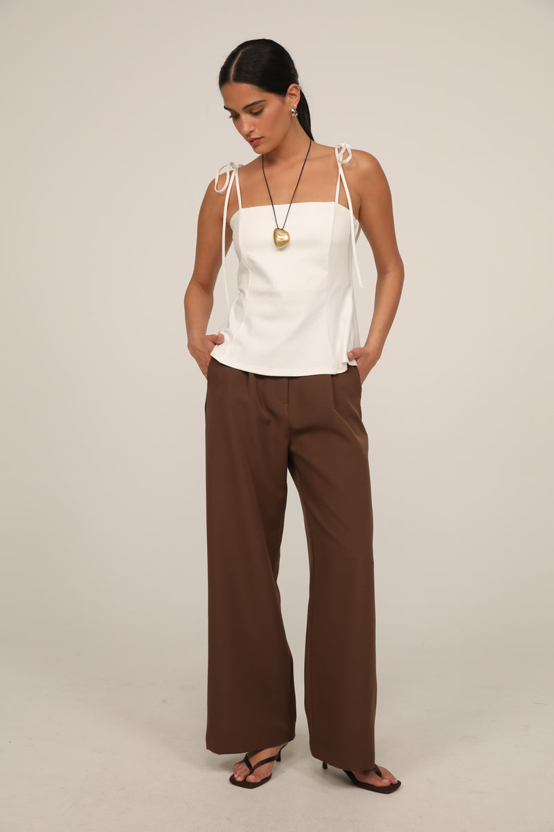 The pants are designed with a high waist and subtle pleats in the front that add flattering volume and a beautiful fall down the leg.