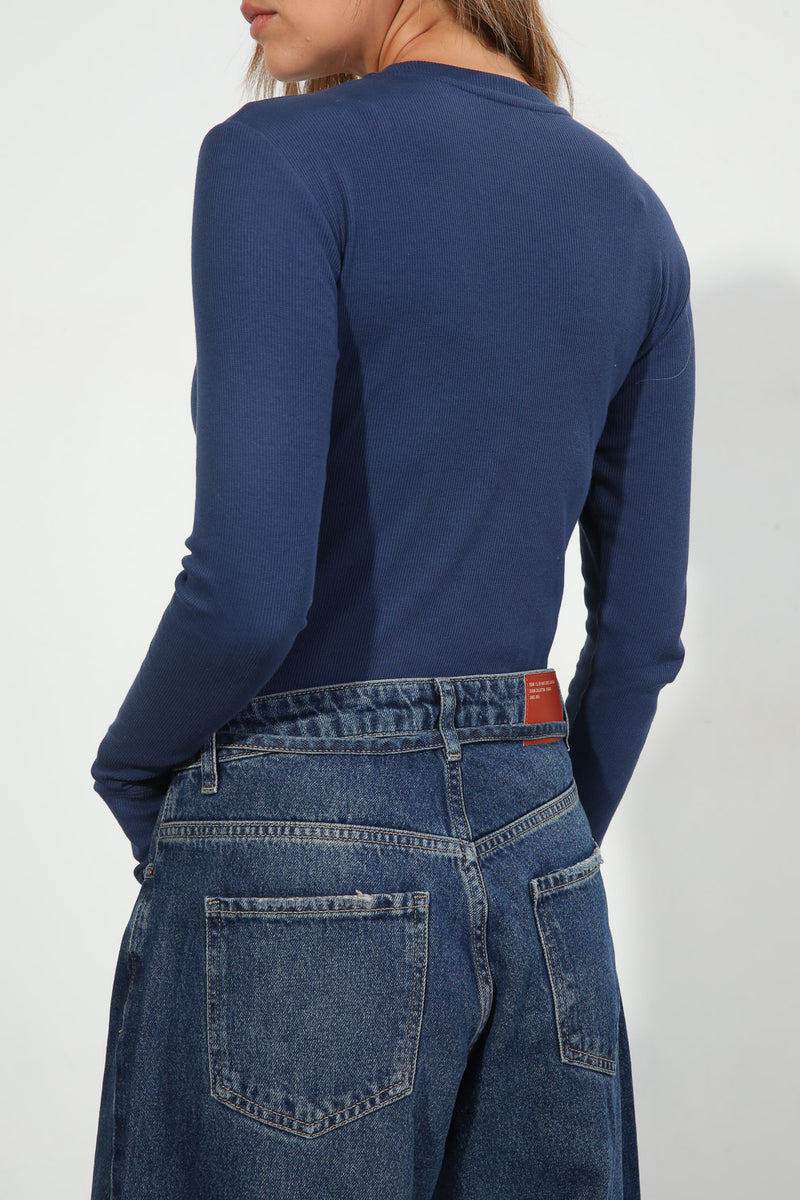בגד גוף בייסיק בטקסטורת ריפ עדינה עם צווארון עגול ושרוולי כפפה,