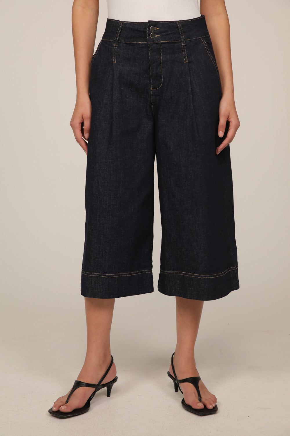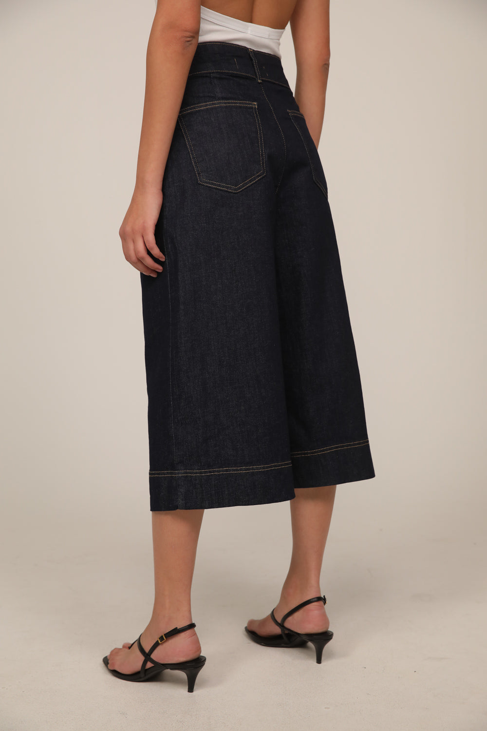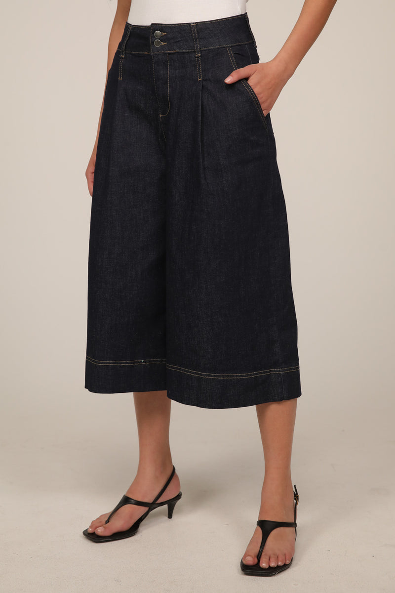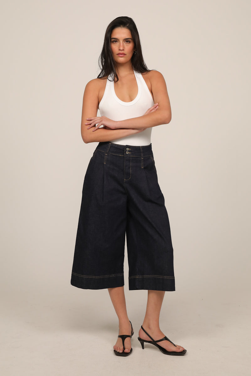 ברמודת ג’ינס בגזרה רחבה עם מותן גבוהה וקו נקי המחמיא לגזרה.