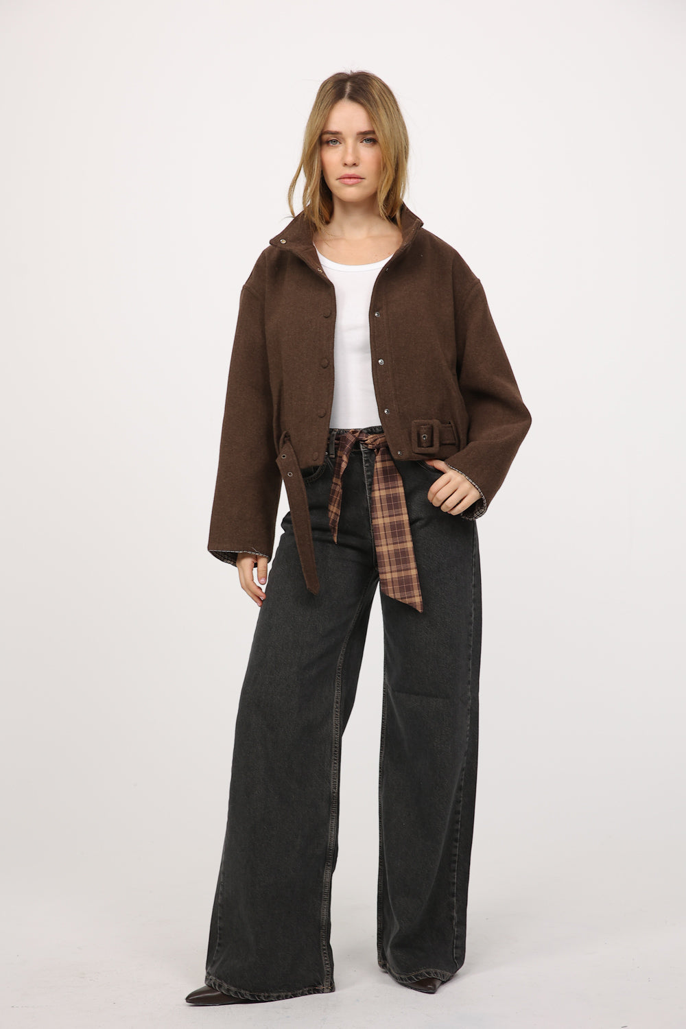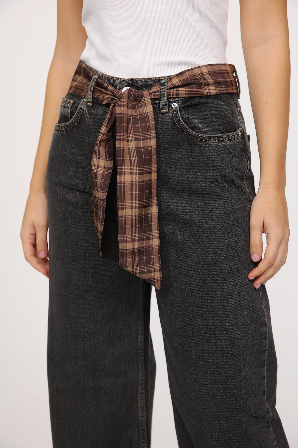 בגוון שחור שטוף עם נגיעות וינטג׳ עדינות, כולל חגורת עניבה בדפוס משבצות הנקשרת במותן ומוסיפה אופי וסטייל.