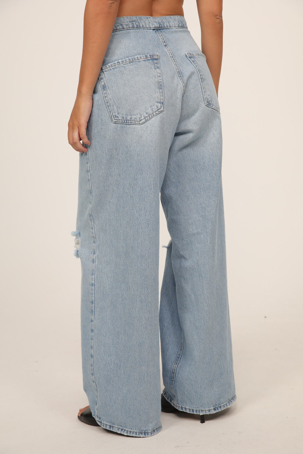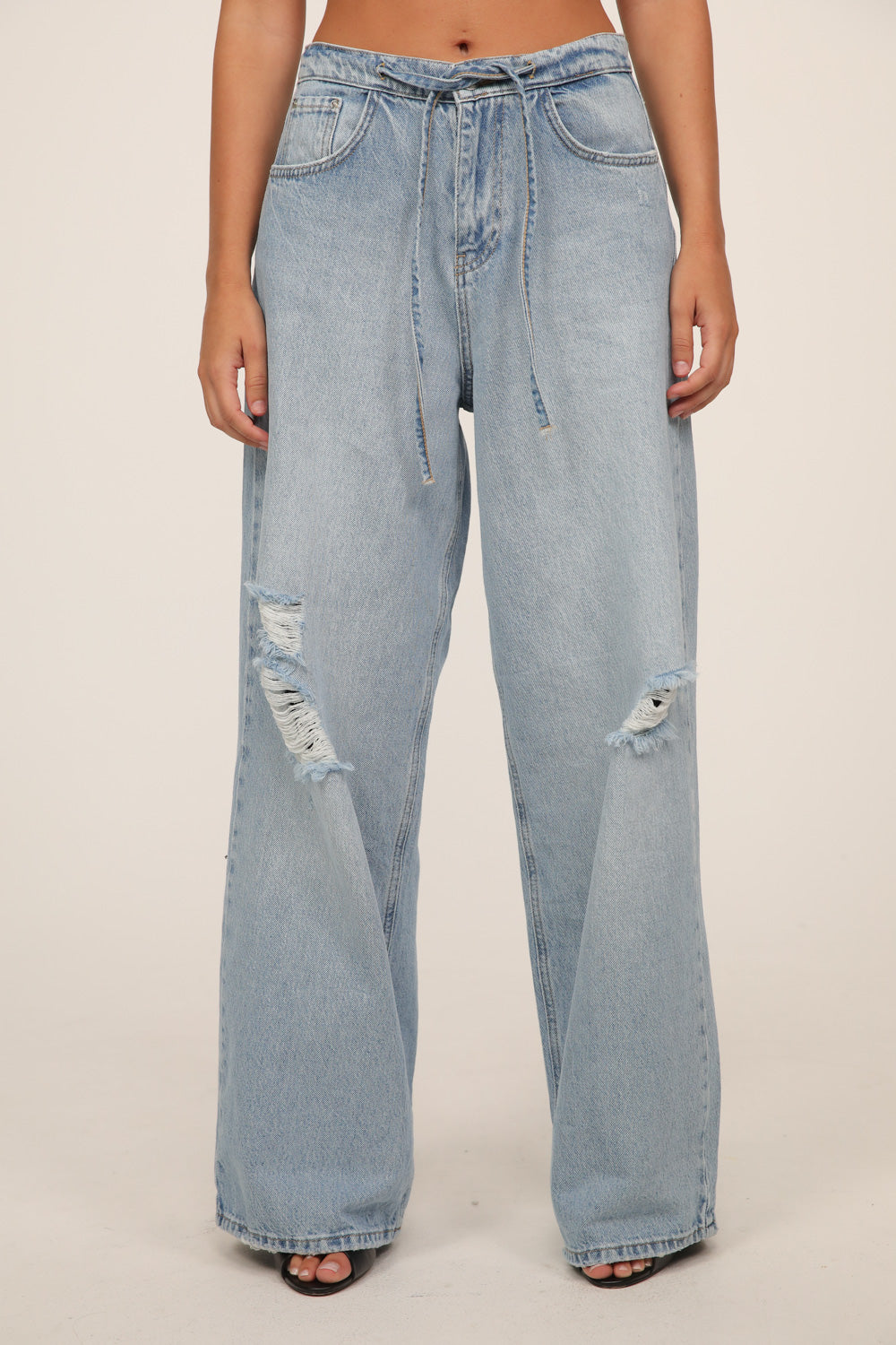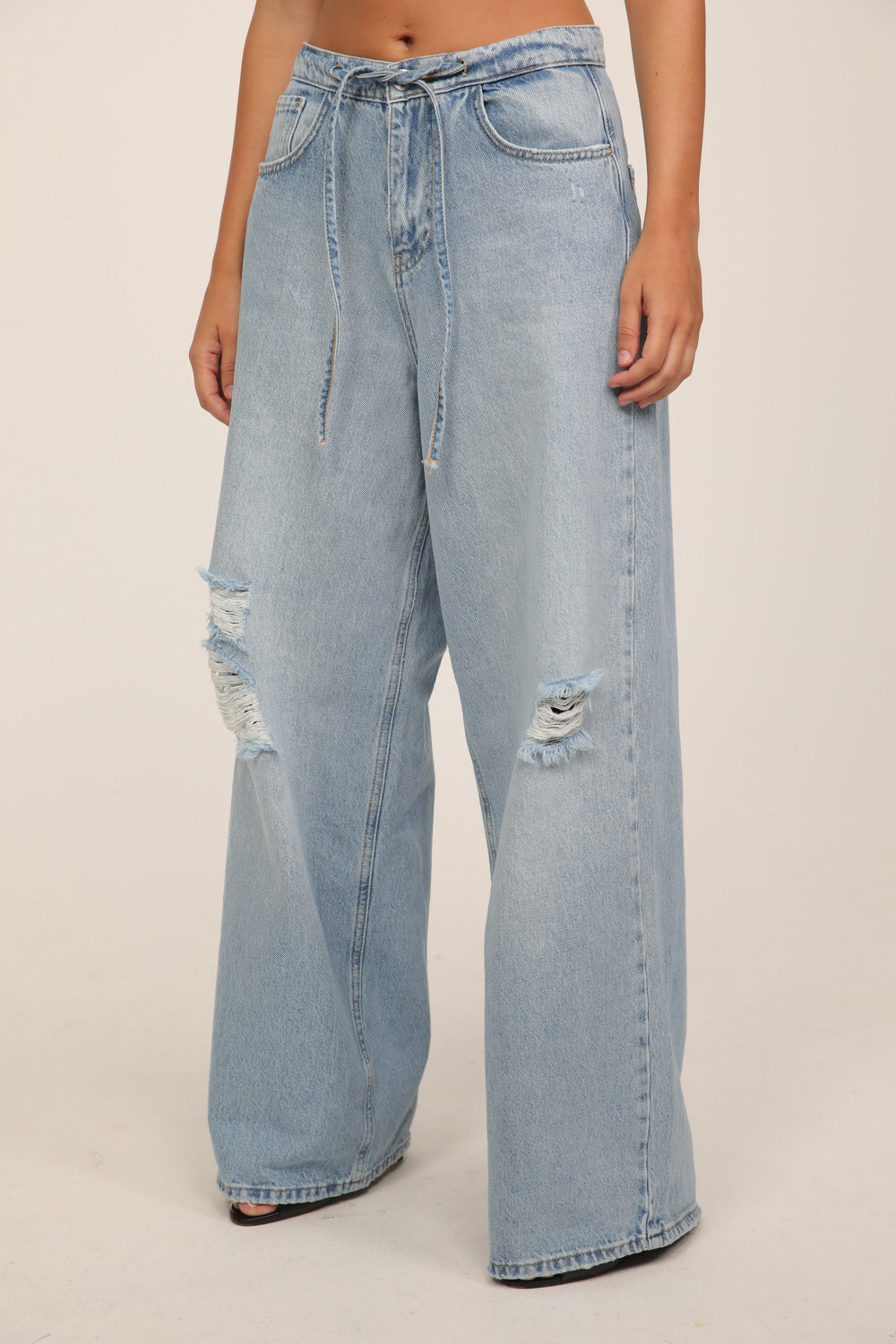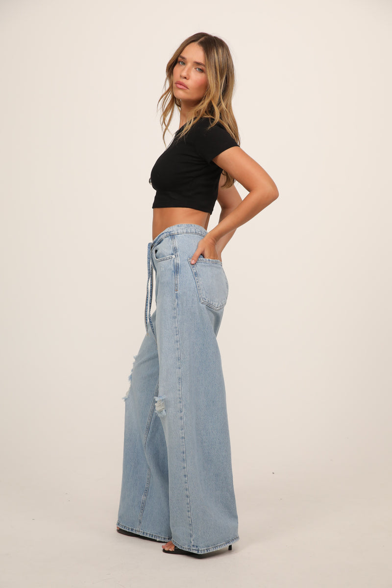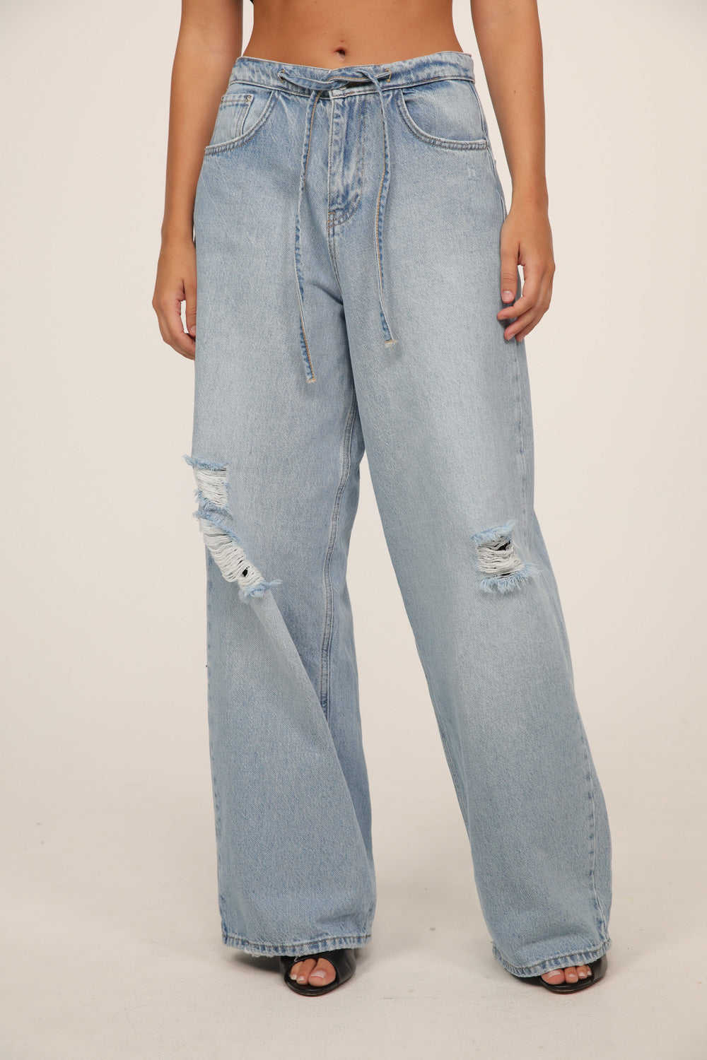 עשוי דנים בגוון כחול בהיר עם שטיפות עדינות ונגיעות קרעים שמוסיפות אופי וסטייל.