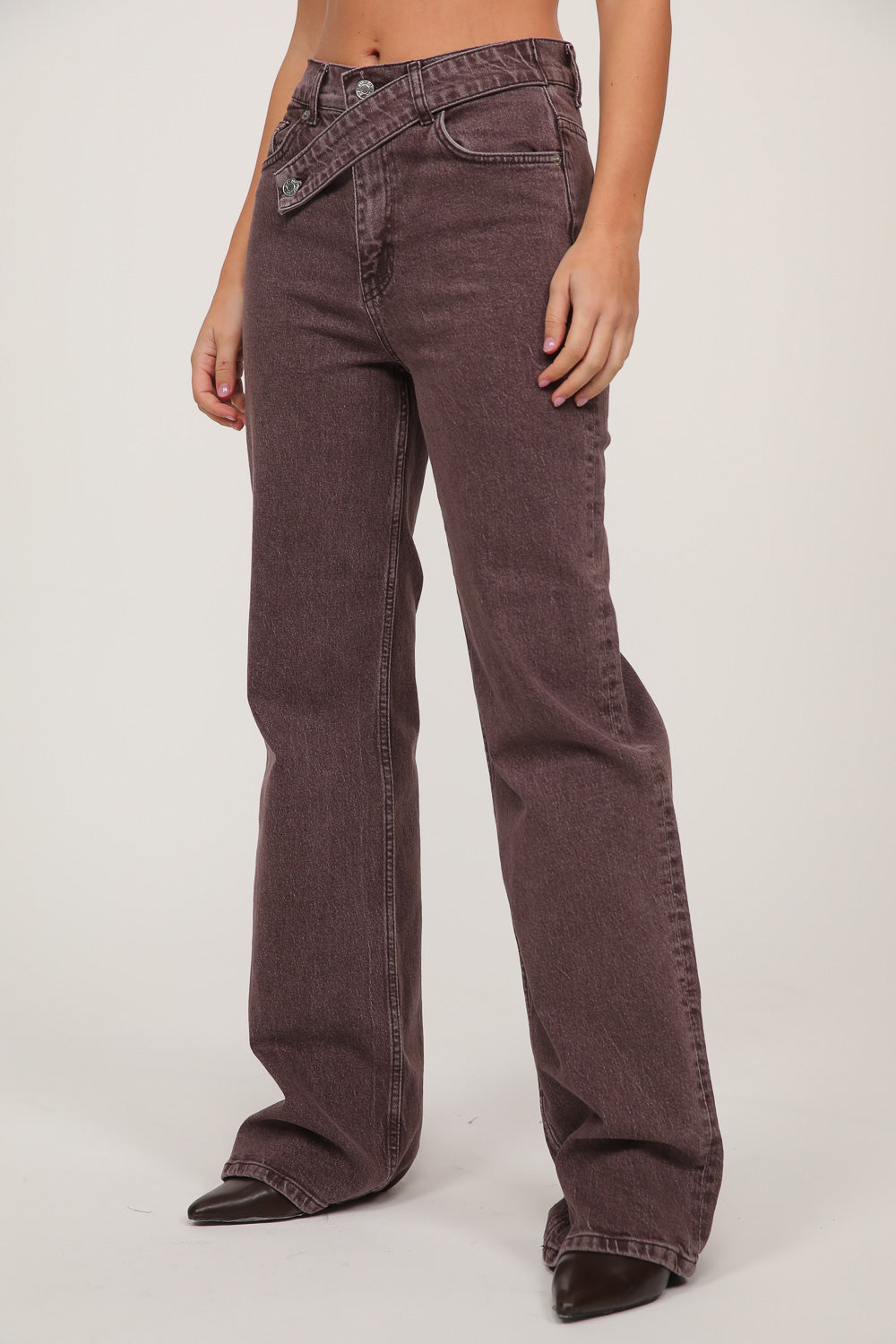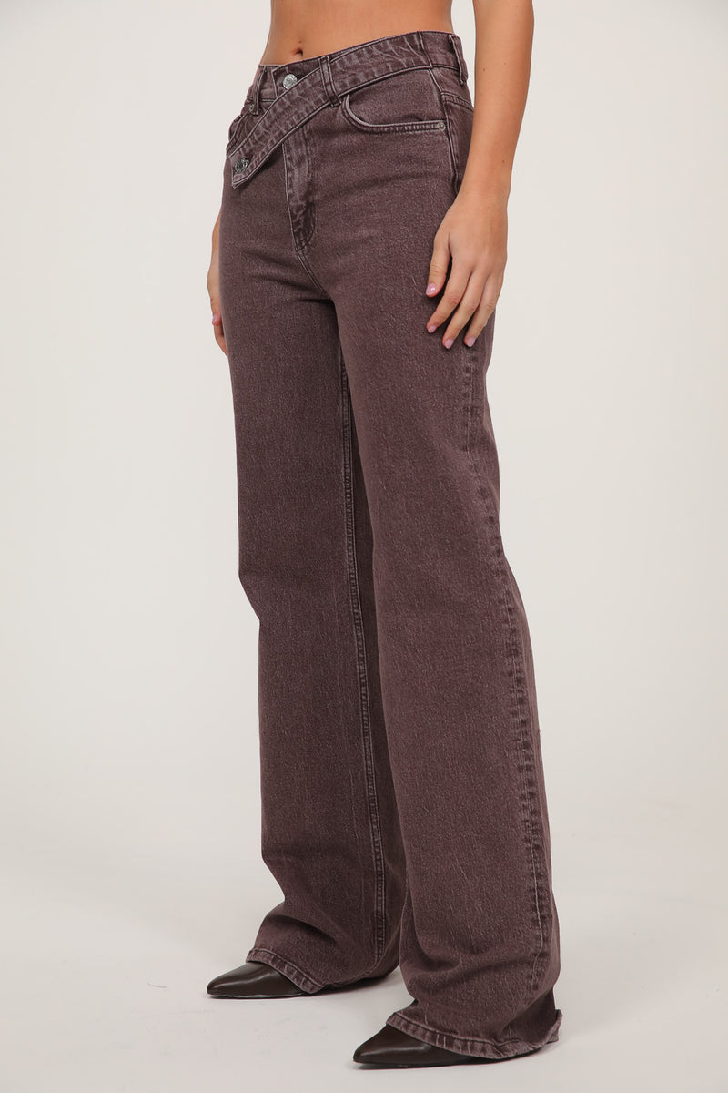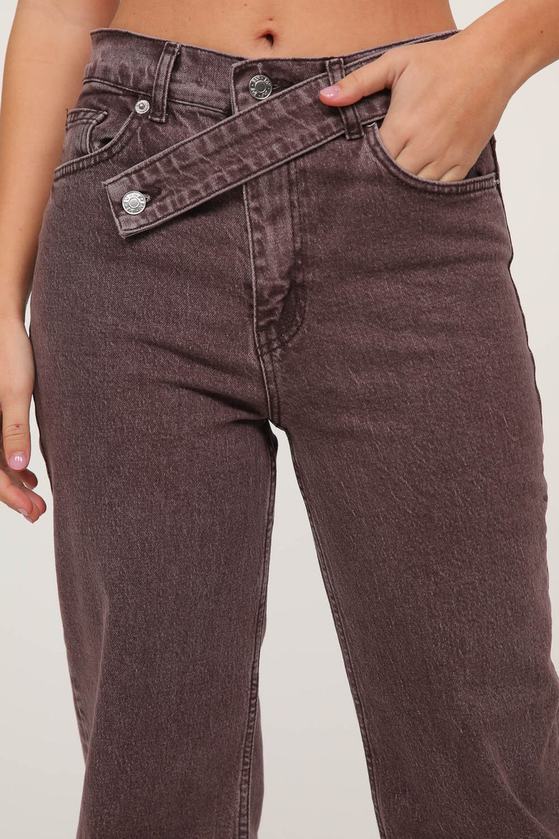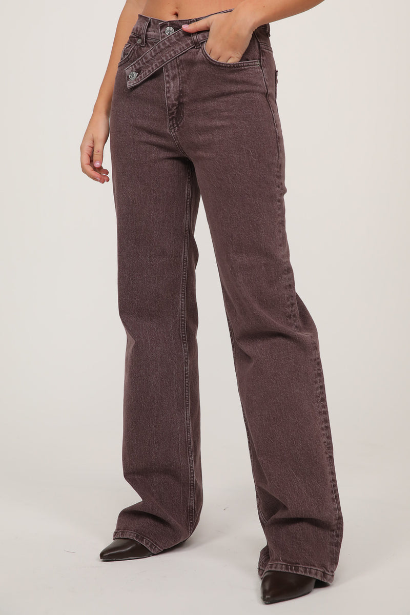 ג׳ינס בגזרה ישרה עם מותן בינונית ואלמנט עיצובי ייחודי באזור הסגירה.