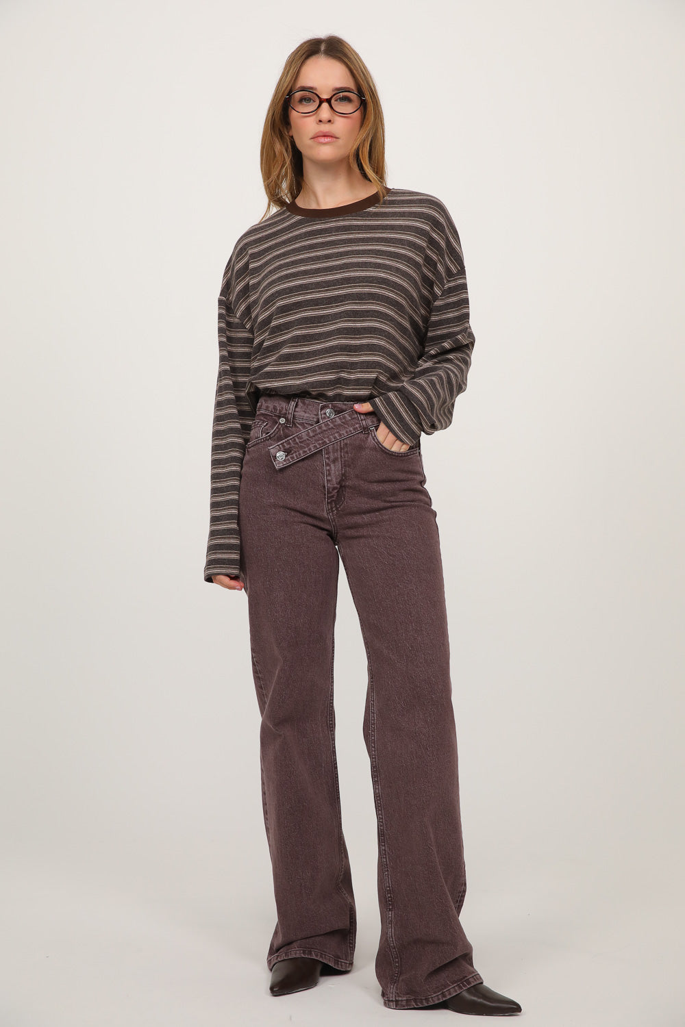 הדגם כולל רצועת בד אלכסונית עם כפתורי מתכת גלויים, שיוצרת מראה לא סימטרי ומוסיפה אופי וסטייל מודרני.