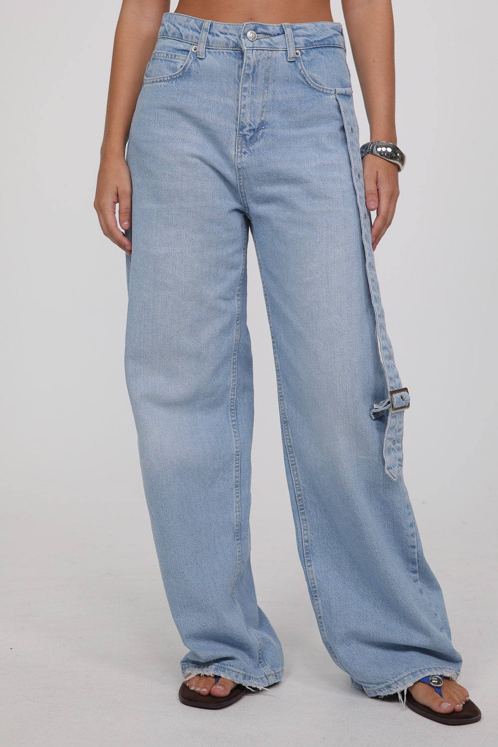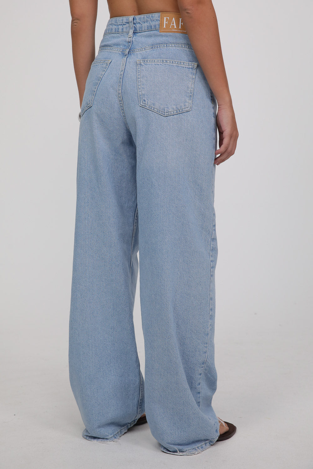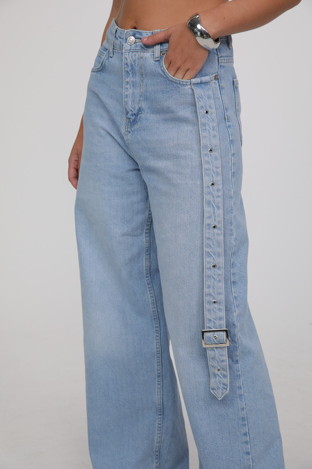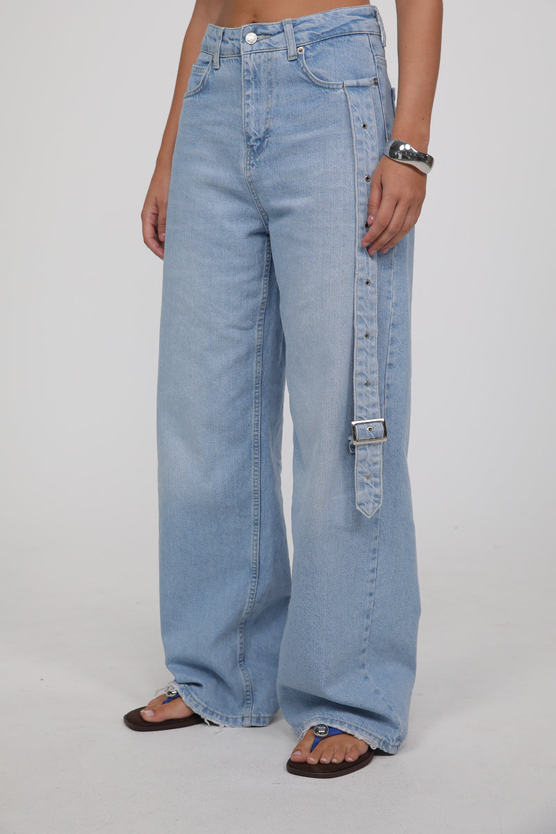 הג’ינס מגיע בגוון כחול בהיר עם שטיפה רכה, בגזרה גבוהה ונשפכת שמאריכה את הרגל ויוצרת סילואט מחמיאה.