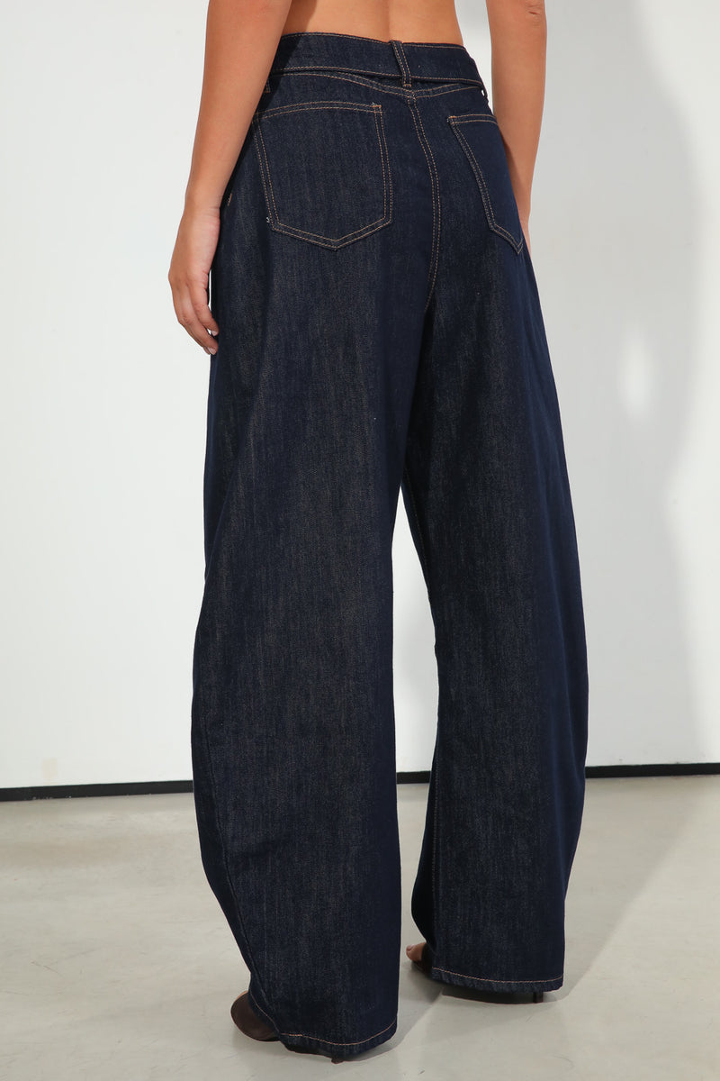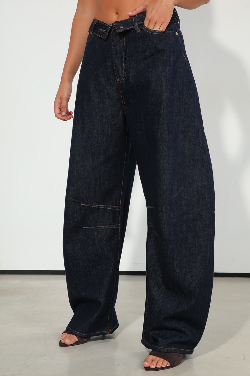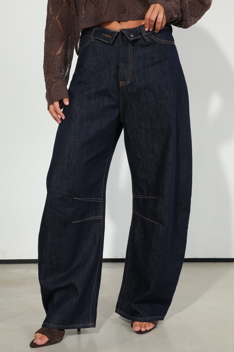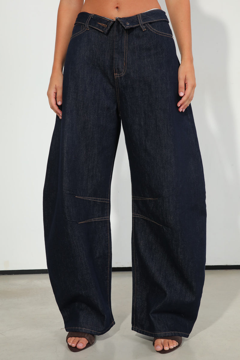 ג'ינס כהה בגזרת בלון עם מנג'ט מקופל במותן לתוספת דיטיילס,