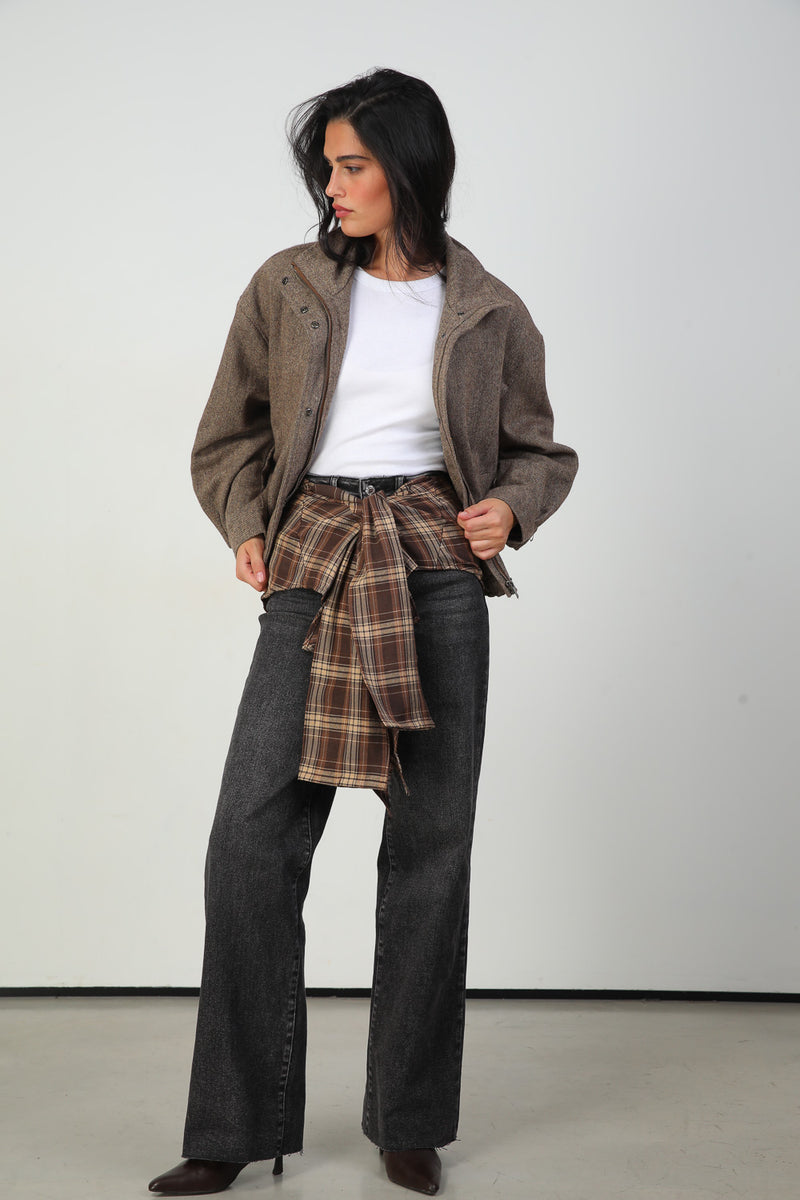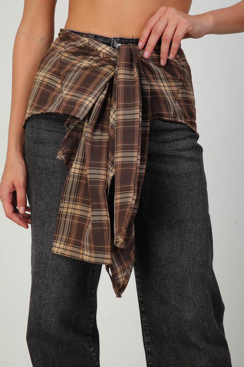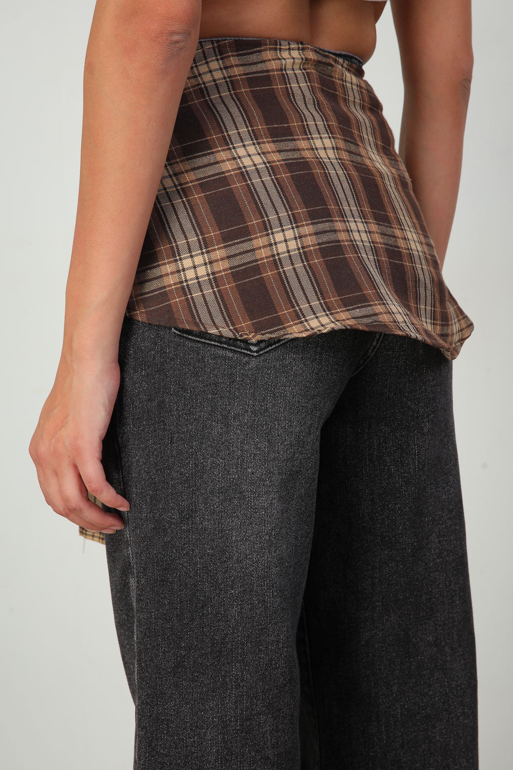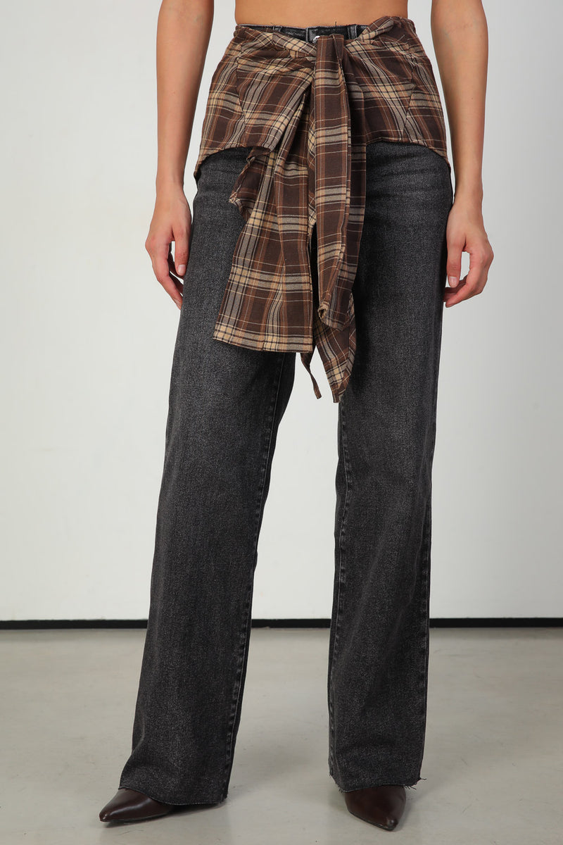 ג'ינס כהה בגזרה ישרה בשילוב בשילוב מטפחת משבצות לקשירה סביב המותן,