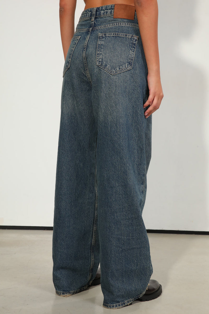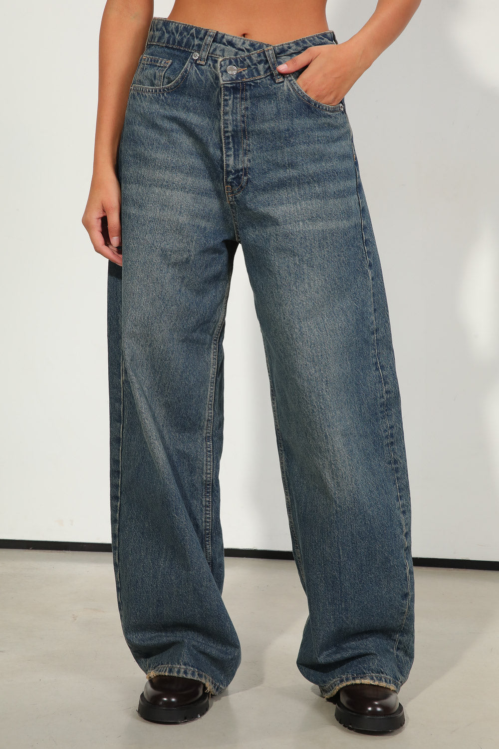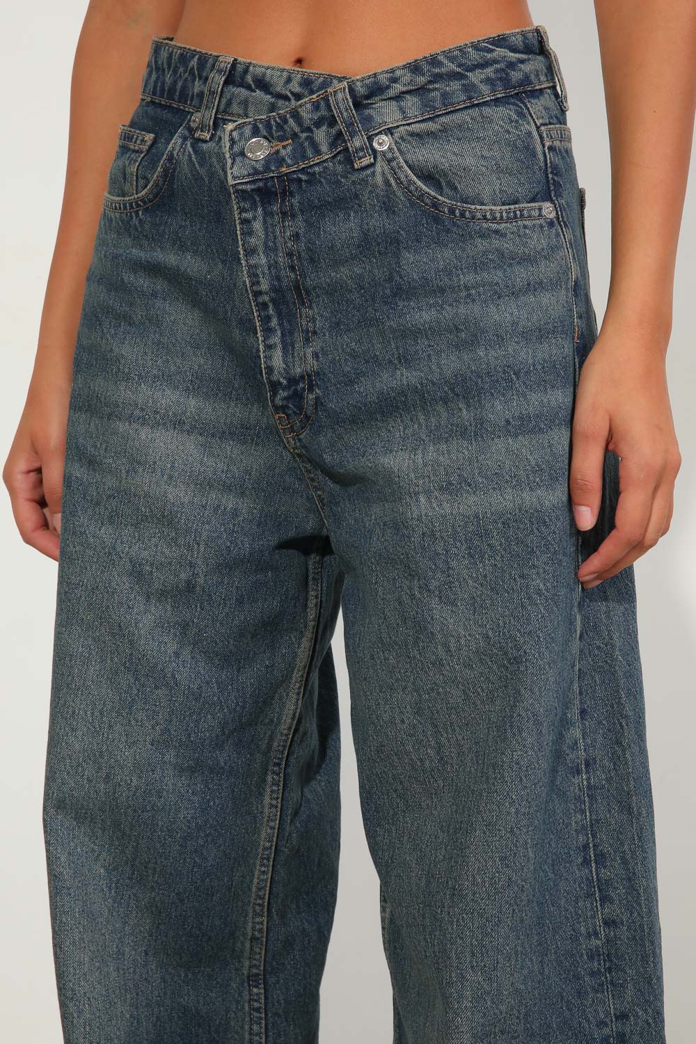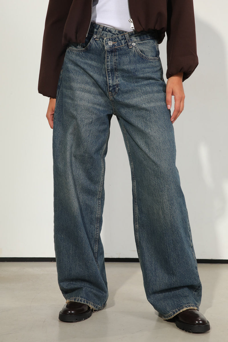 ג'ינס משופשף בגזרה רחבה עם סגירה אלכסונית,