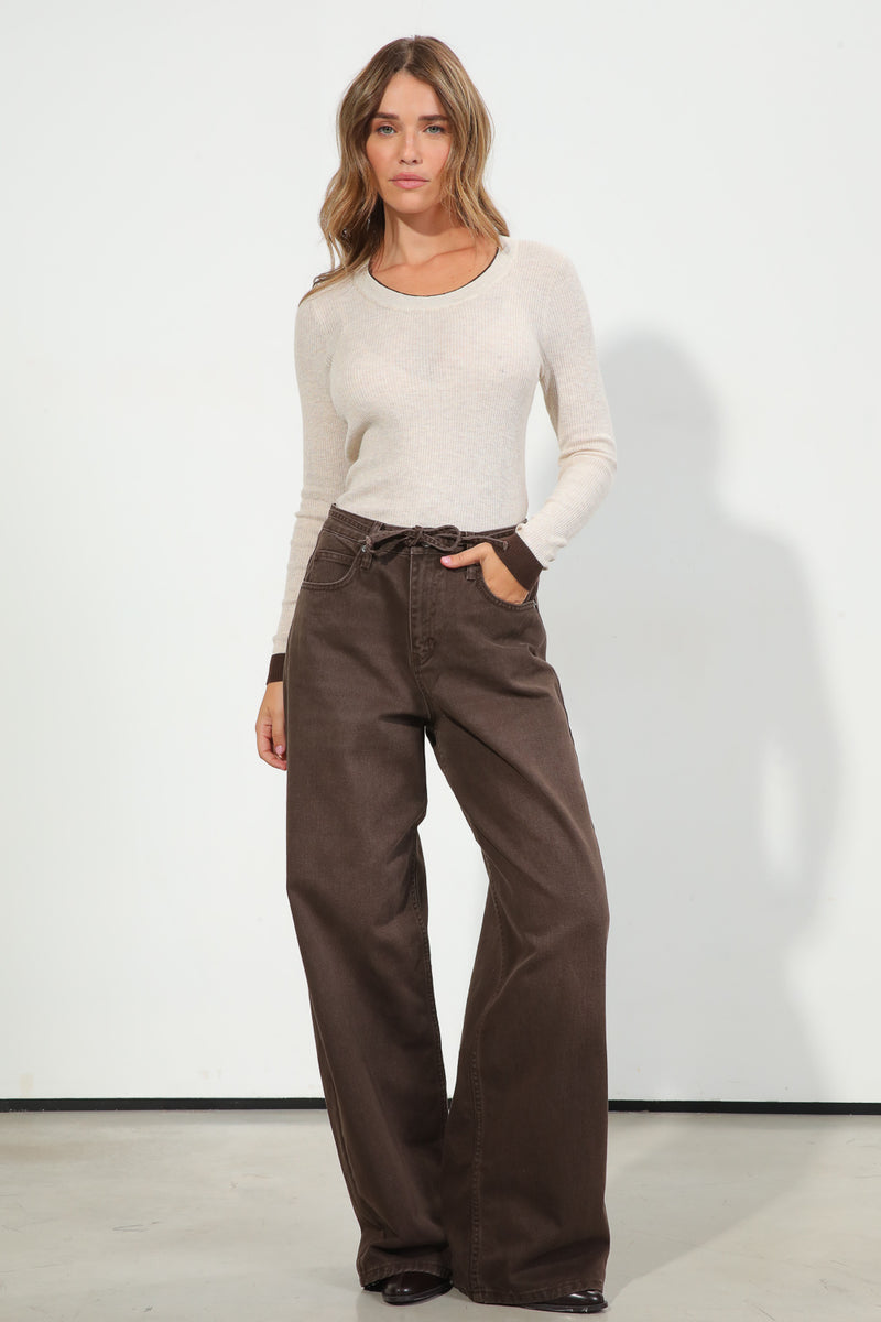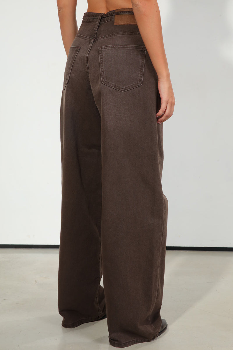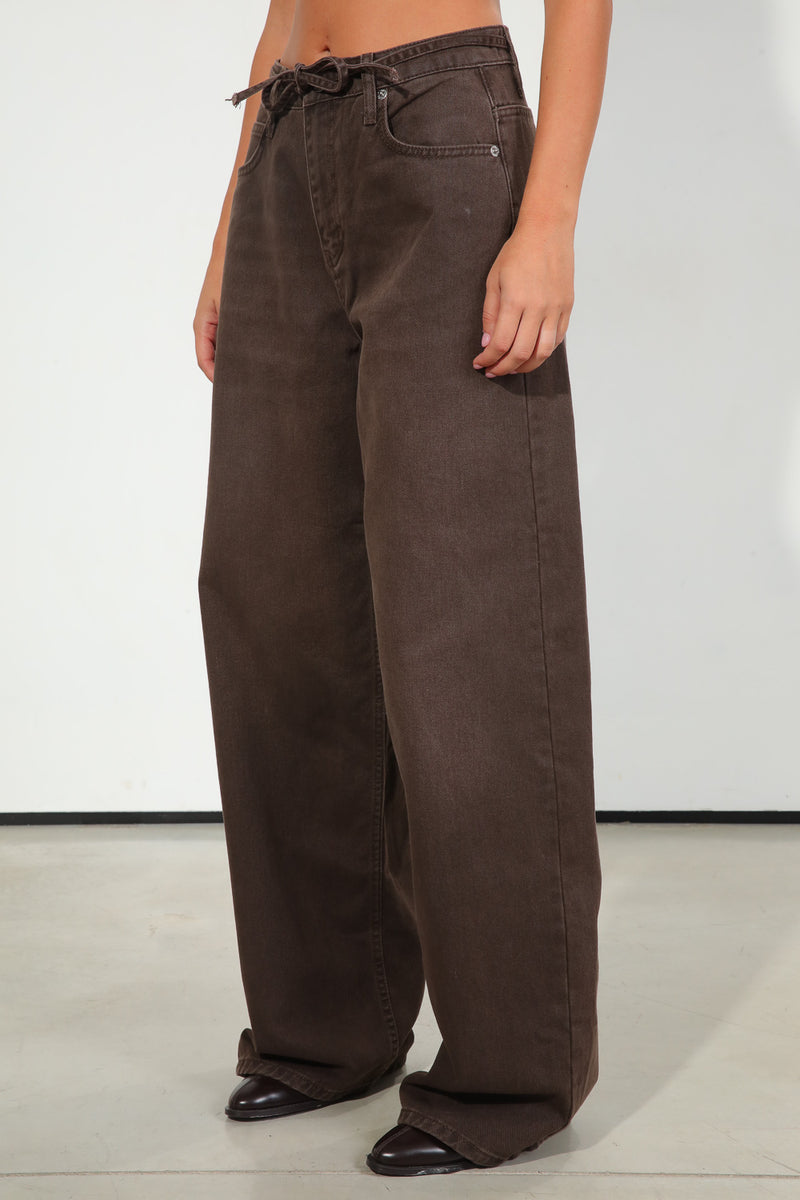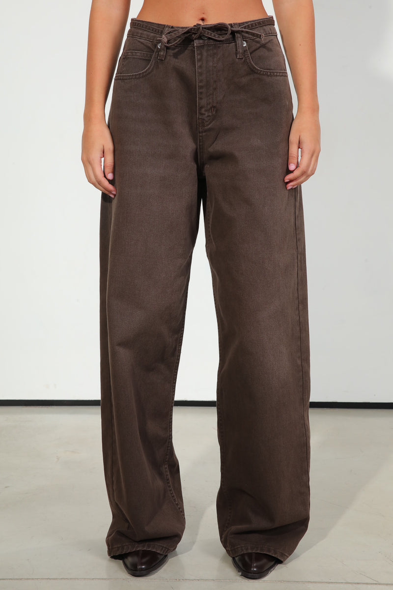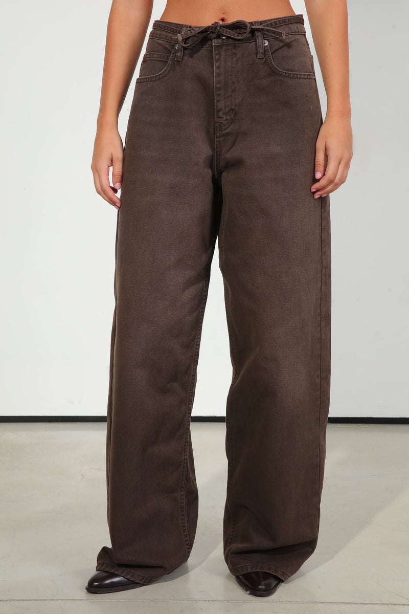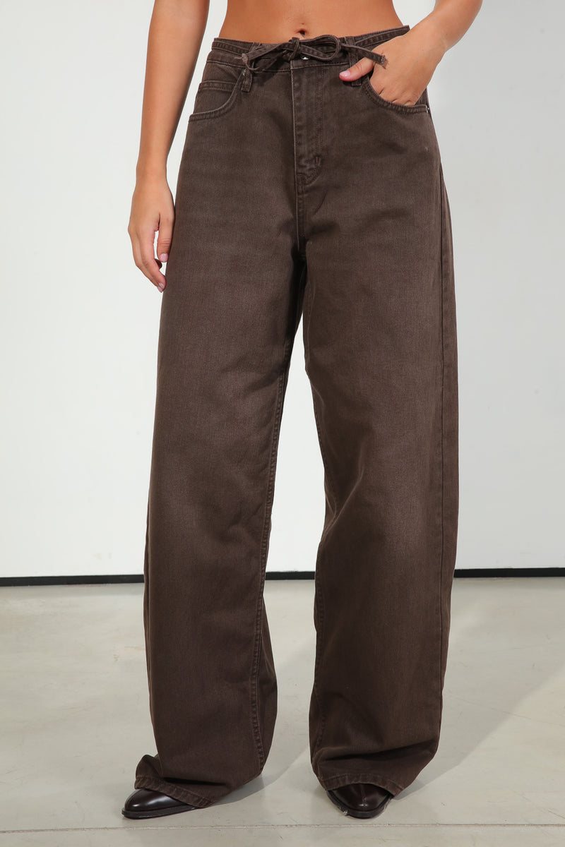 ג'ינס בגוון חום כהה, בגזרה רחבה עם שרוך קשירה במותן,