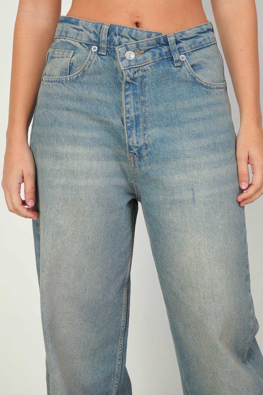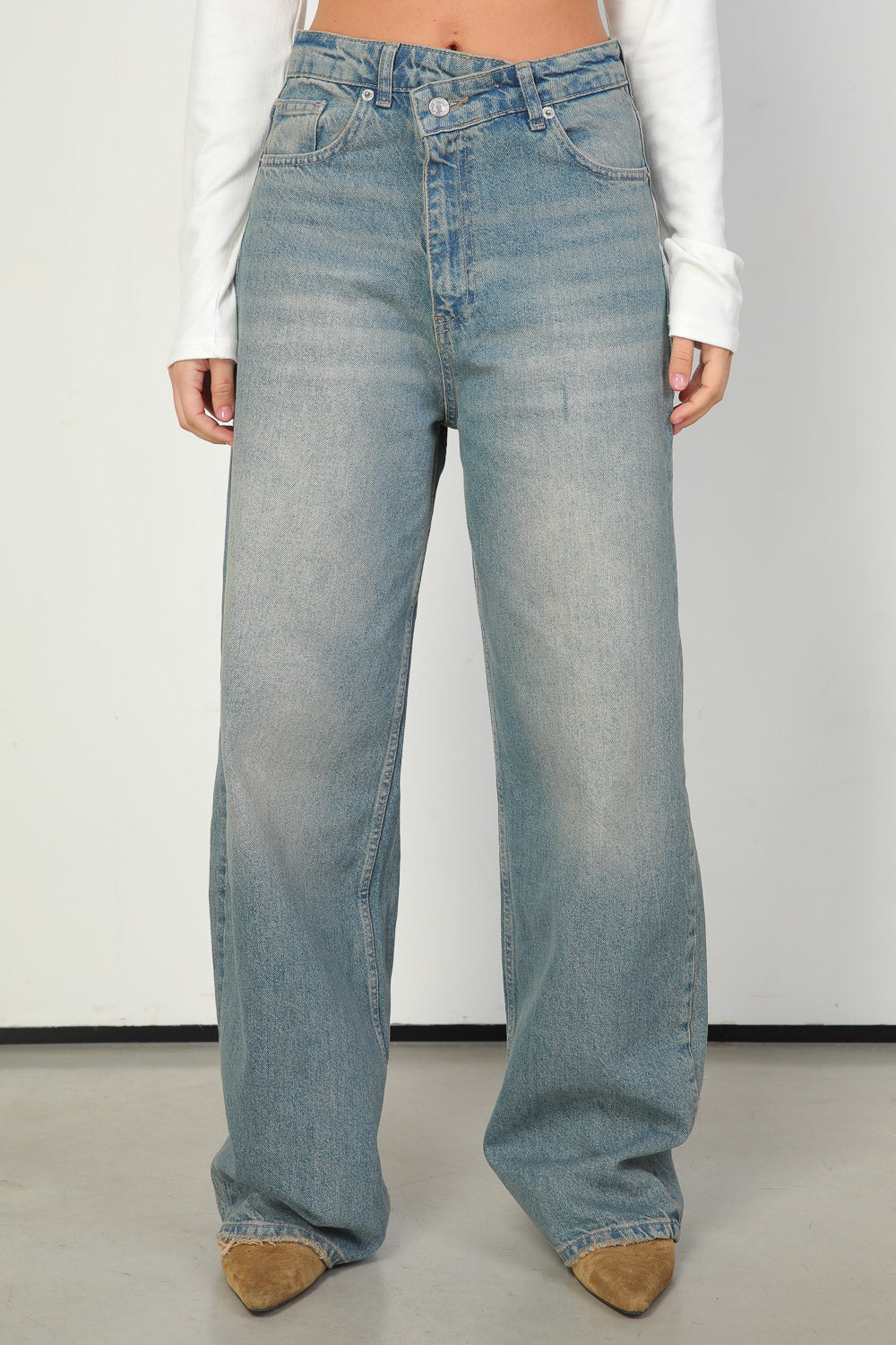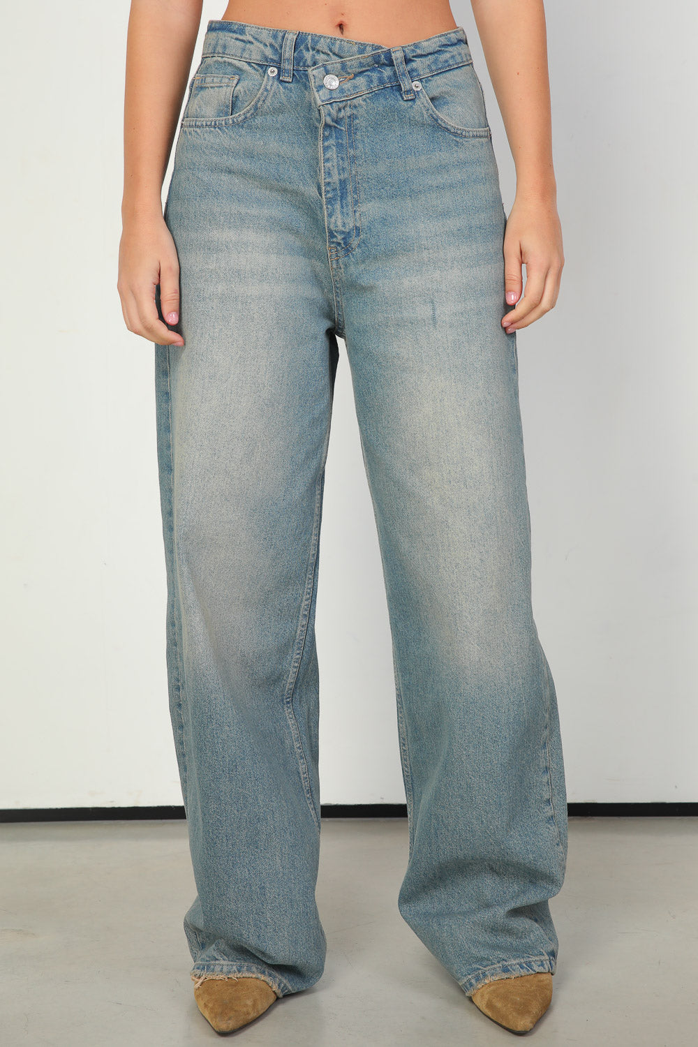 ג'ינס משופשף בגזרה רחבה עם סגירת כפתור אלכסונית.