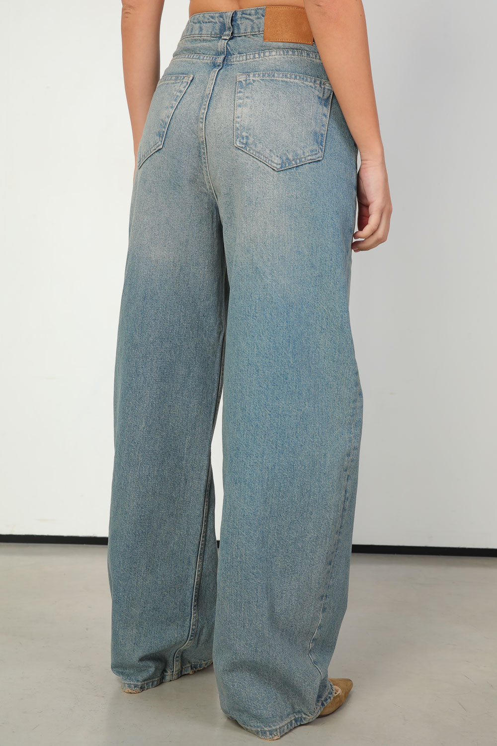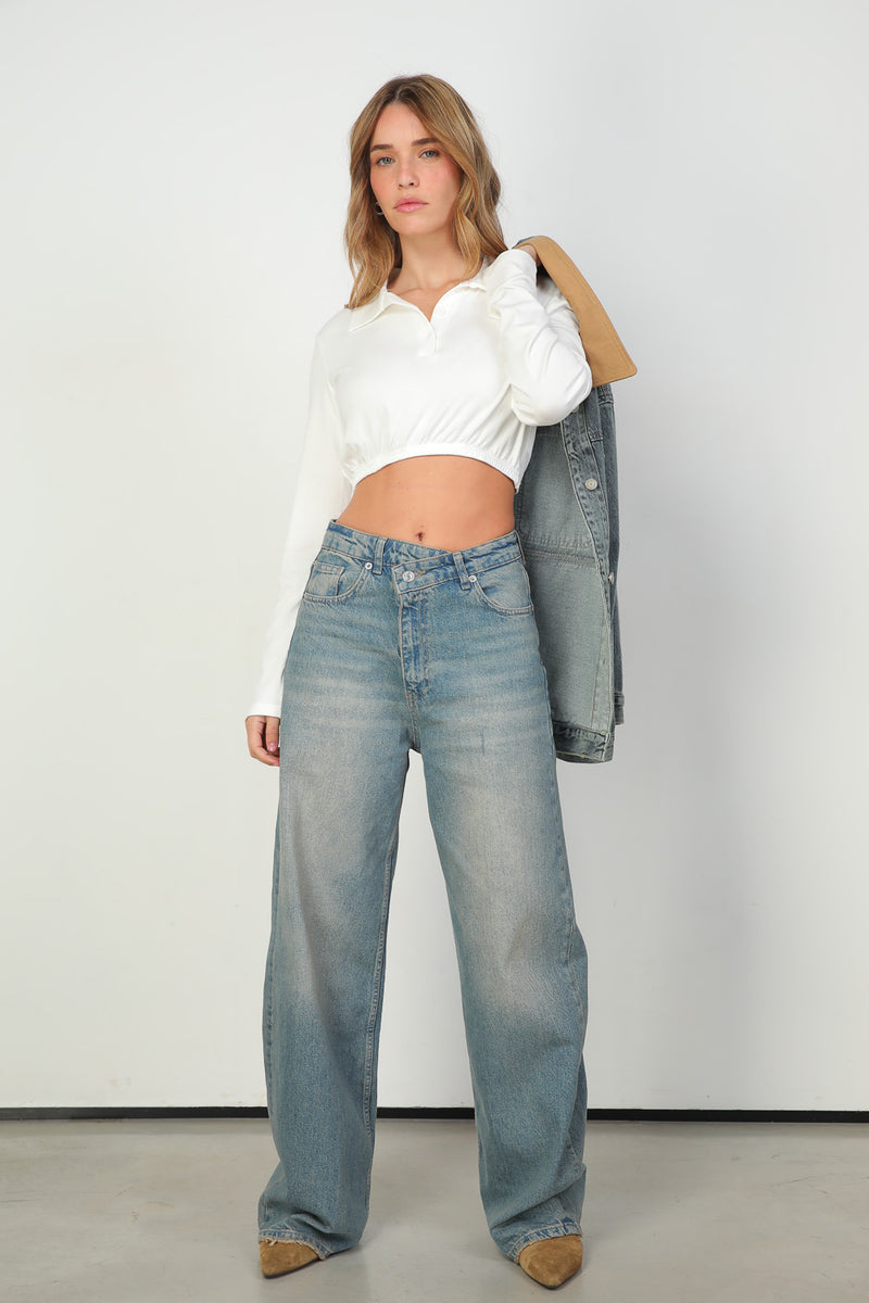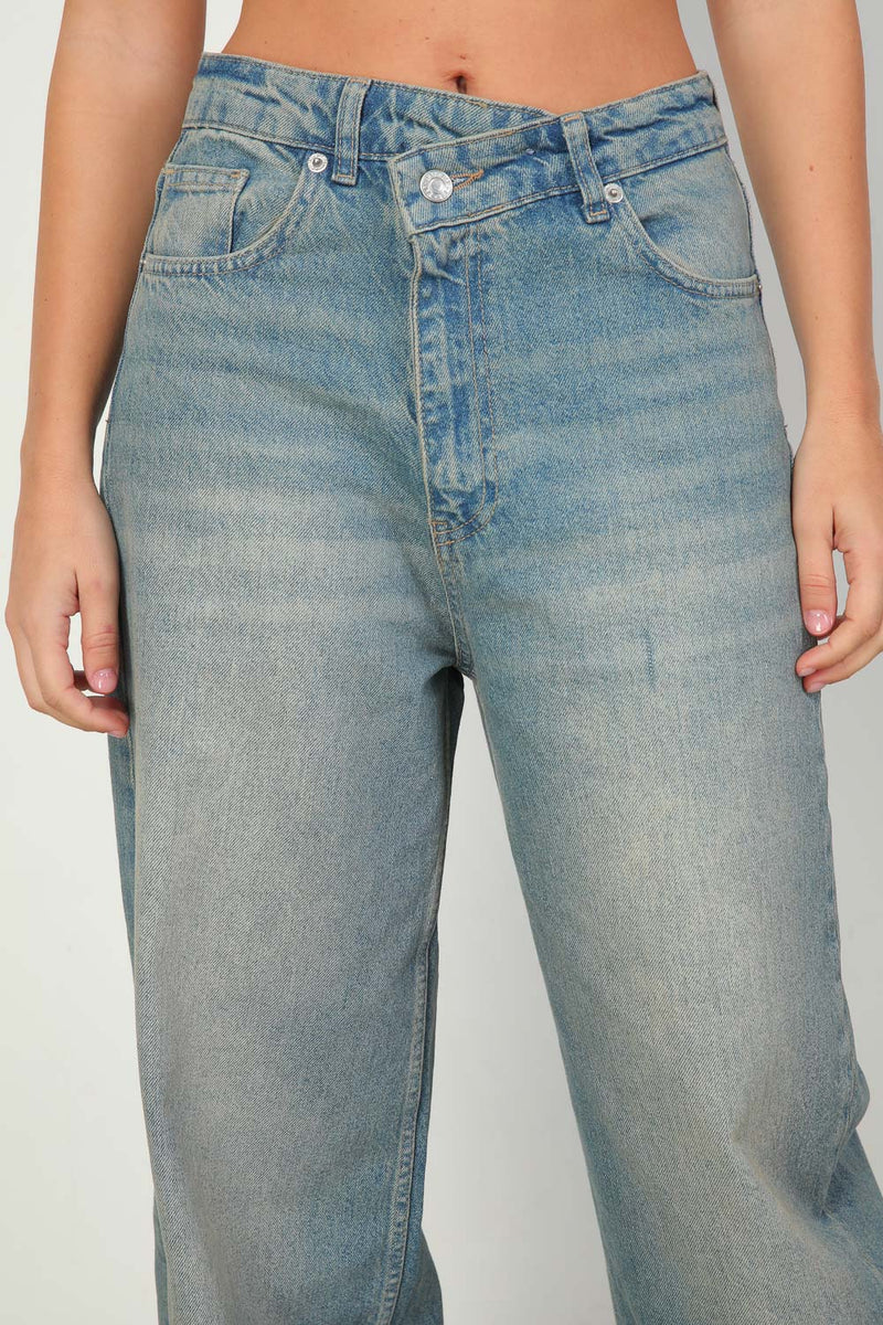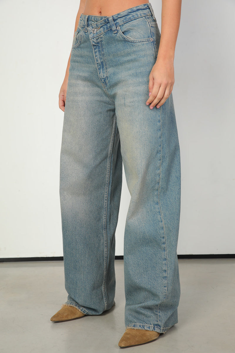ג'ינס משופשף בגזרה רחבה עם סגירת כפתור אלכסונית.