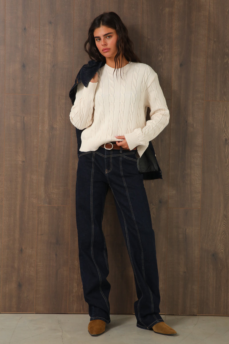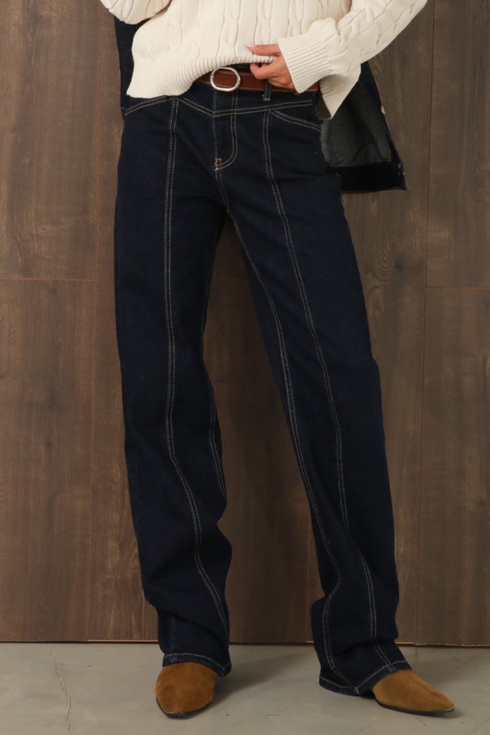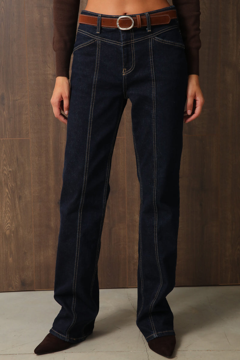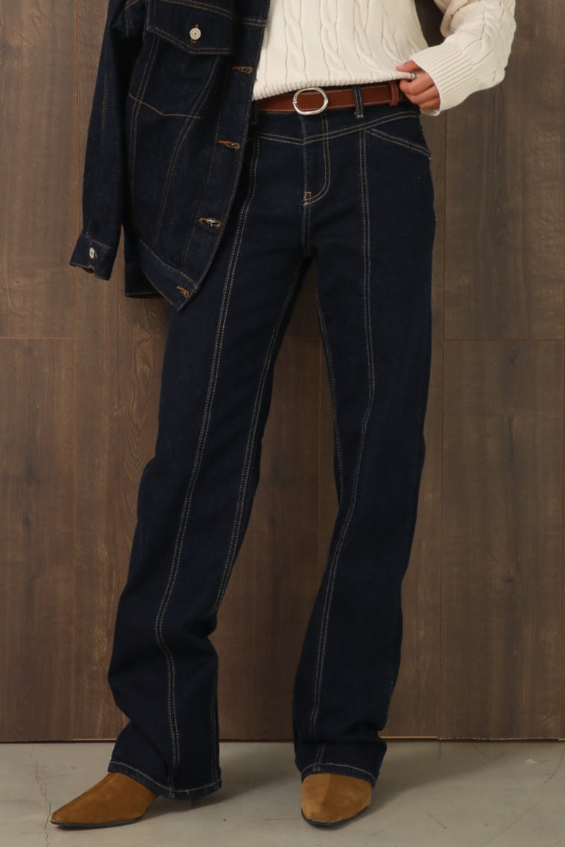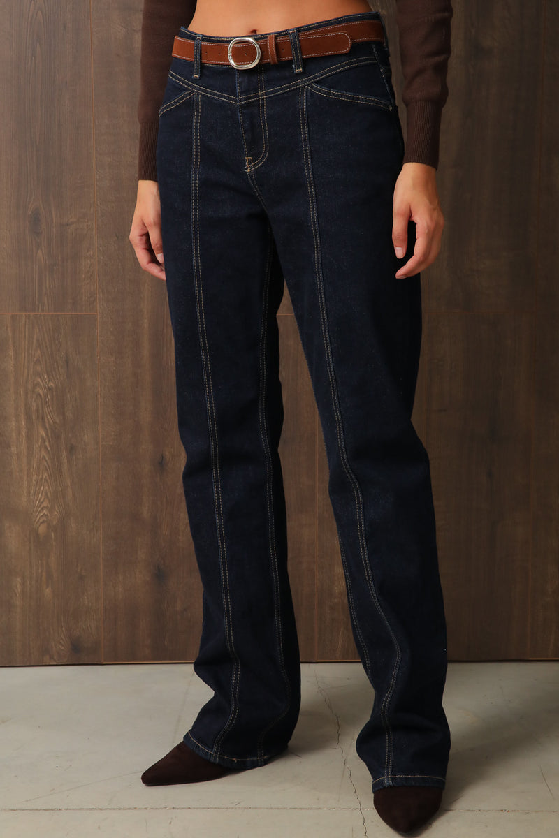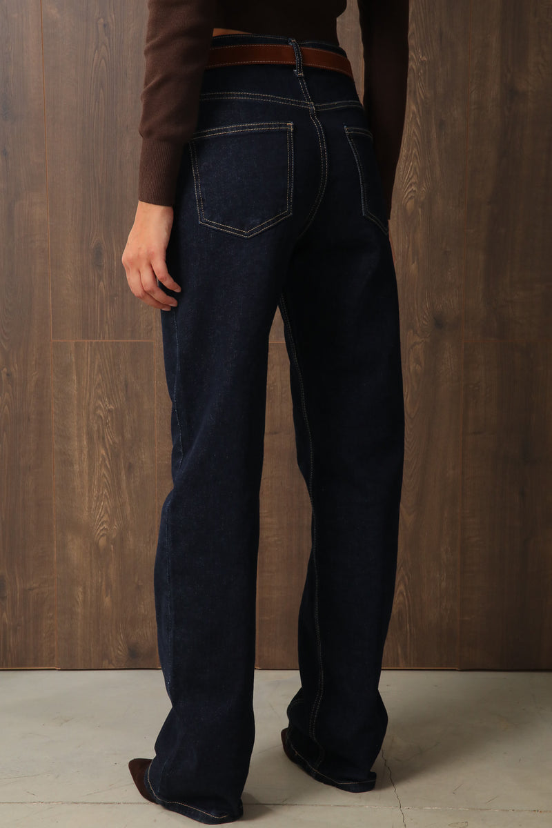 ג׳ינס בגזרה גבוהה ורחבה עם סילואטה מחמיאה ואלגנטית בשילוב חגורת דמוי ז'מש. עשוי מבד דנים איכותי בגוון כחול כהה, עם תפרים בהירים שמוסיפים ניגוד וסטייל עדכני. מתאים לשילוב עם חולצה קלאסית או ג׳קט עור למראה ערב אורבני ונקי.