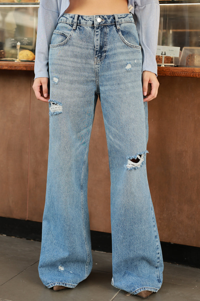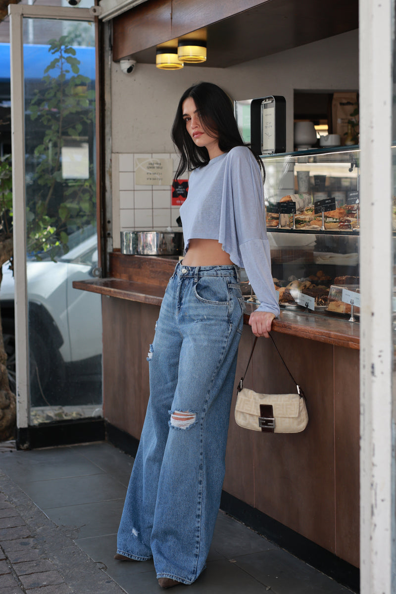 עשוי דנים כחול בהיר עם שטיפה טבעית ואפקט וינטג’, כולל הבהרות עדינות לאורך הרגל וקרעים מדודים המוסיפים אופי אורבני לא מתאמץ.