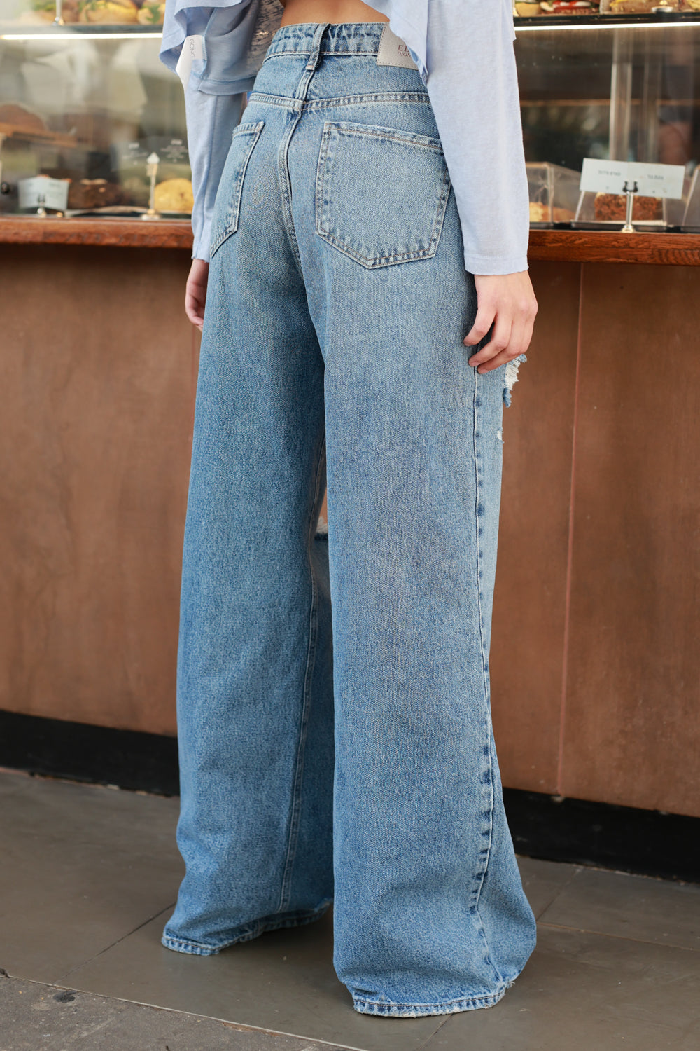 ג’ינס בגזרה רחבה עם מותן גבוהה מחמיאה ונינוחה,