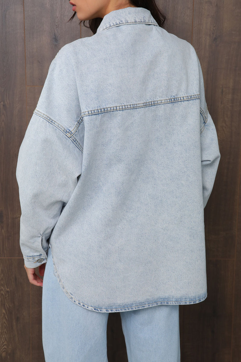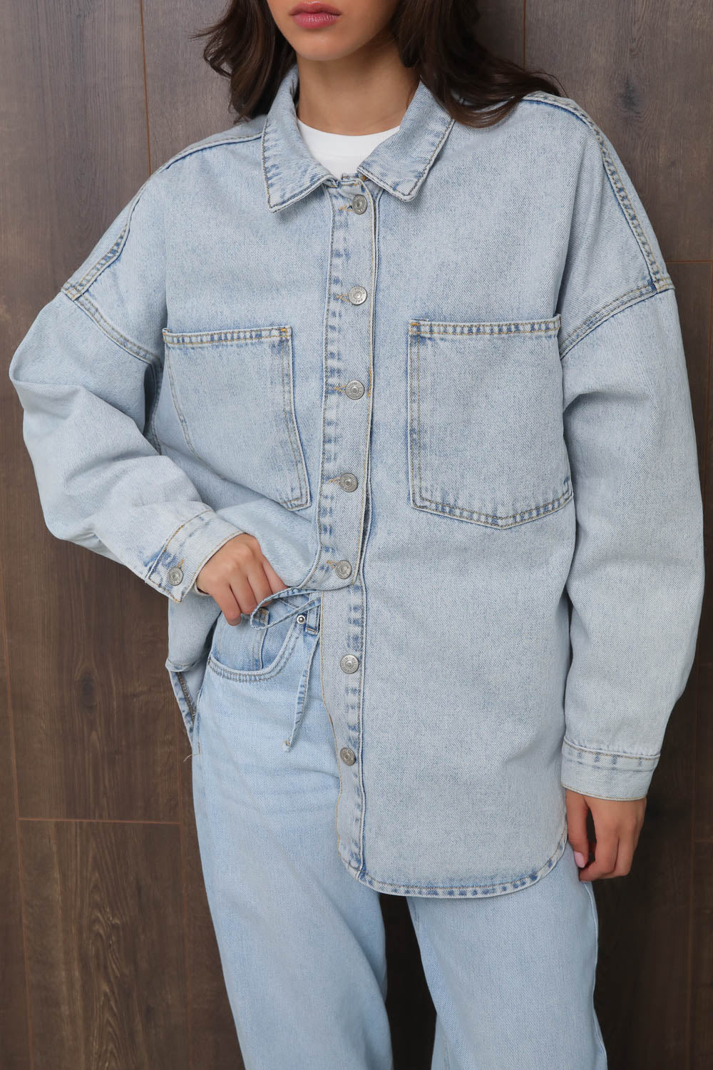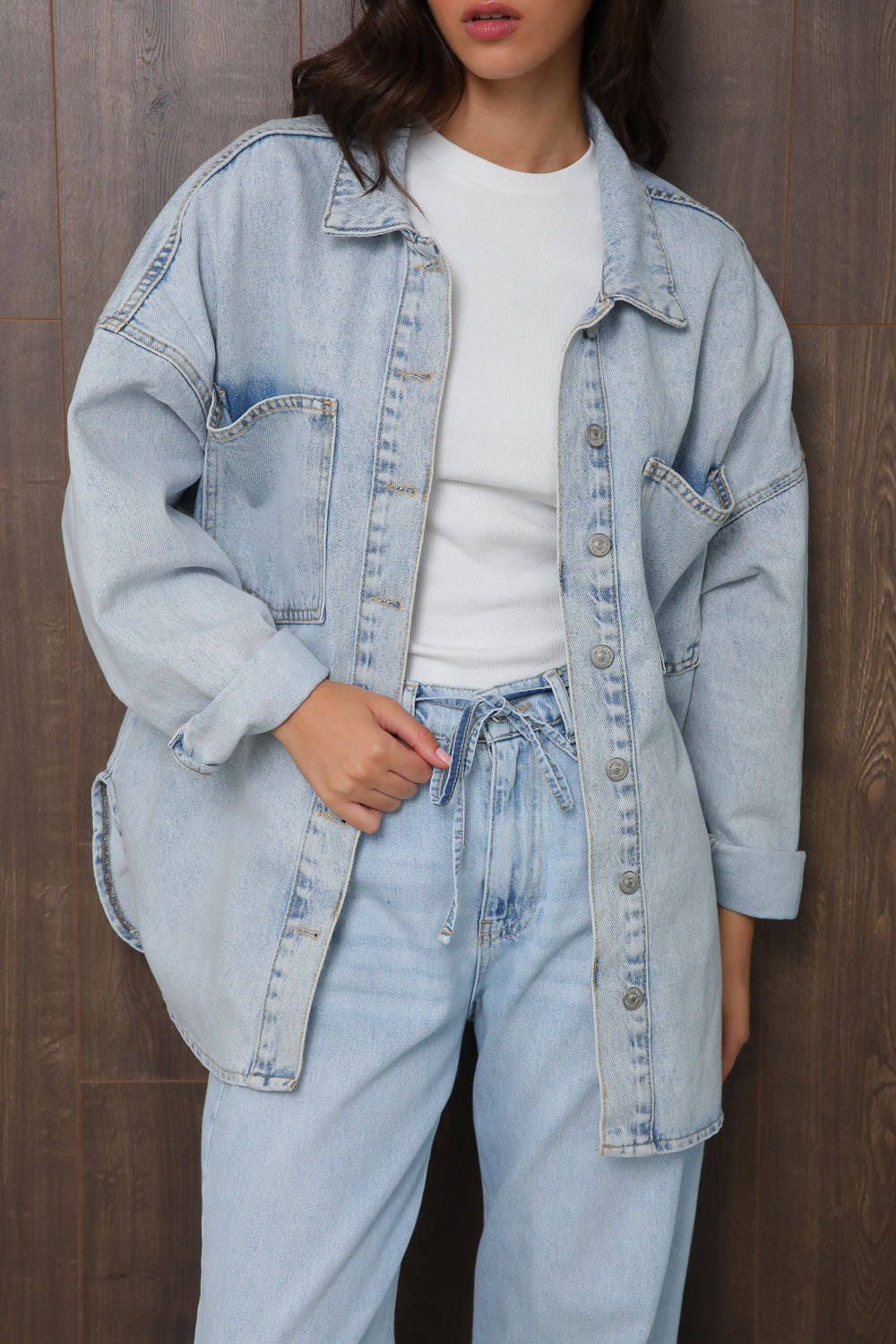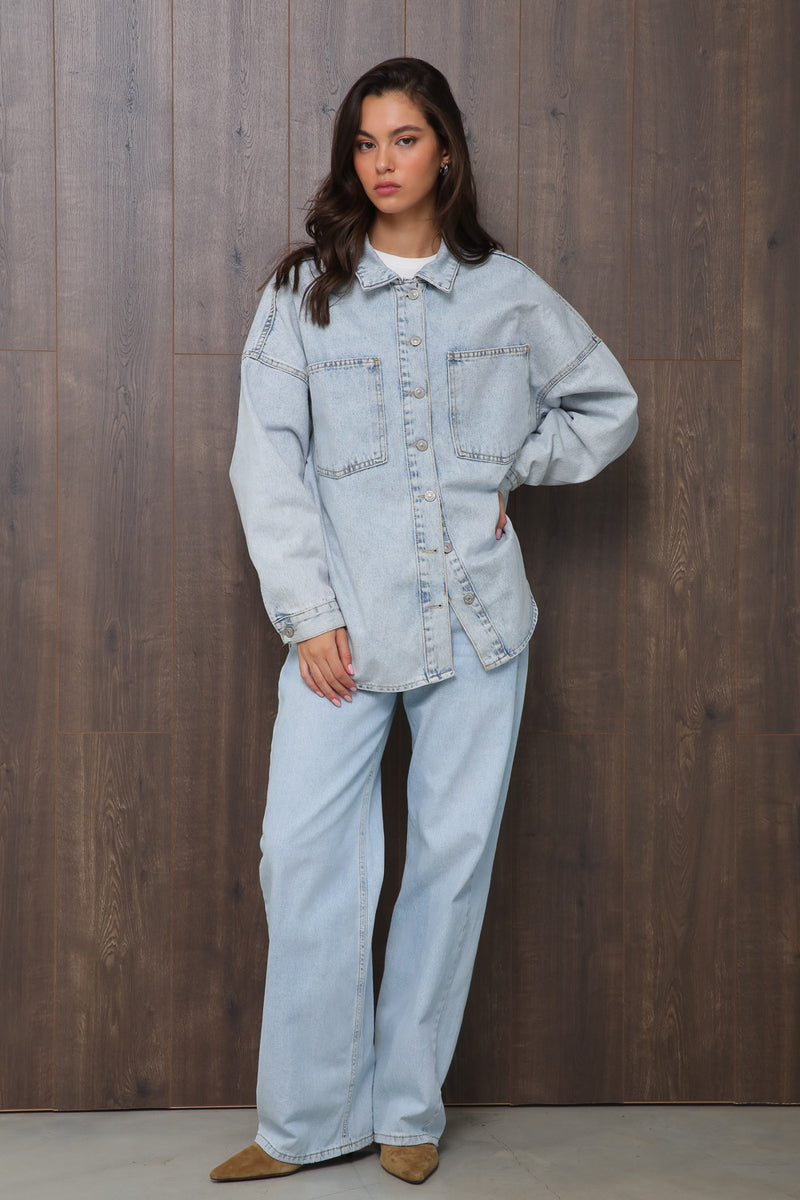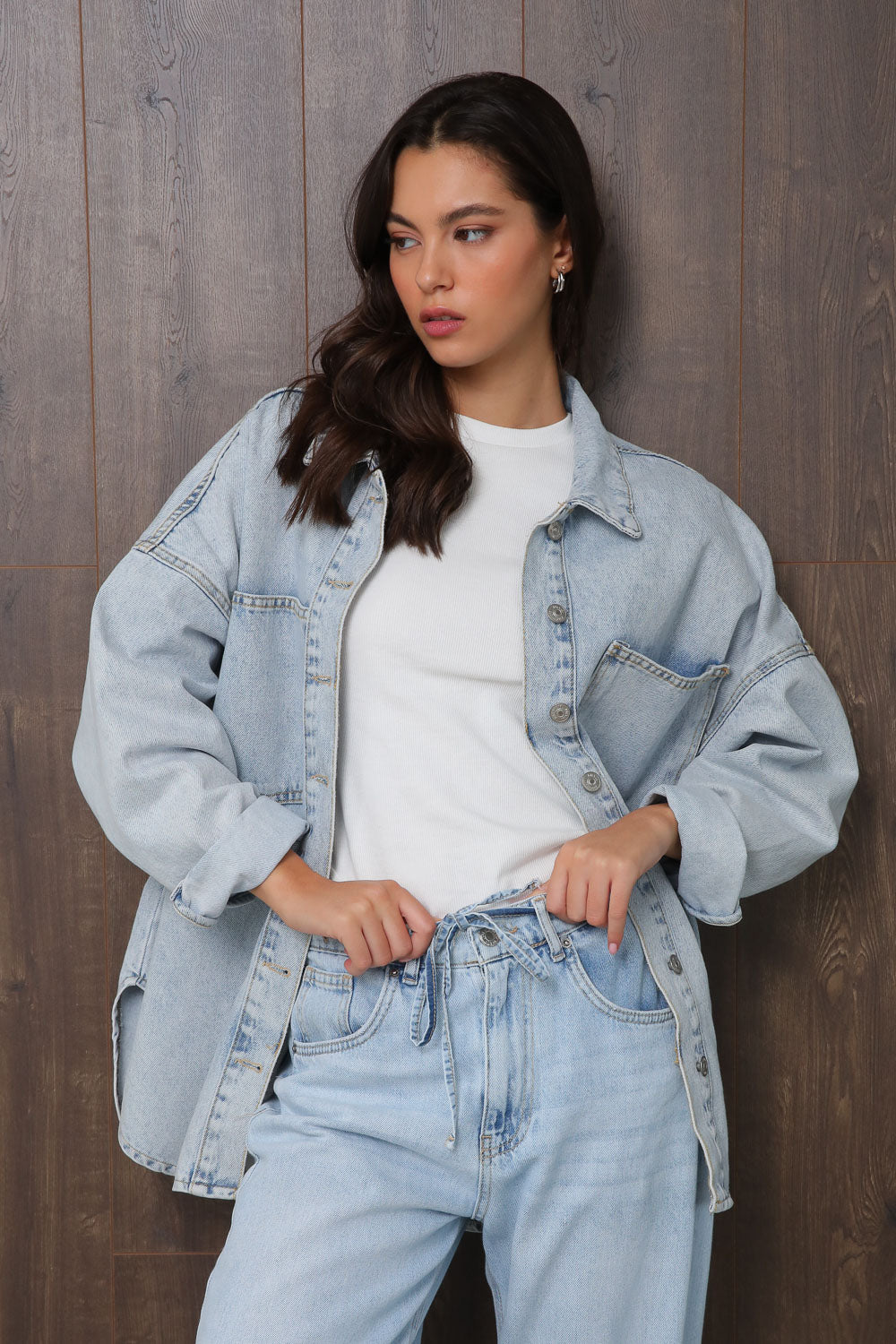 ג'קט ג'ינס משופשף בגזרת אוברסייז עם סגירת כפתורים וכיסים בחזית,