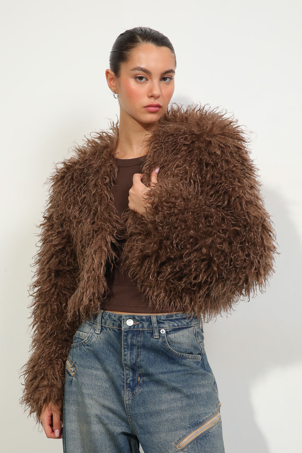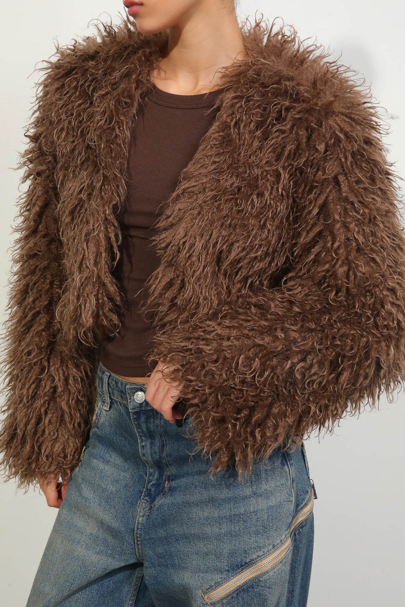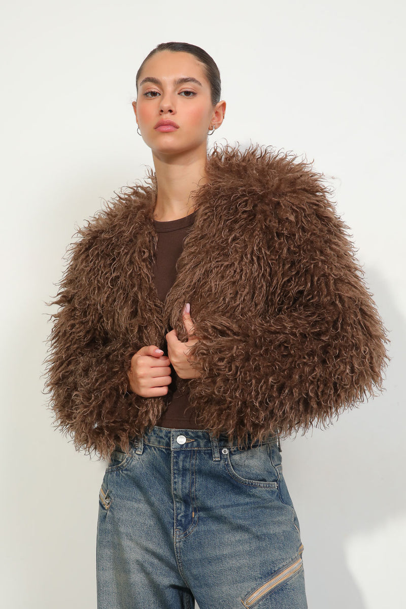הג׳קט שמכניס נוכחות בכל צעד. פרווה סינתטית רכה ומלאה נראות, עם טקסטורה עשירה שמעניקה מראה מחוספס ומחמיא. גזרת קרופ שמדגישה את הגוף ומתאימה גם ללוק יומיומי וגם לערב.