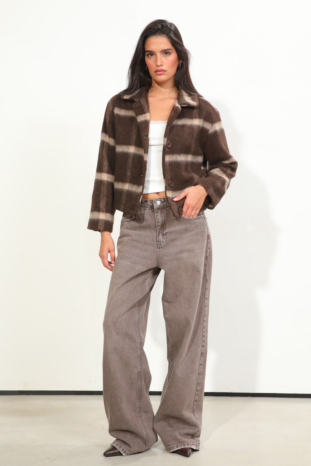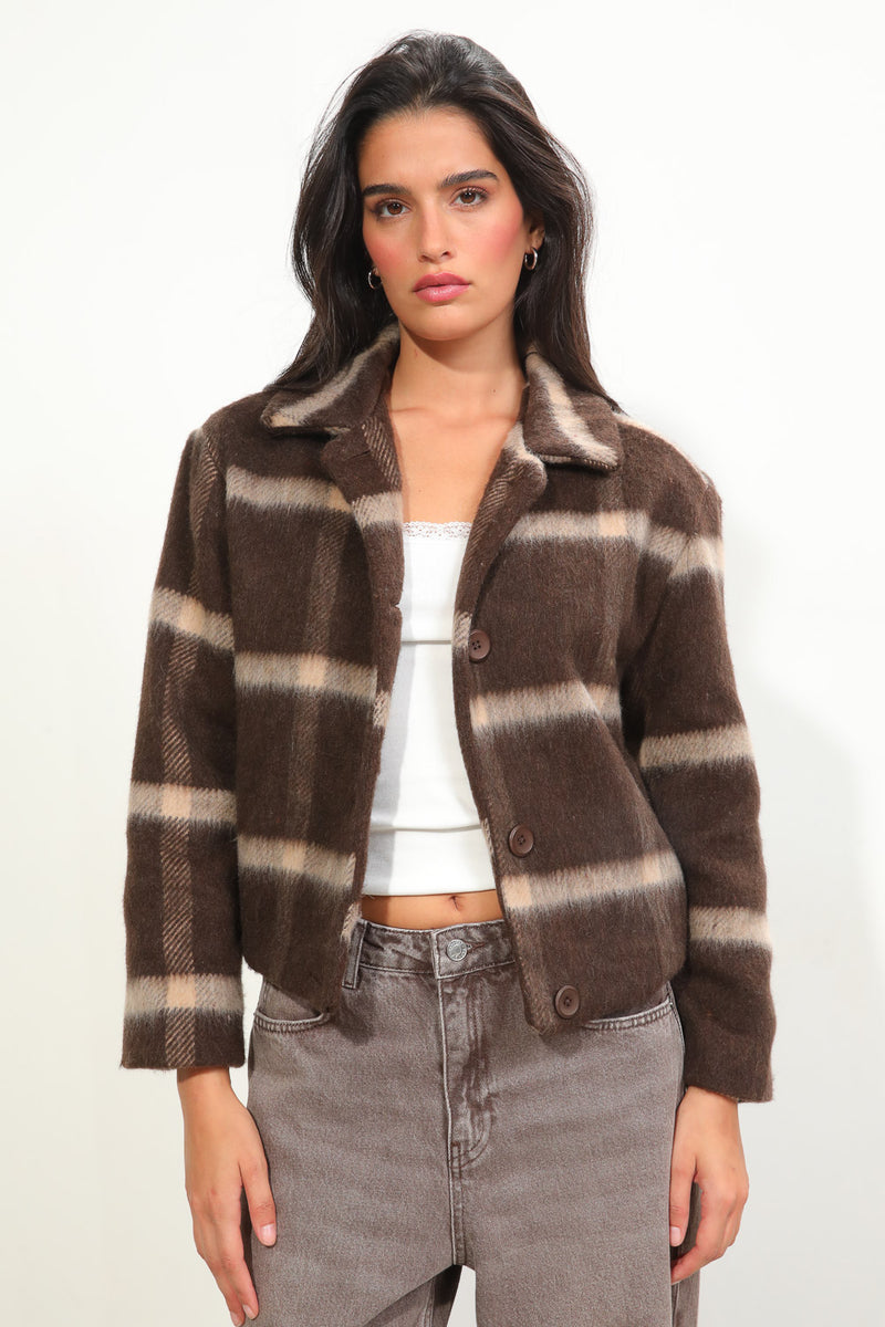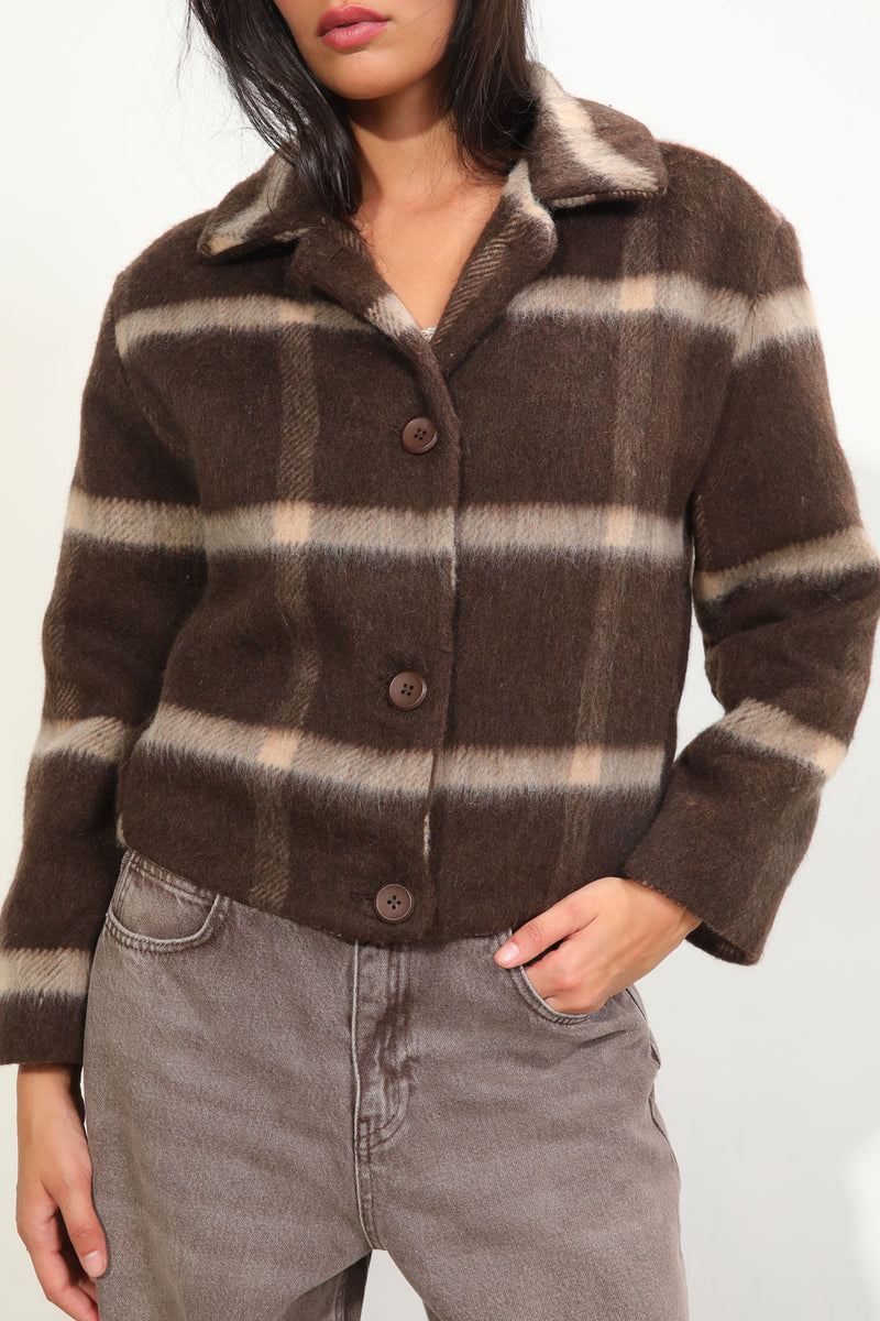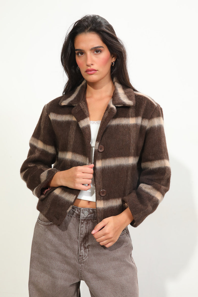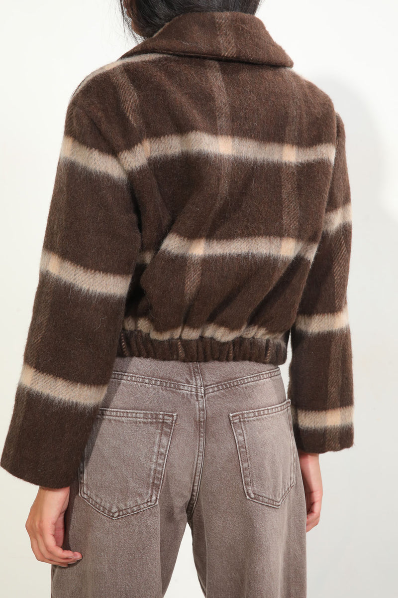 ג׳קט פליז רך וחמים בגזרת קרופ עם דוגמת פסים בגוונים חומים המשתלבים יחד למראה עדכני ומלא אופי.