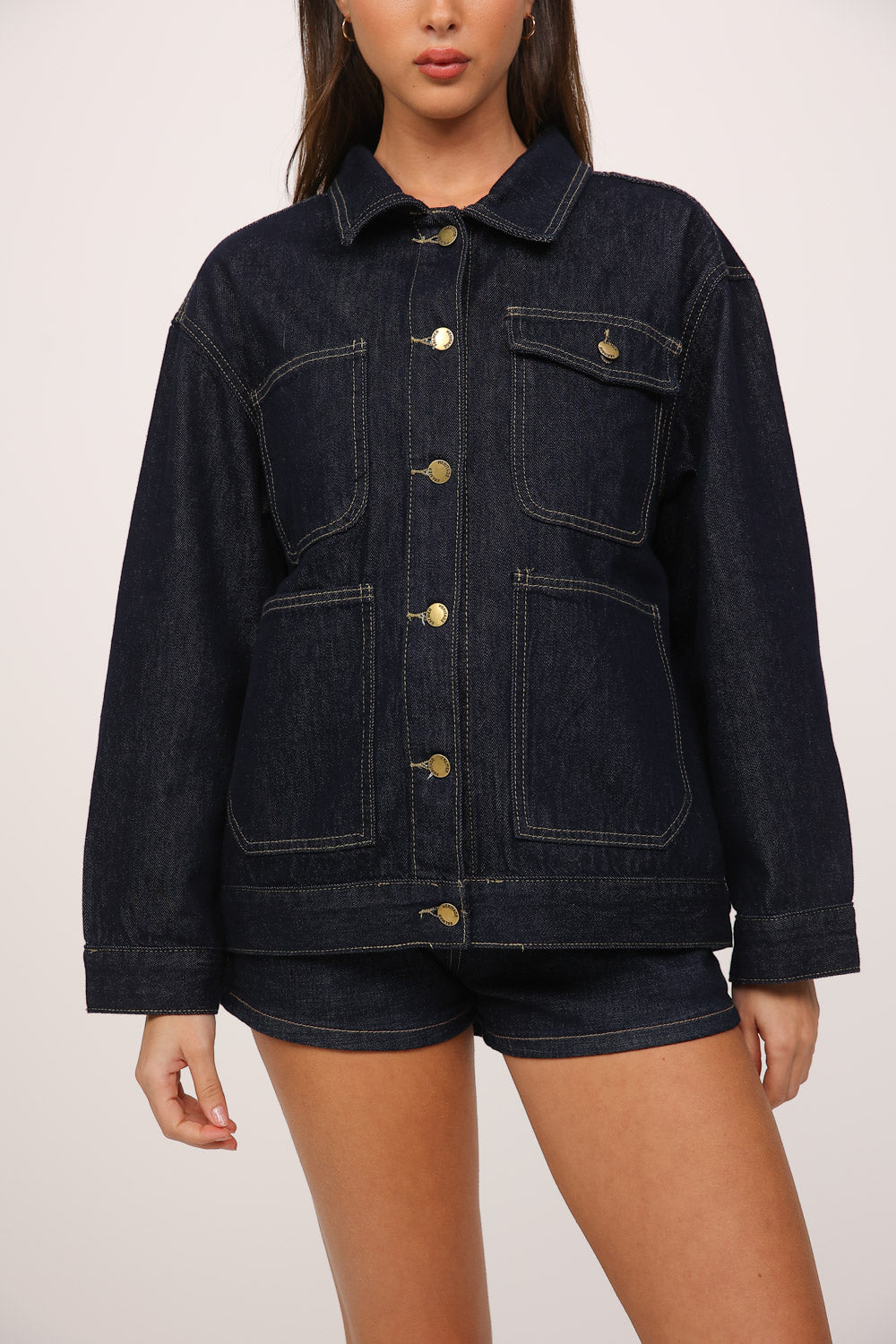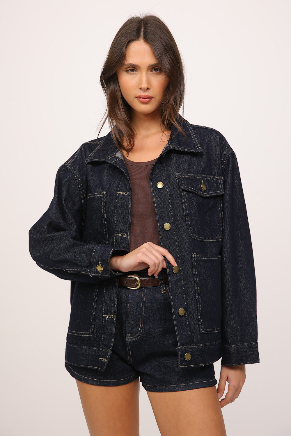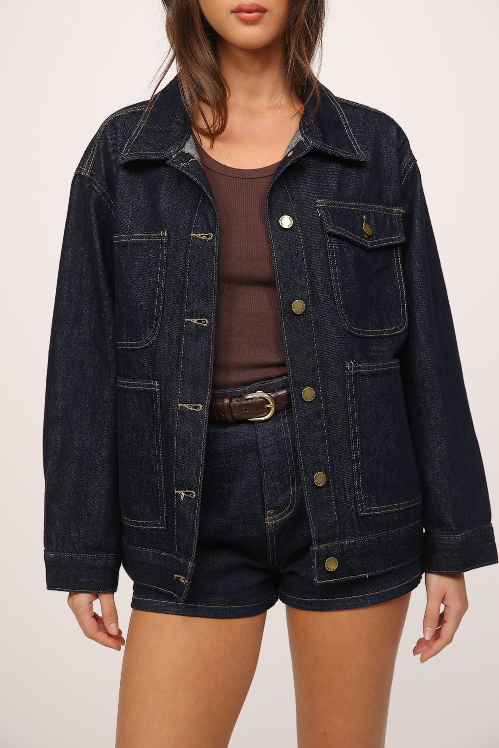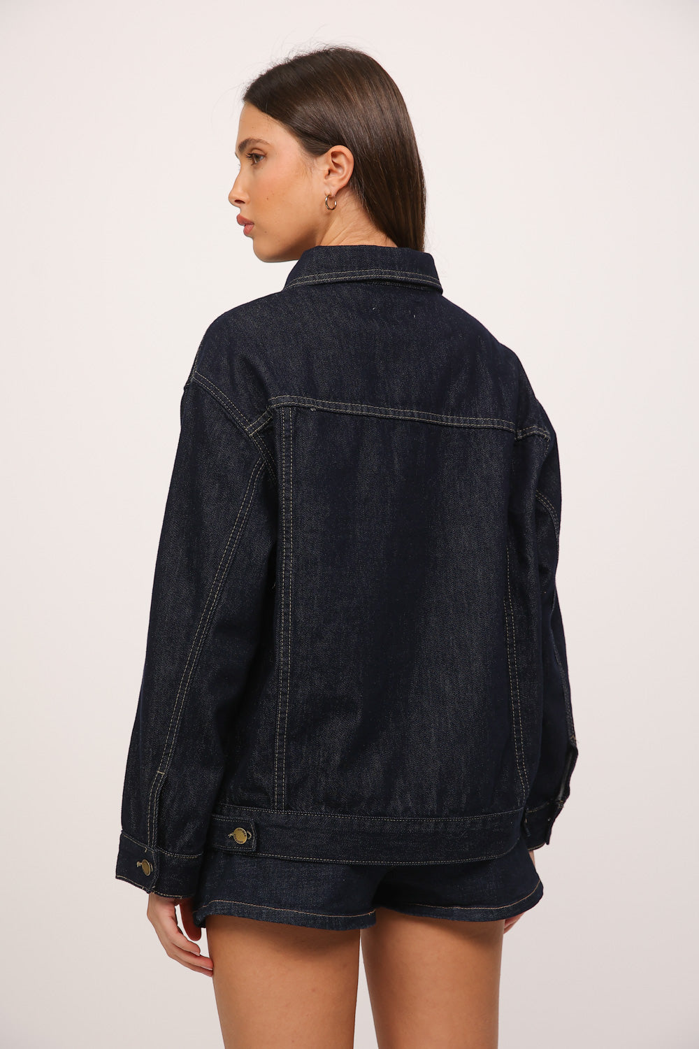 ג’קט ג’ינס בגזרה ישרה עם מראה מחוספס ונוכחות יומיומית חזקה.