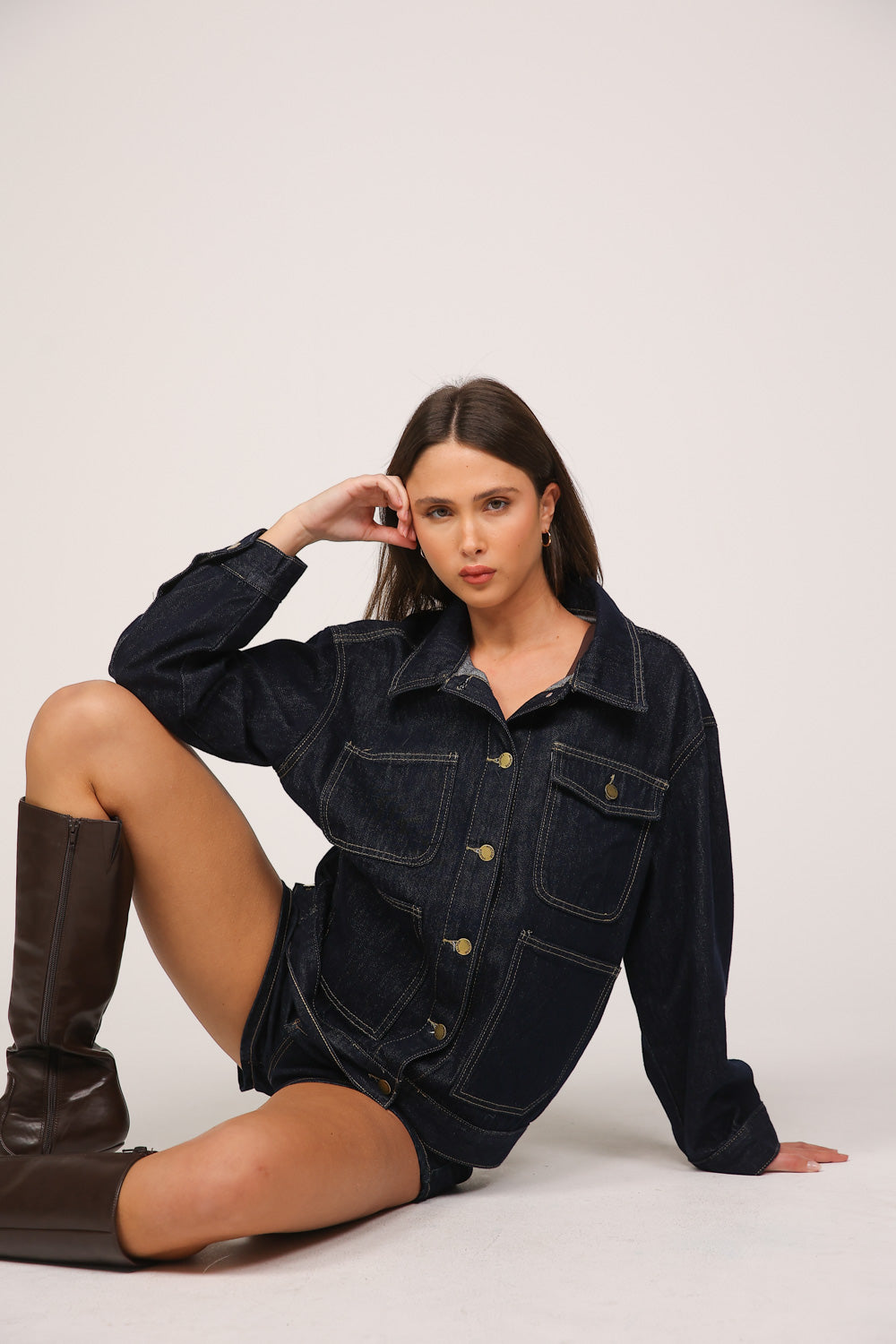 עשוי דנים בגוון כחול כהה עם תפרים בולטים בגוון בהיר וכפתורי מתכת בחזית,