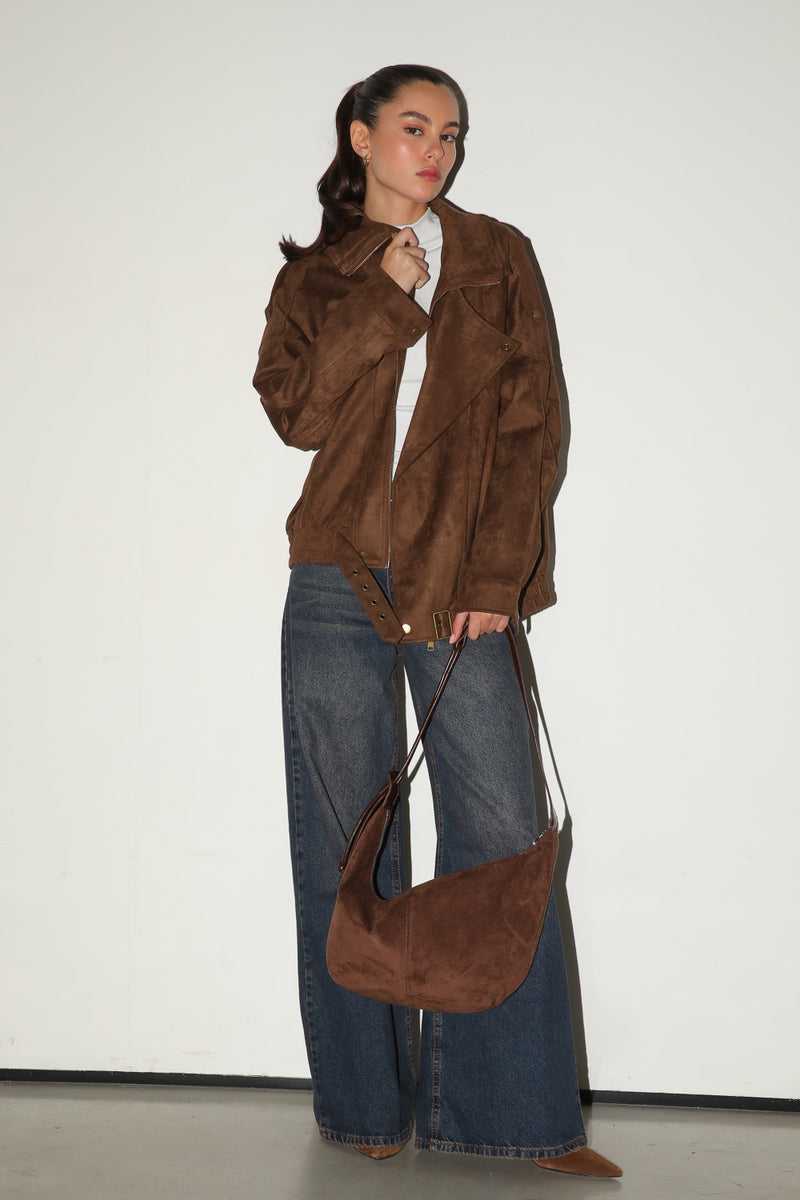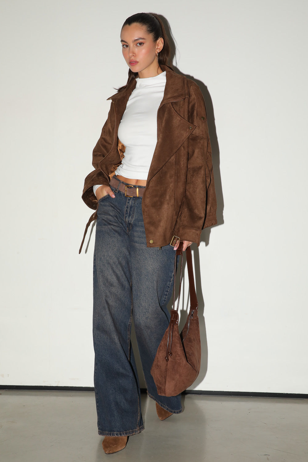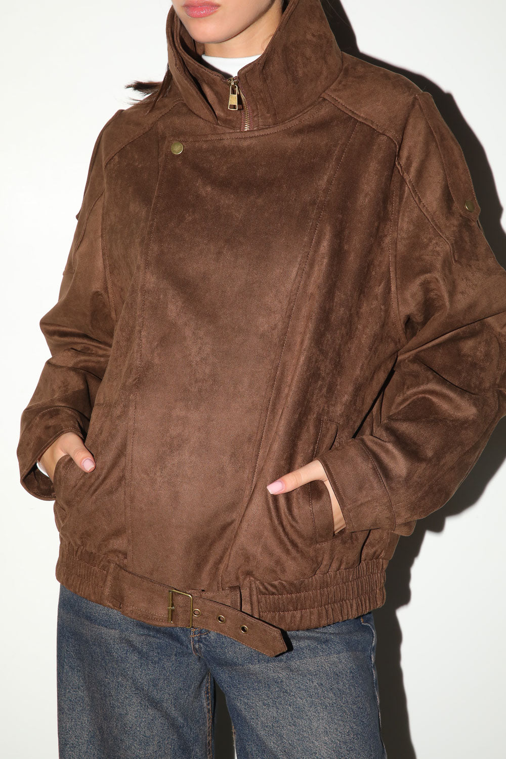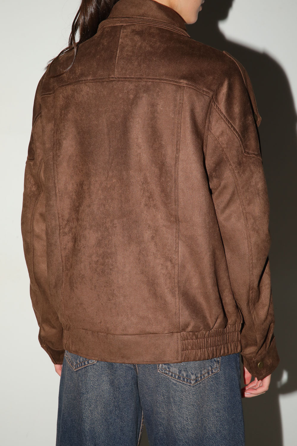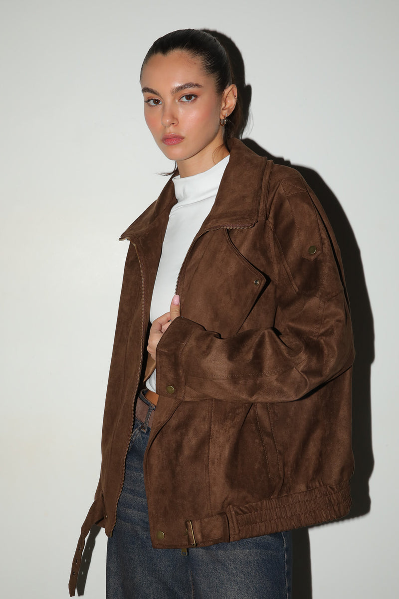 ג'קט בומבר בגזרה משוחררת עם מראה אורבני קז’ואל מושלם. עשוי דמוי זמש רך ונעים למגע, עם פרטים עדינים שמוסיפים אופי וסטייל. יושב יפה על הגוף, נותן תחושה נינוחה אבל נראית מדויקת