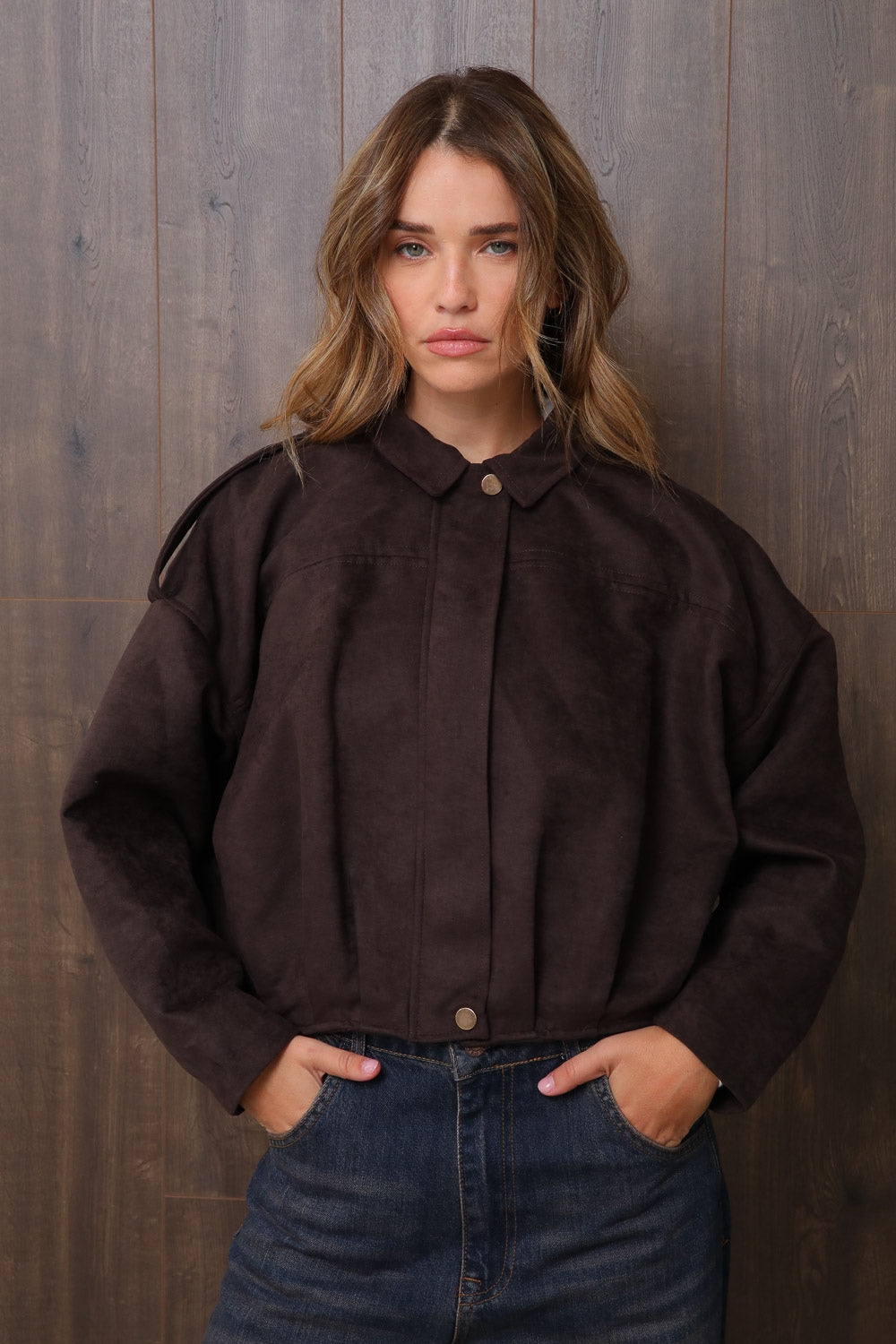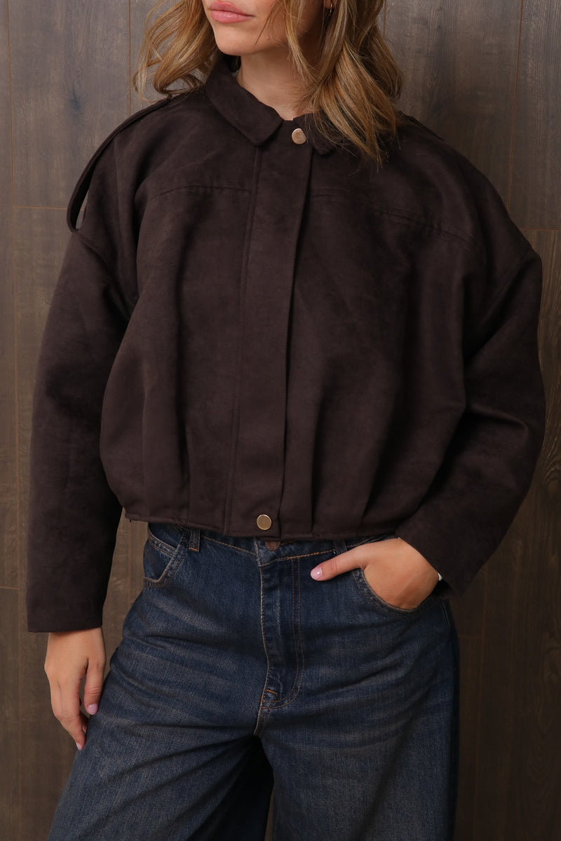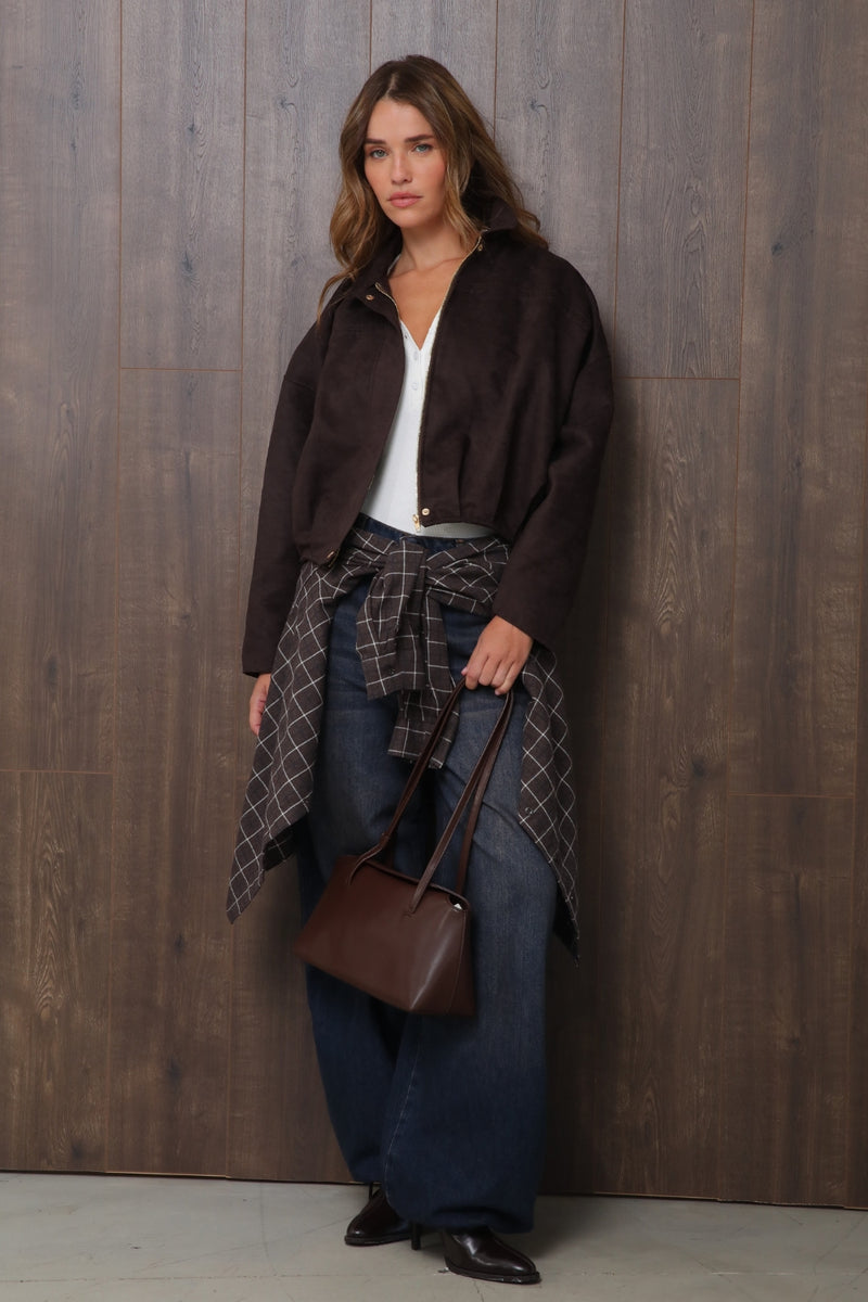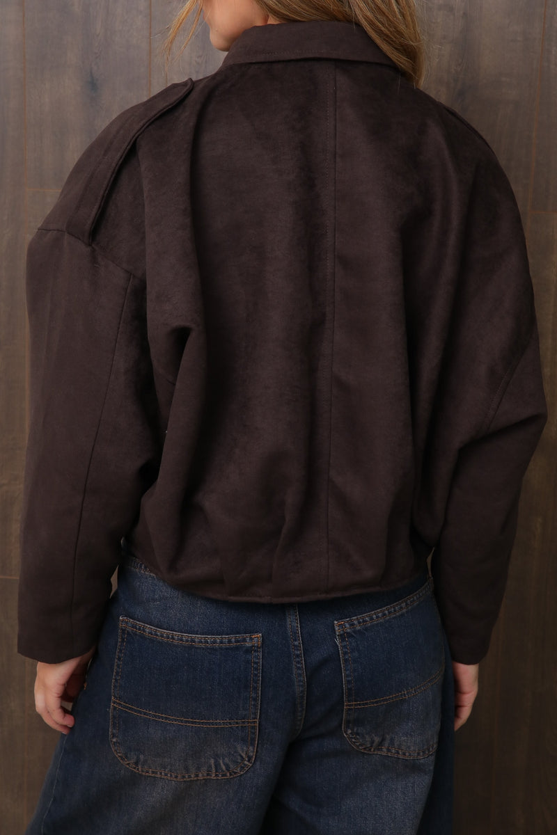 ג’קט קליל ובעל נוכחות, עשוי בד דמוי ז'מש איכותי בגוון חום עמוק (D.BROWN) שמעניק תחושת חמימות ומראה יוקרתי.