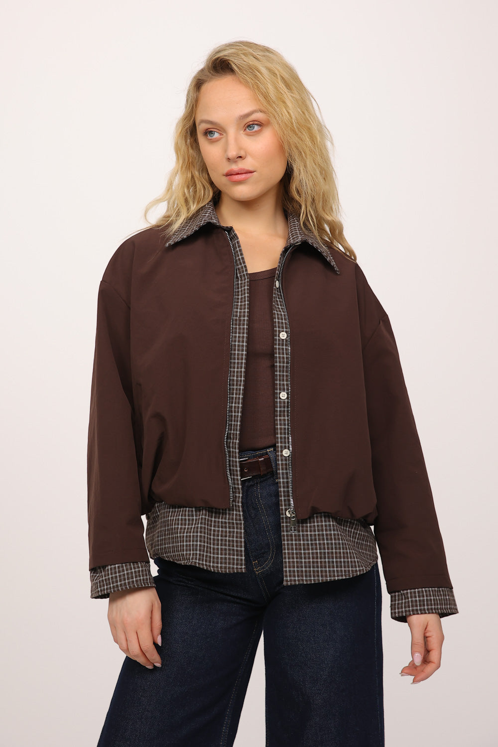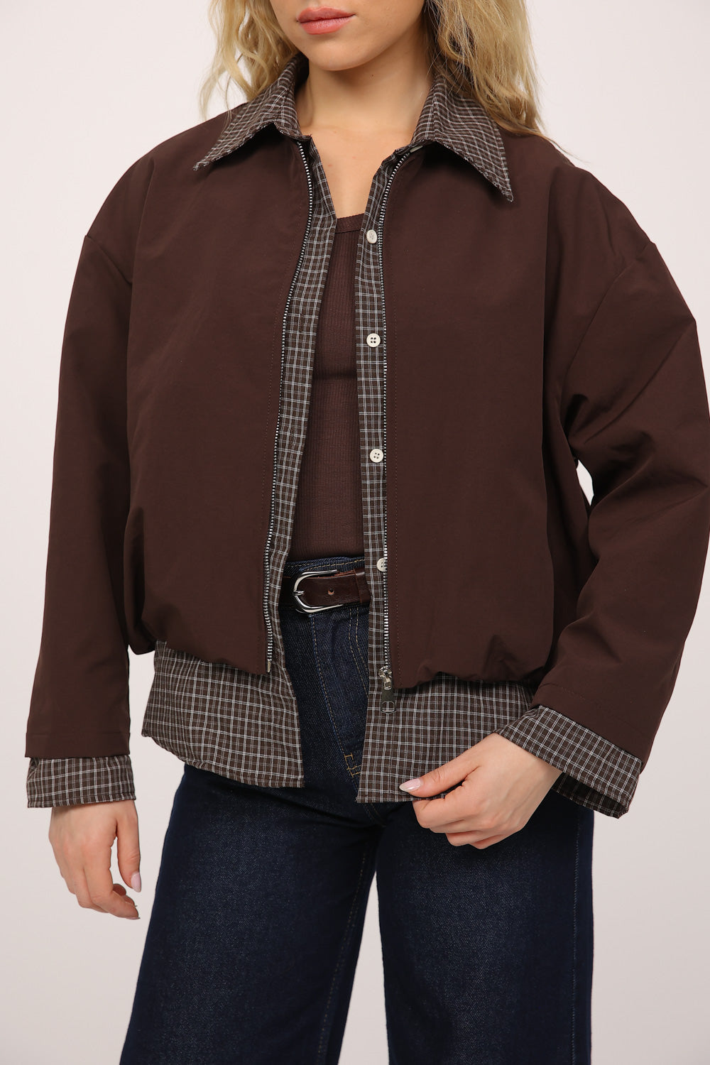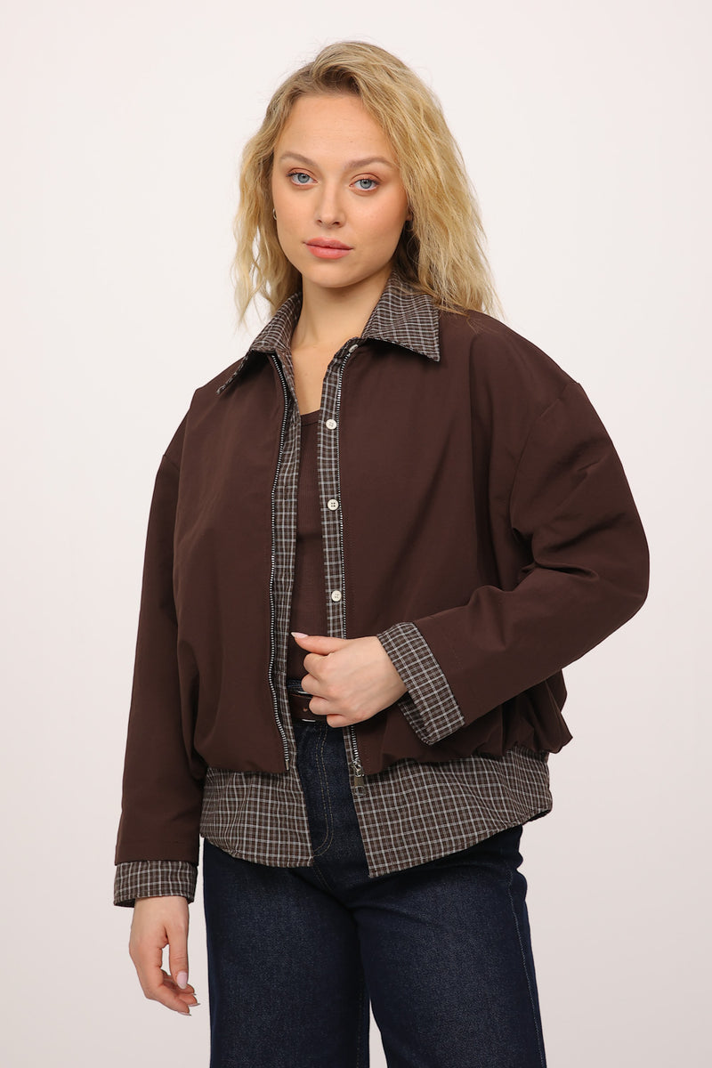 בגוון חום עמוק, עם חולצת משבצות מחוברת בחלק הפנימי שיוצרת מראה של שכבות בלבישה אחת.
