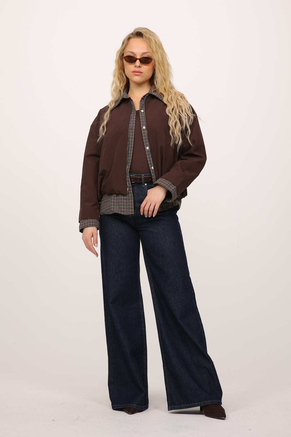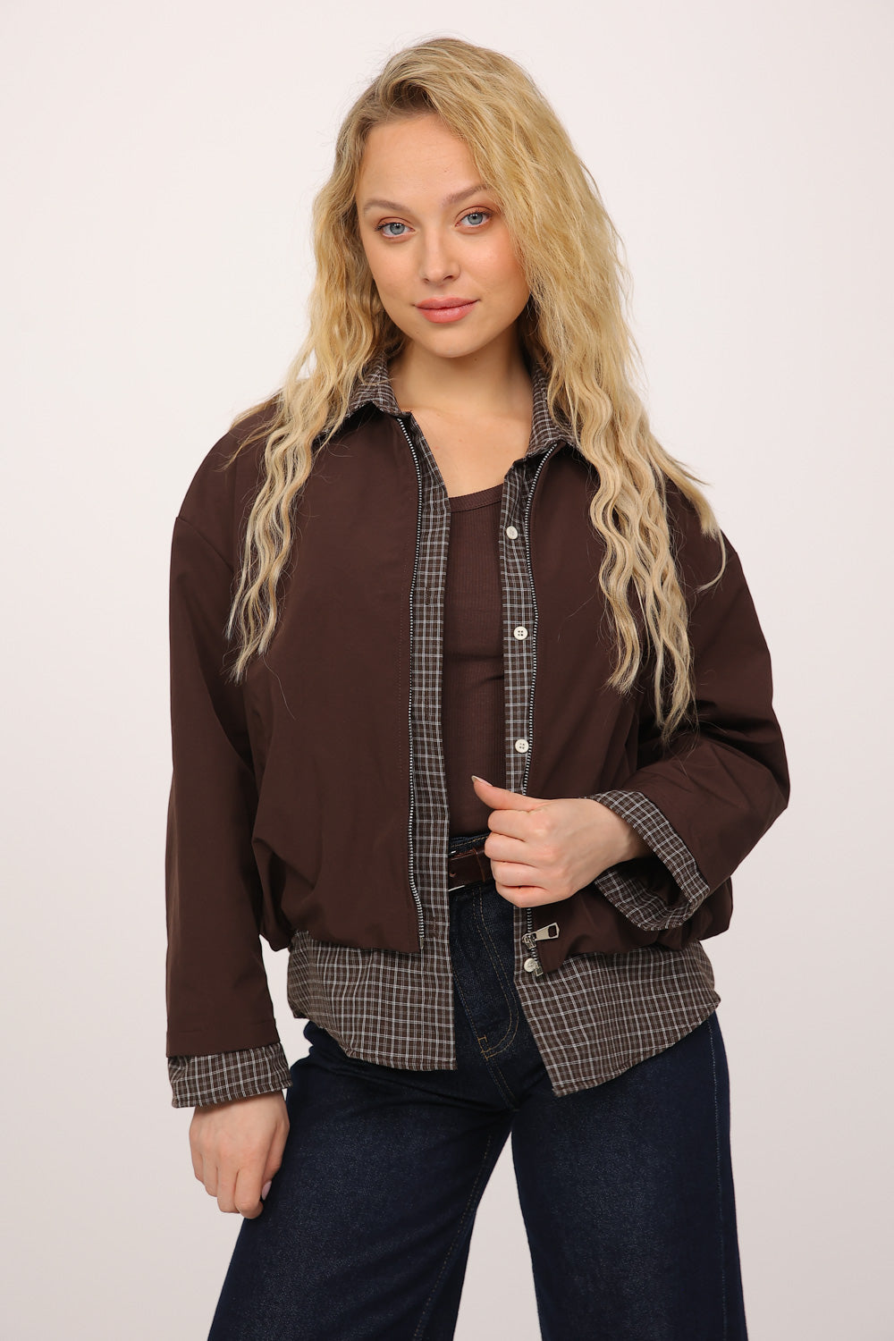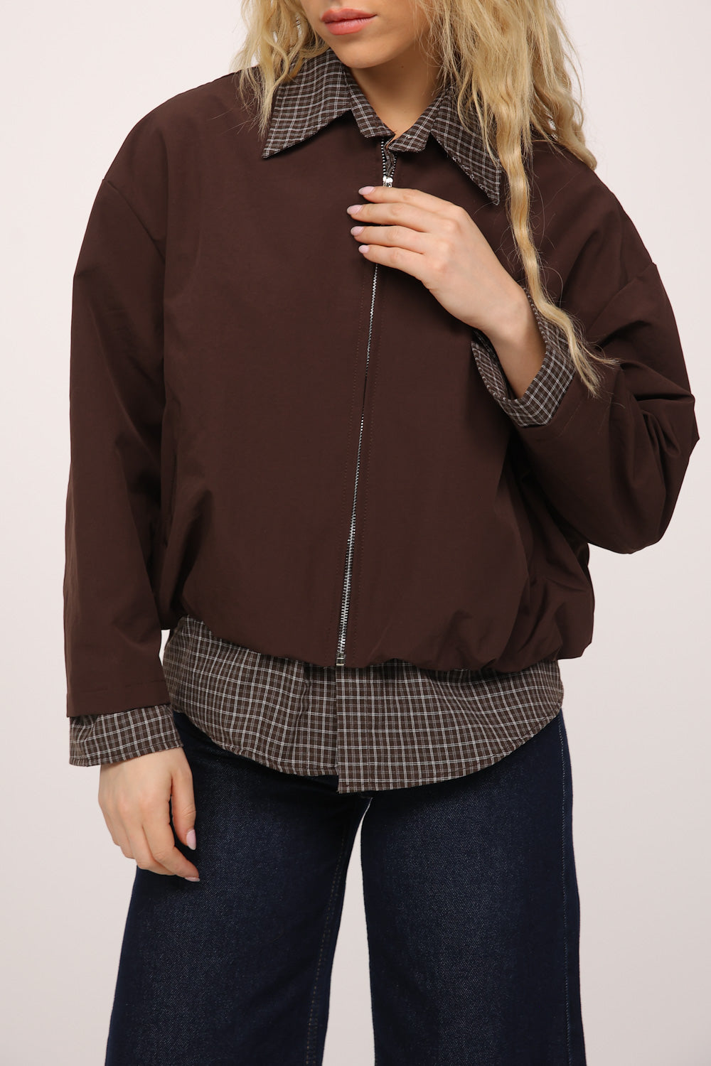 בגוון חום עמוק, עם חולצת משבצות מחוברת בחלק הפנימי שיוצרת מראה של שכבות בלבישה אחת.