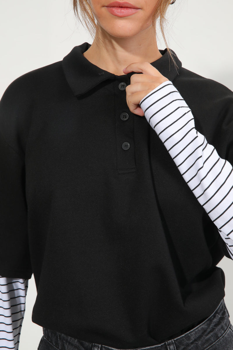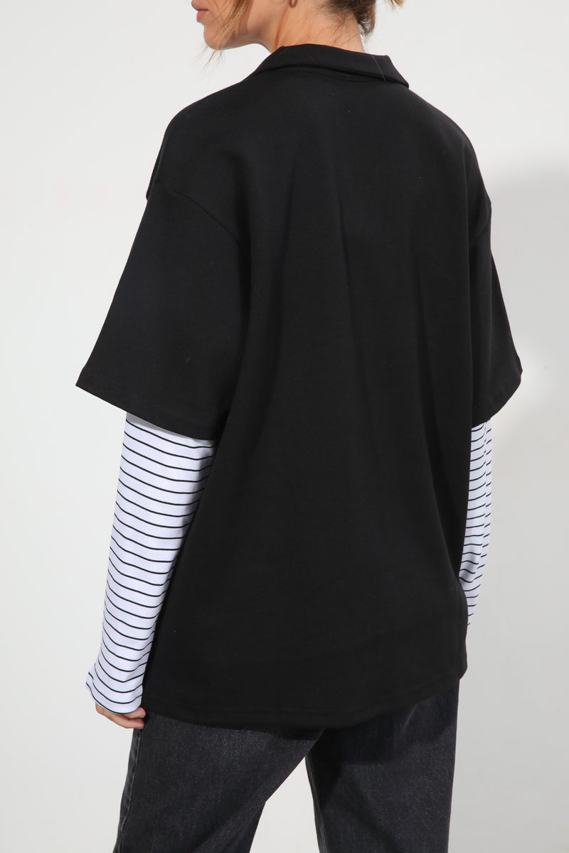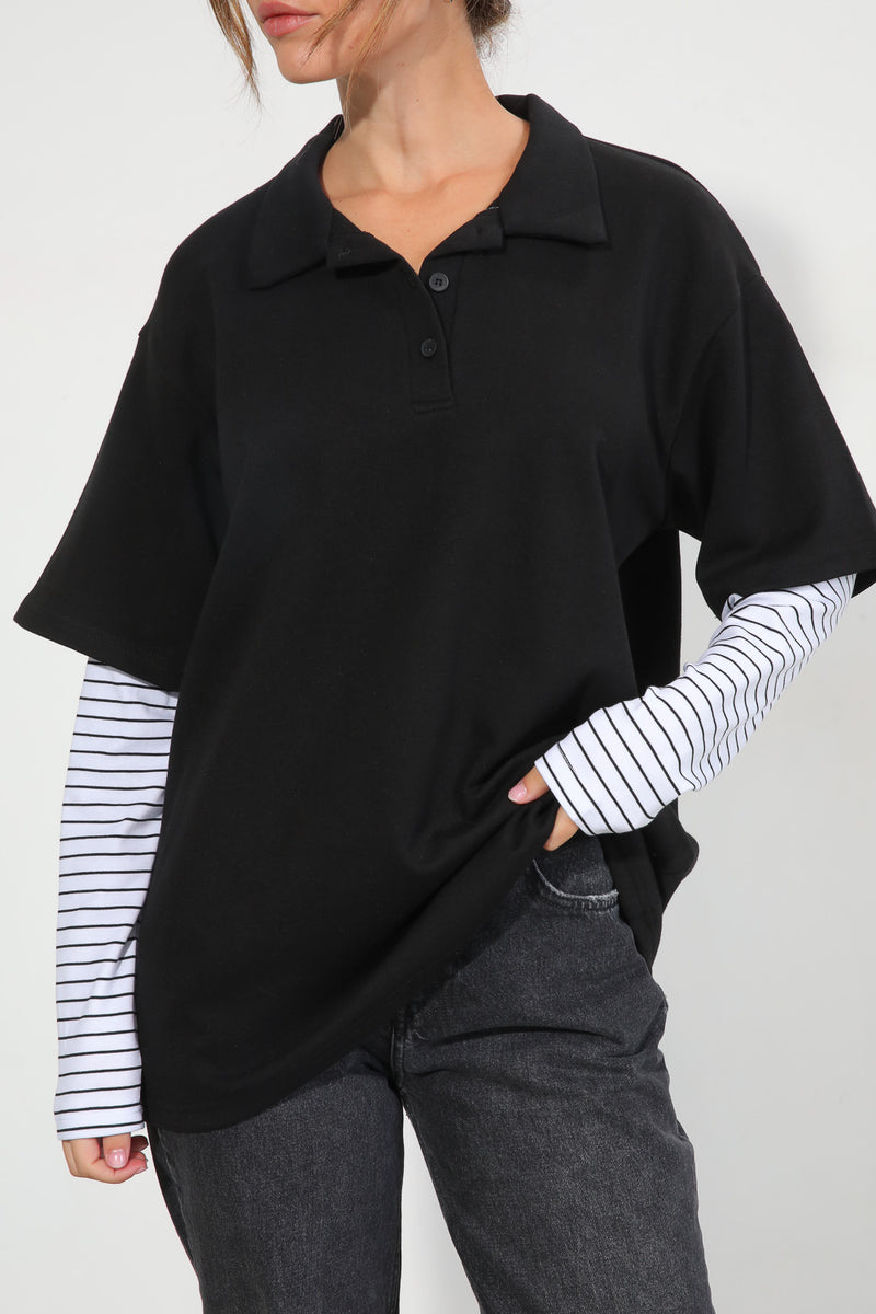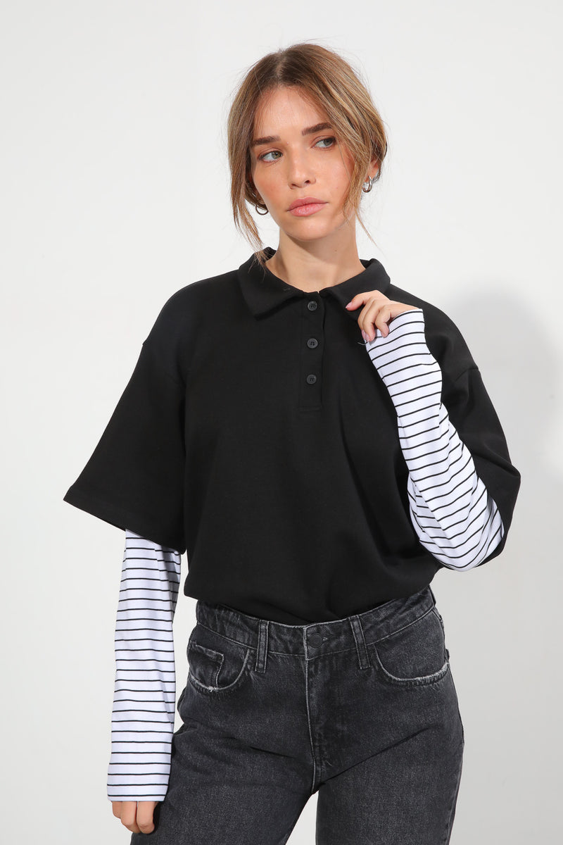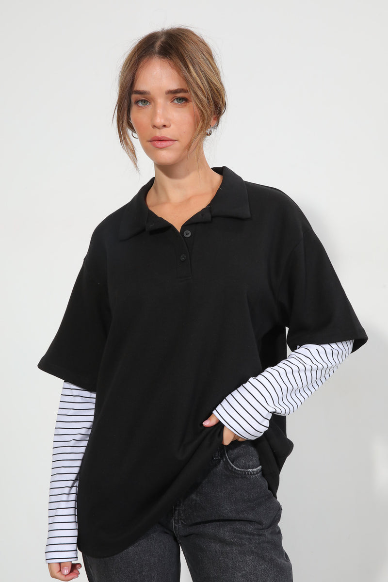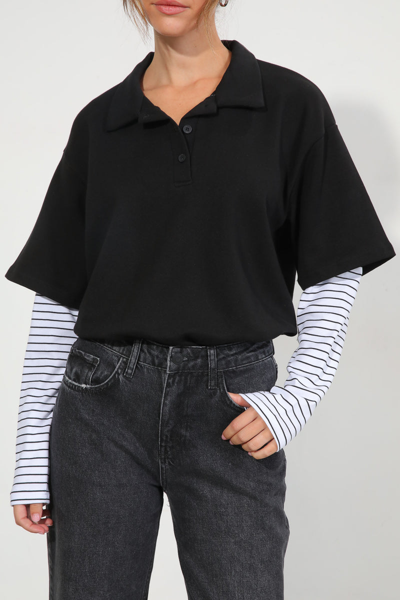 חולצה מכופתרת עם צווארון שינה בשילוב שרוולים כפולים עם פרינט פסים,