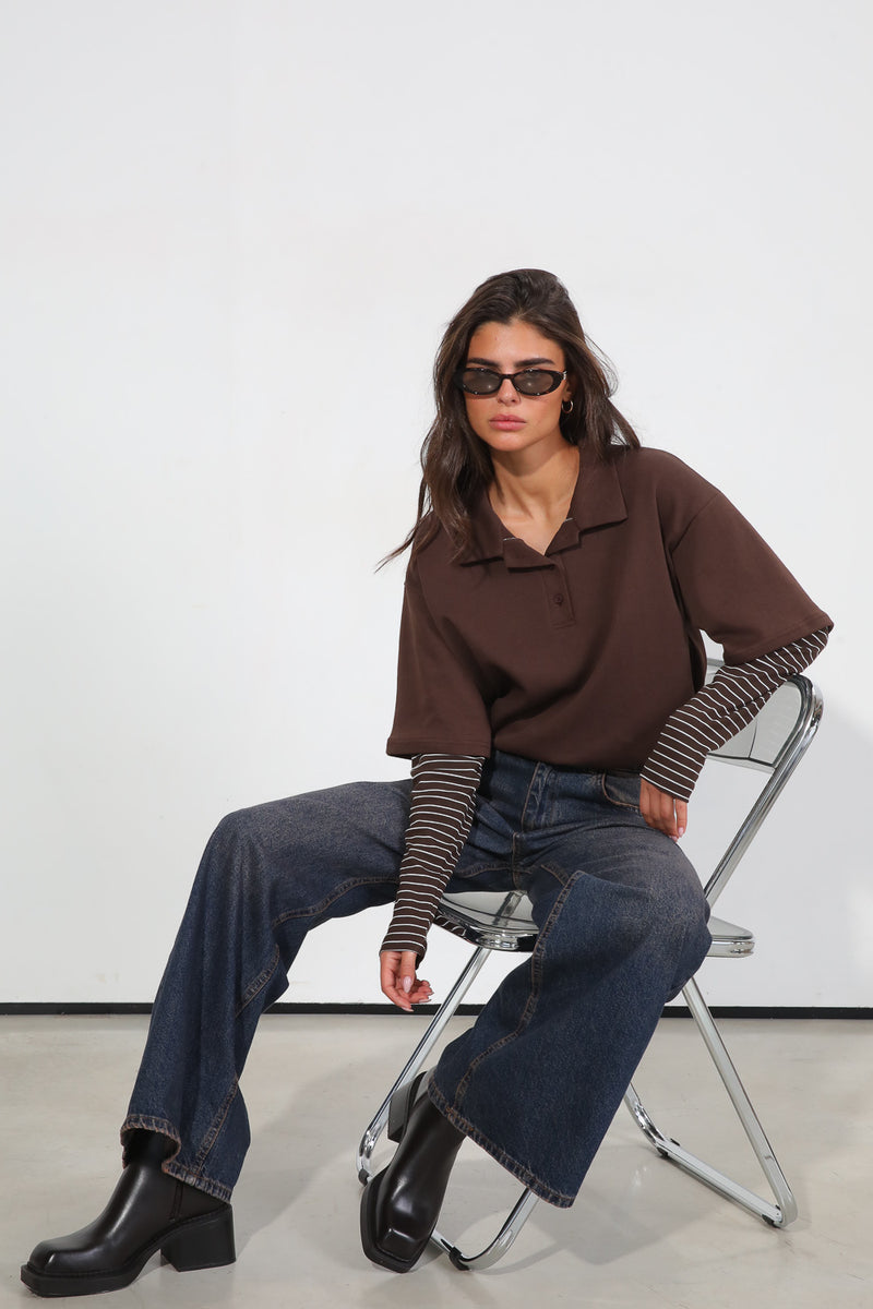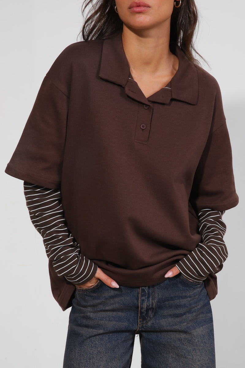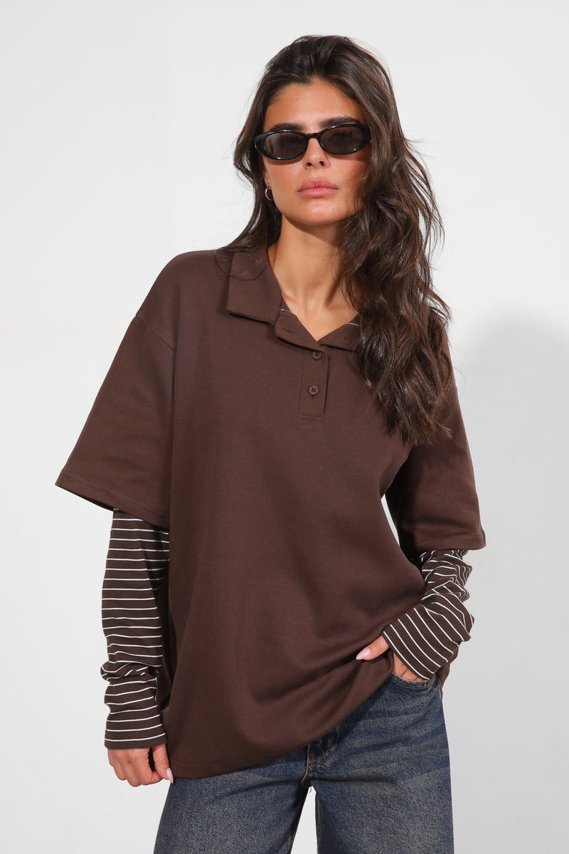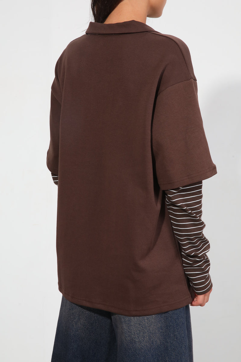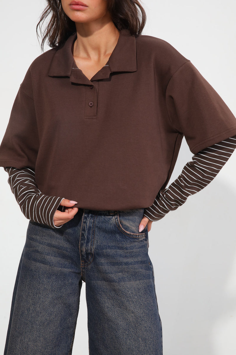 חולצה מכופתרת עם צווארון שינה בשילוב שרוולים כפולים עם פרינט פסים,