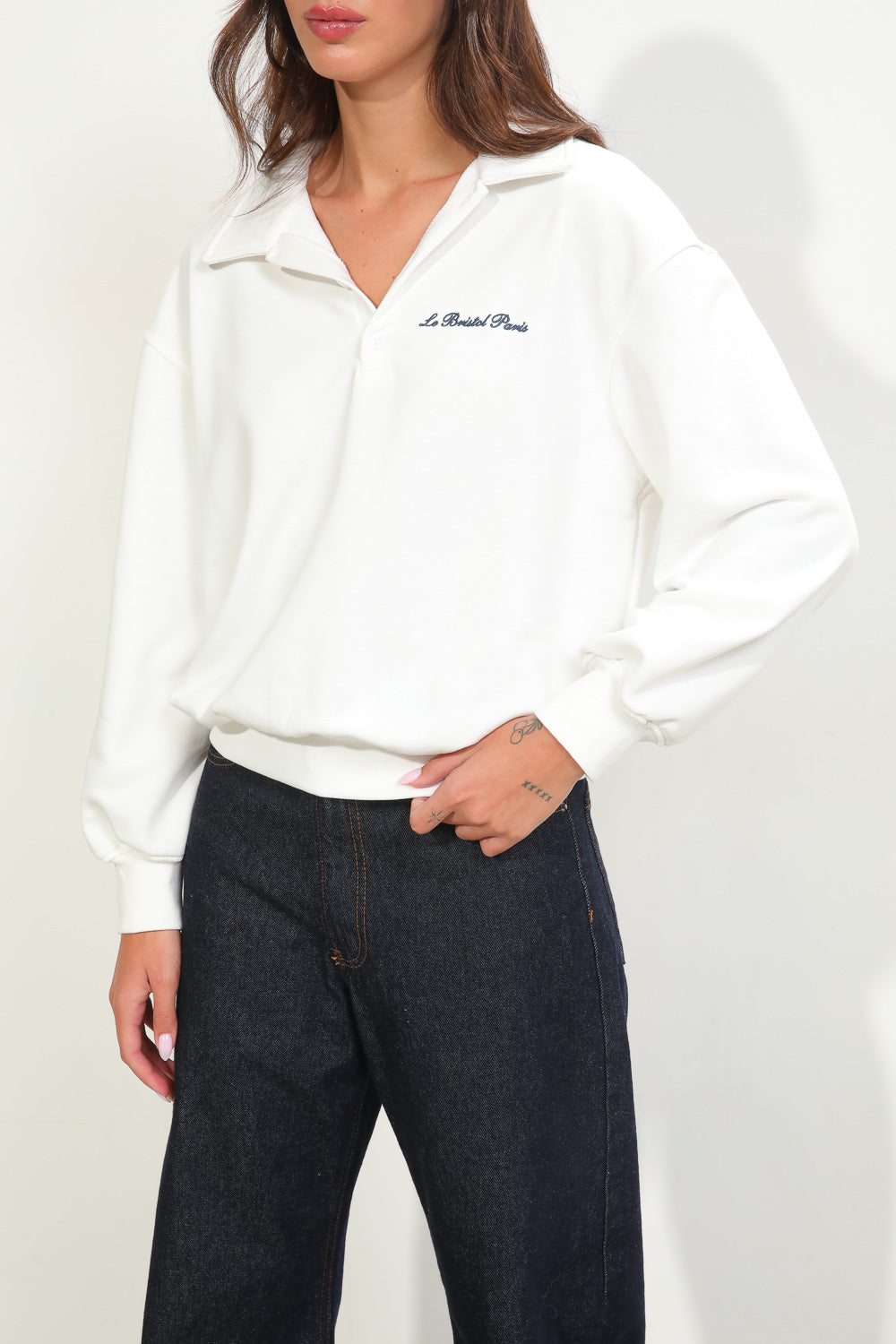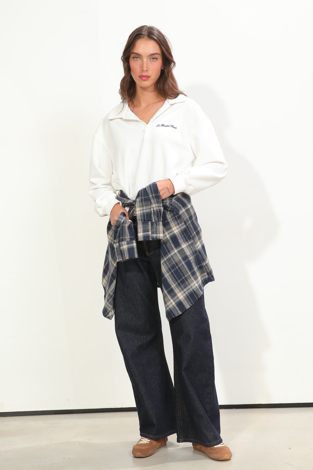 חולצת בלה בגזרת אוברסייז עם צווארון שינה ושילוב רקמה בחזית,