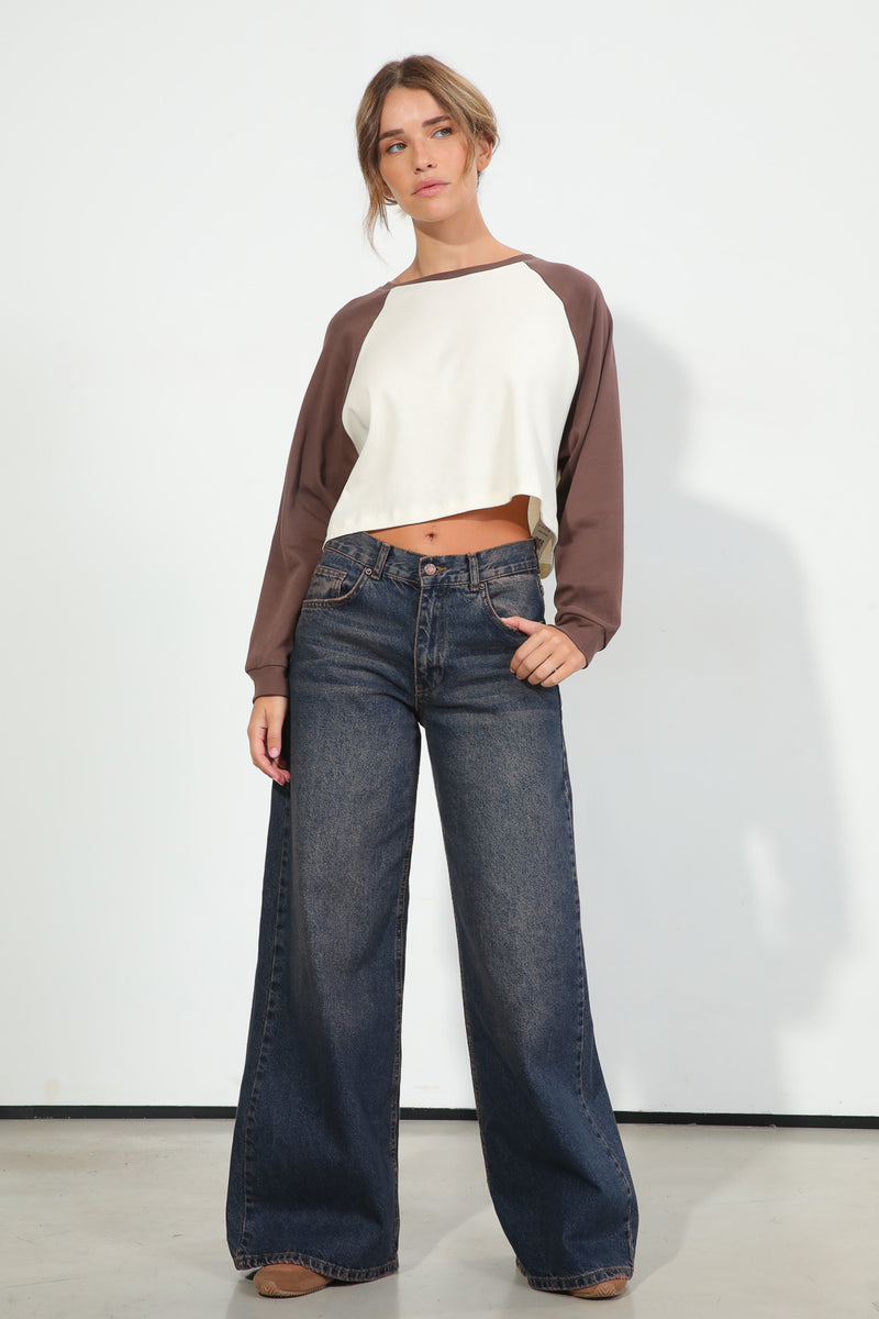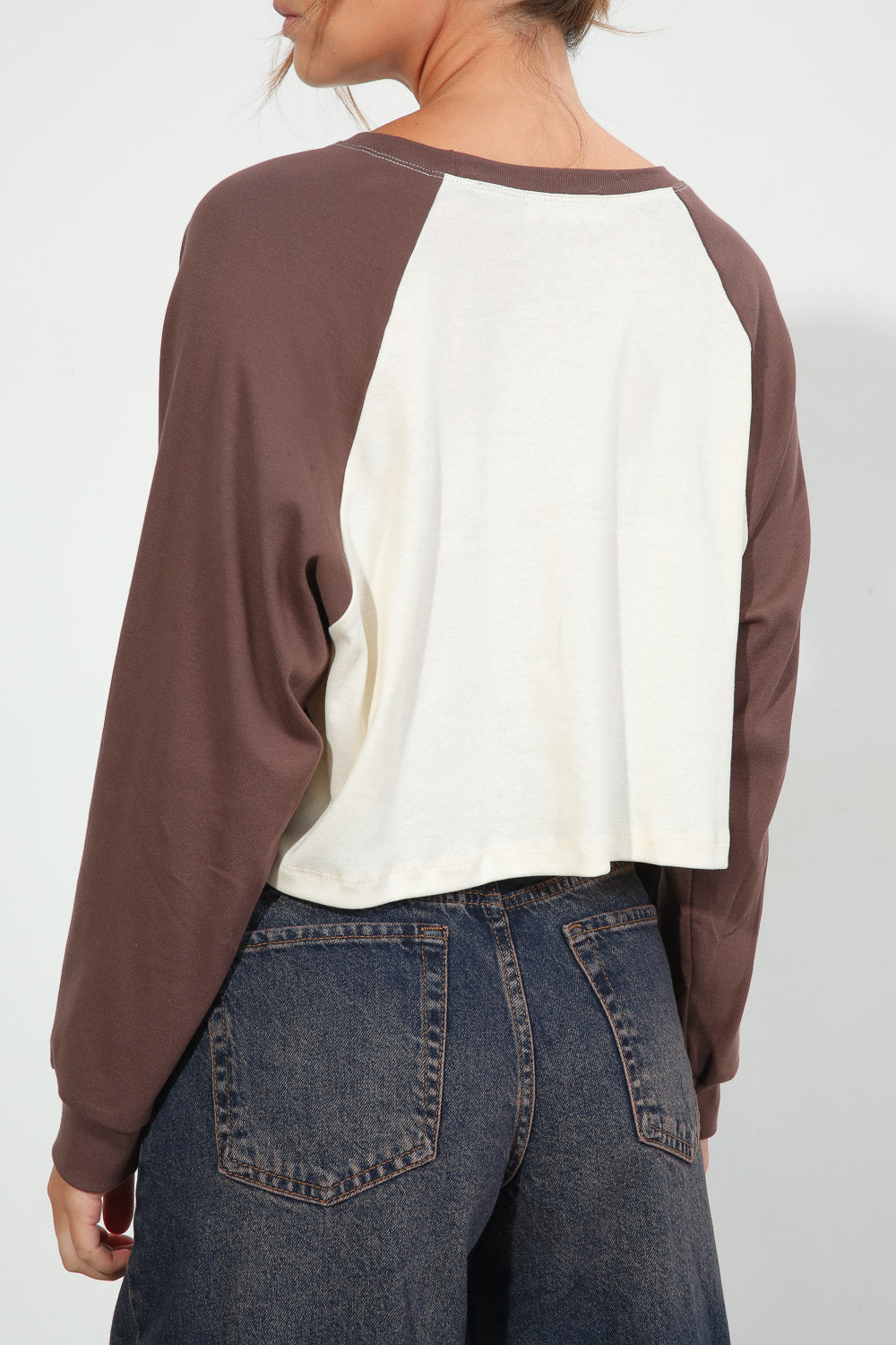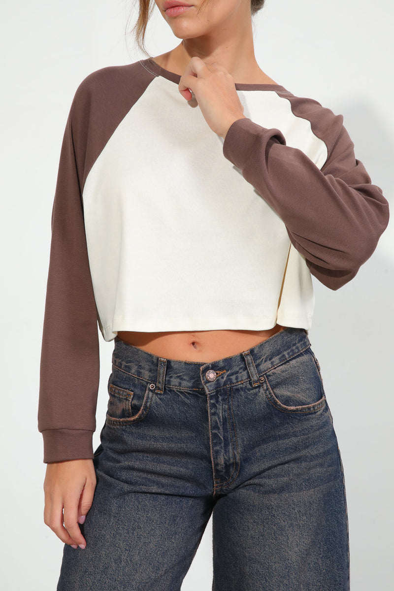 חולצת בייסיק בגזרת קרופ עם צווארון עגול בשילוב שרוולים חומים,