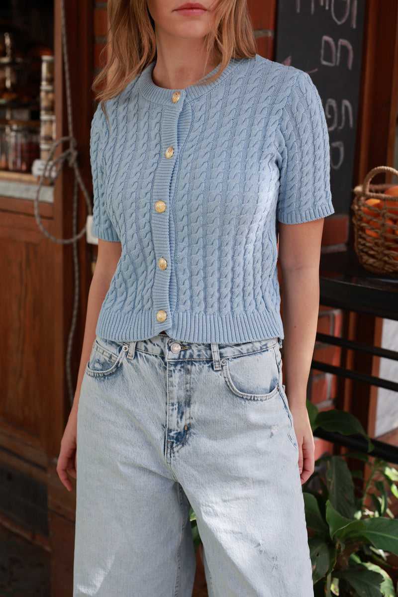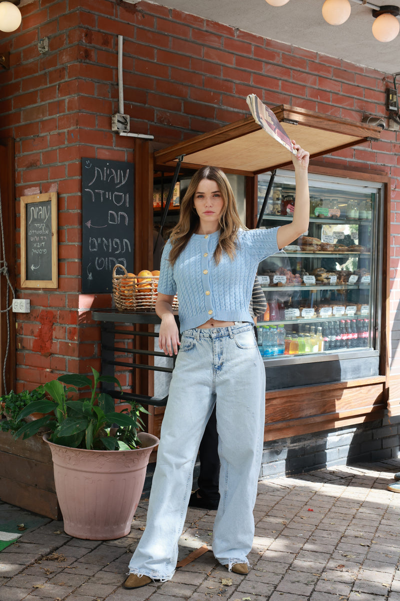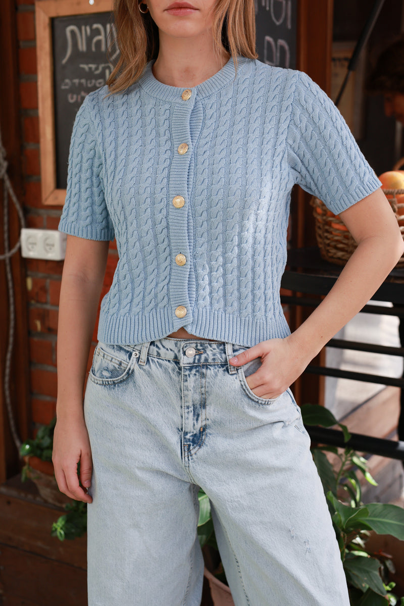 עשוי סריג דק ונעים בגוון תכלת בהיר, עם טקסטורה עדינה לאורך הבד
