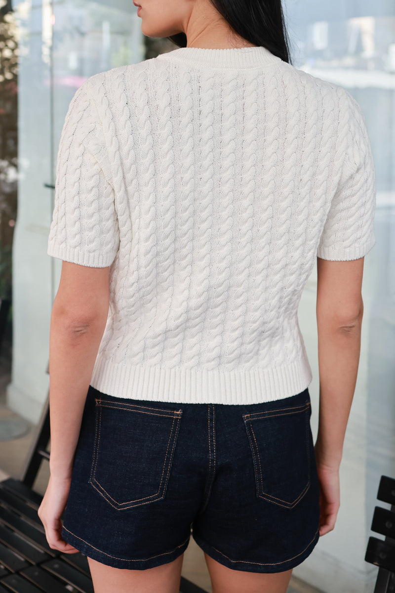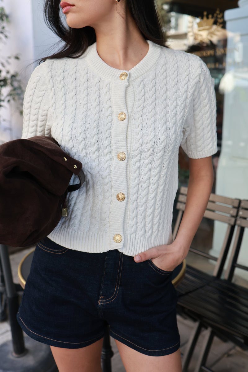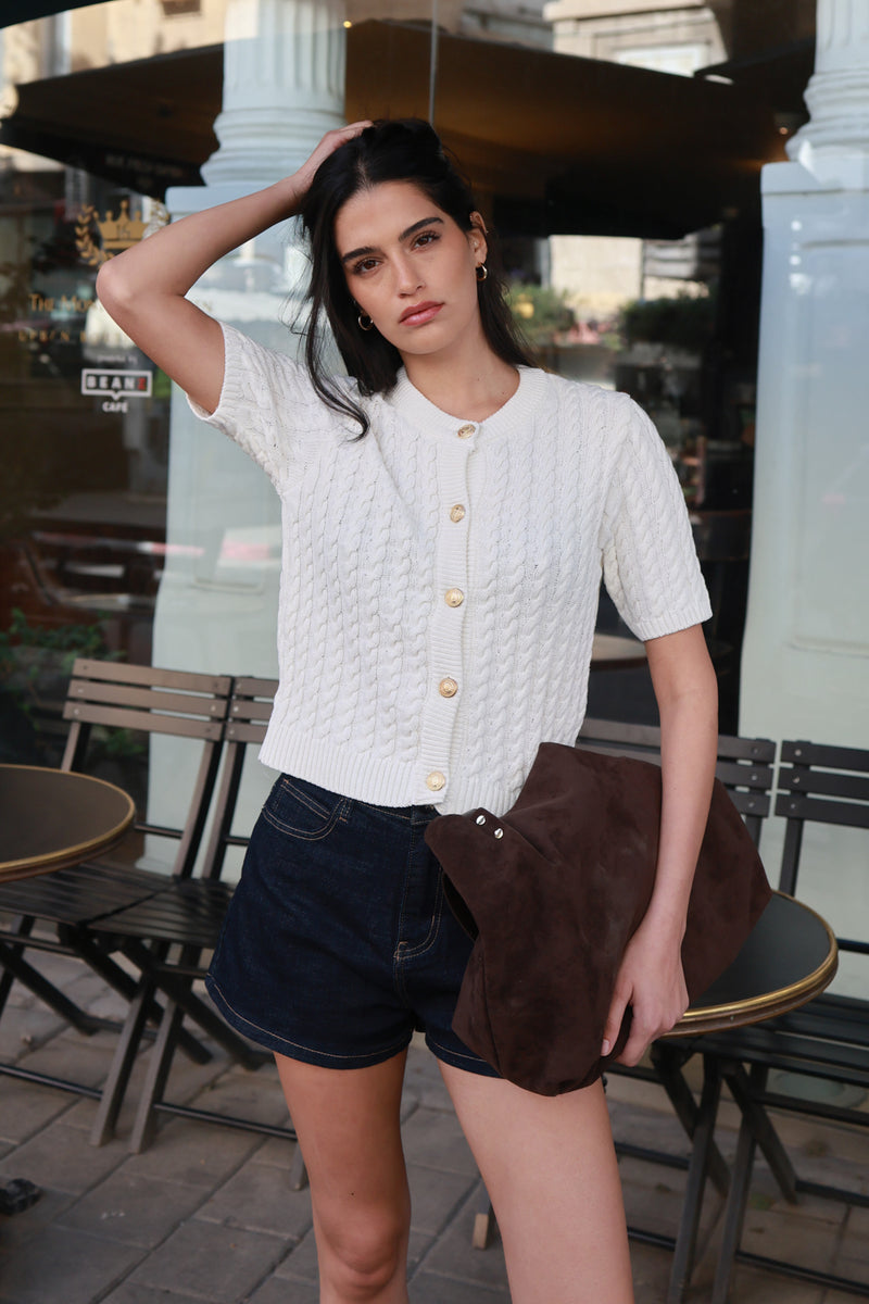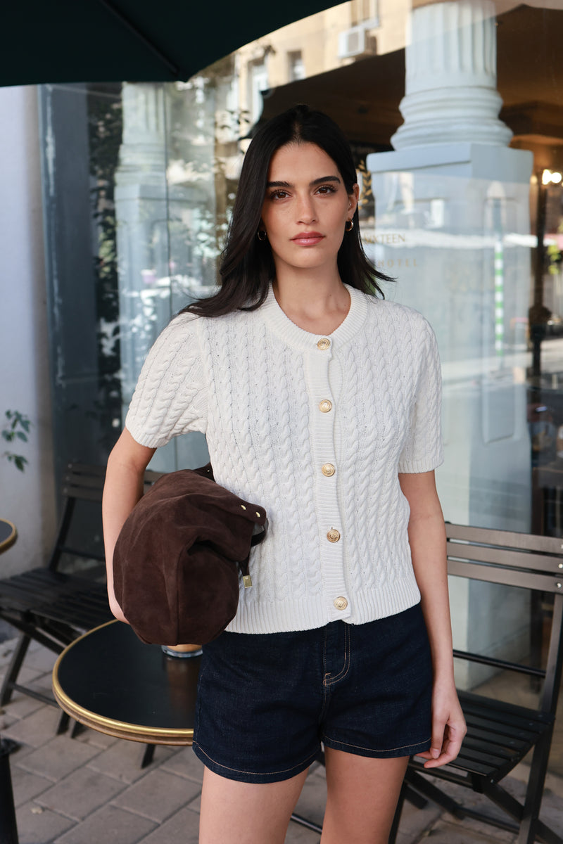 עשוי סריג דק ונעים בגוון אוף וויט, עם טקסטורה עדינה לאורך הבד