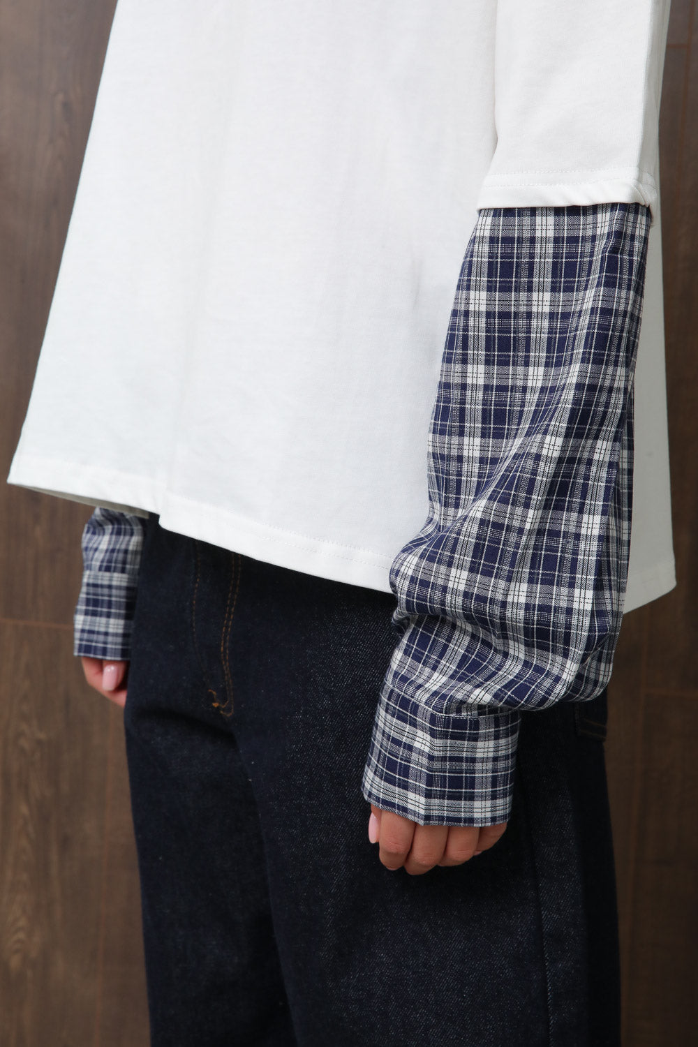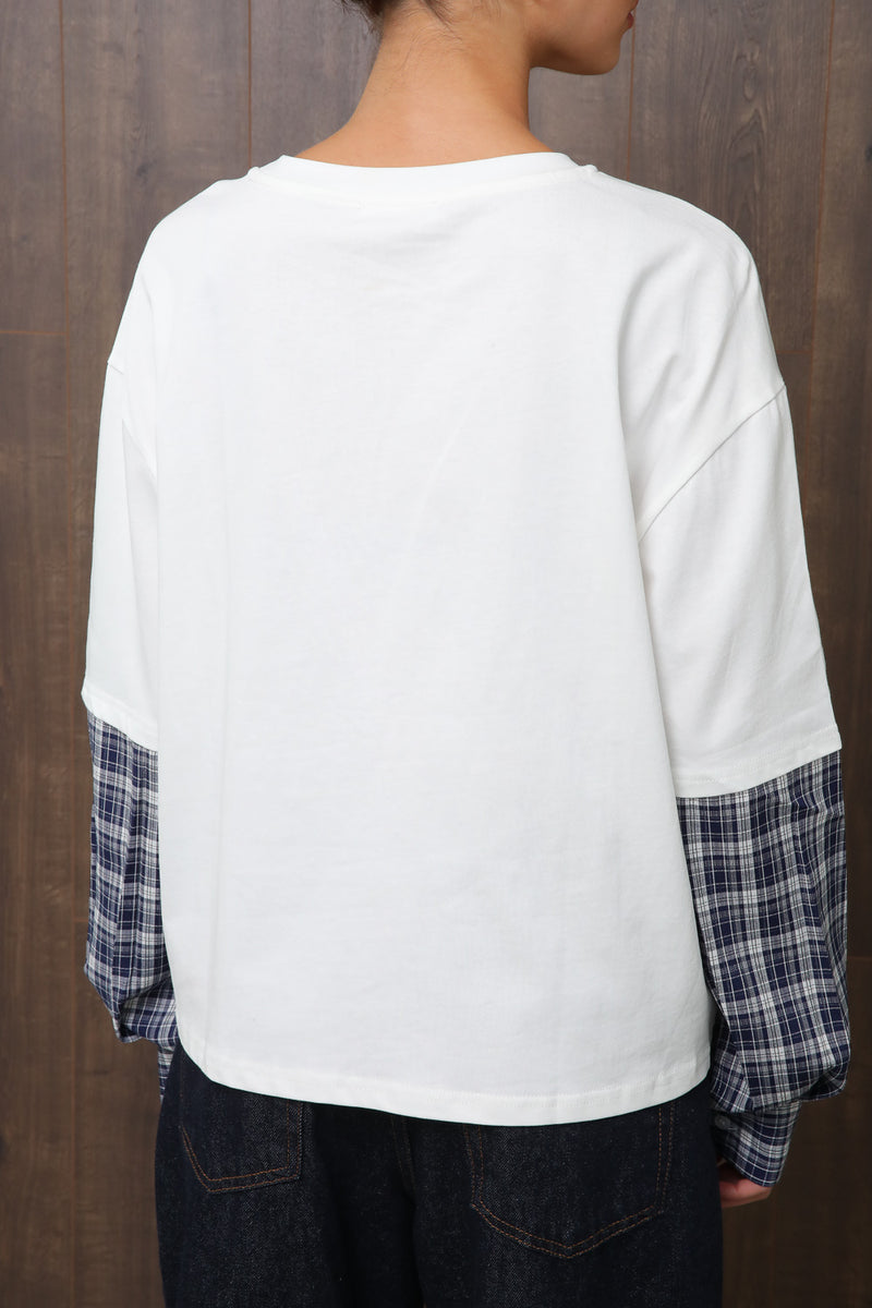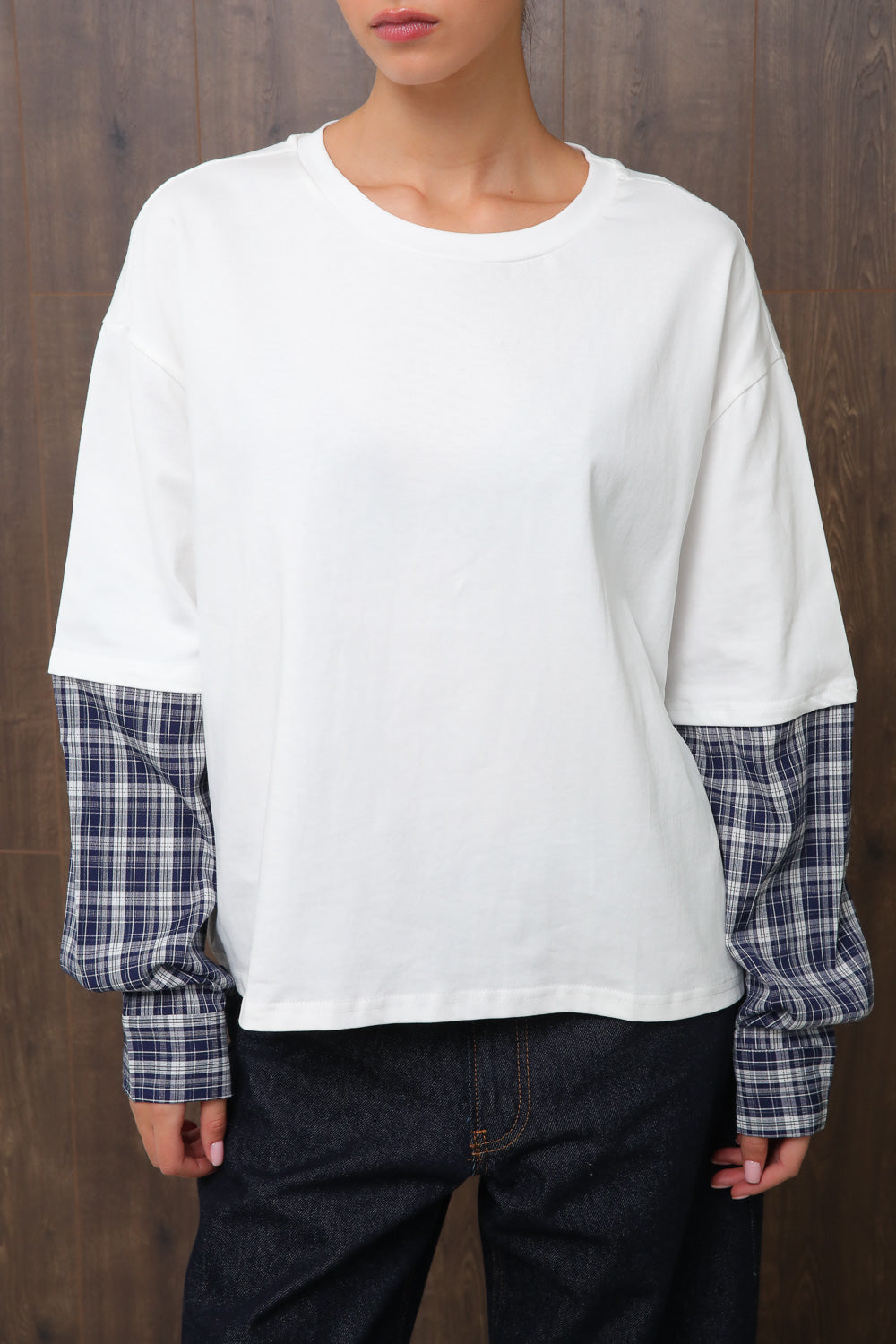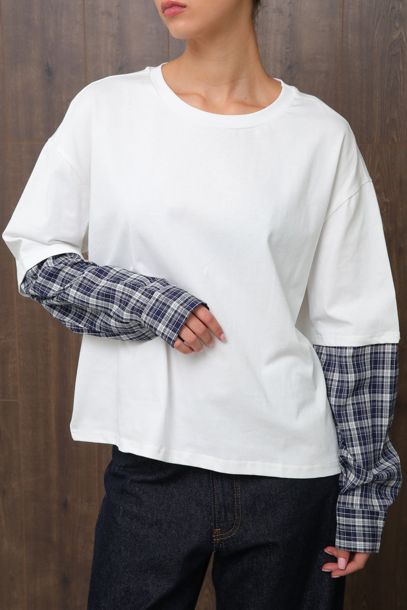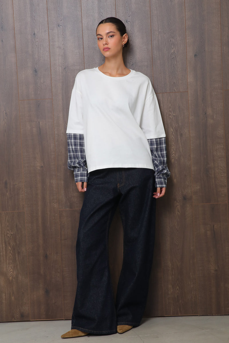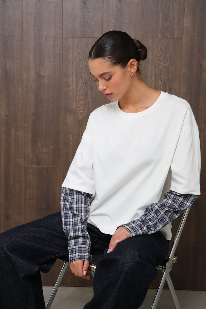 חולצת בייסיק אוברסייז עם צווארון עגול בשילוב שרוול כפול בדפוס משבצות,