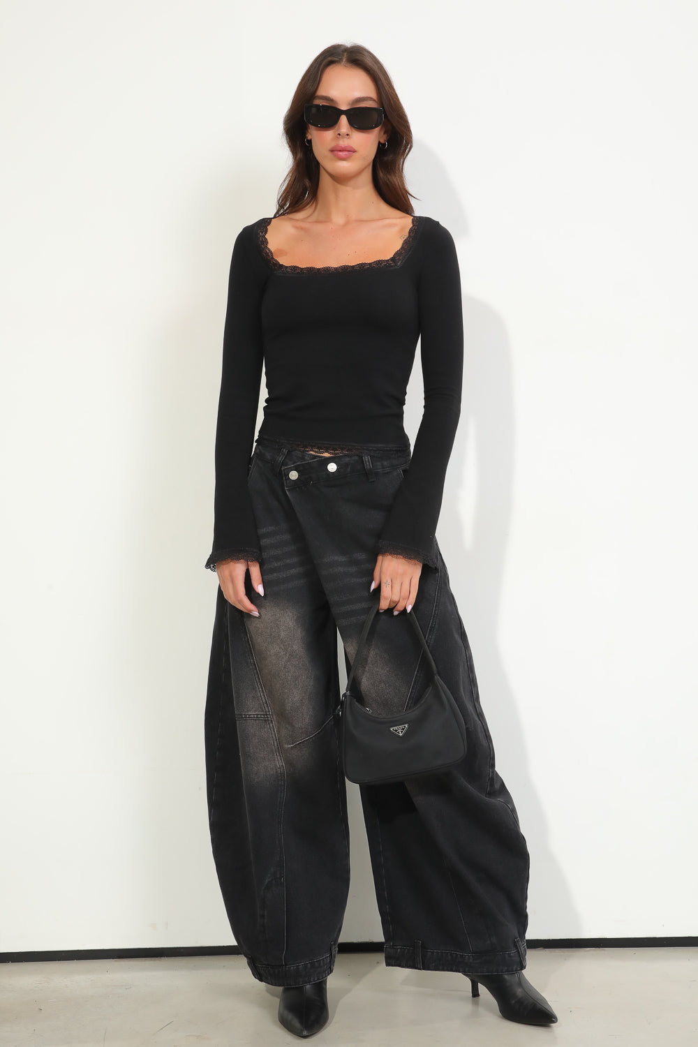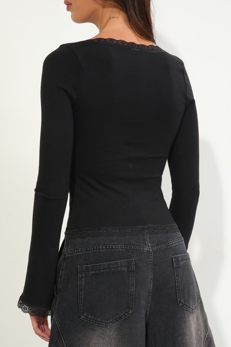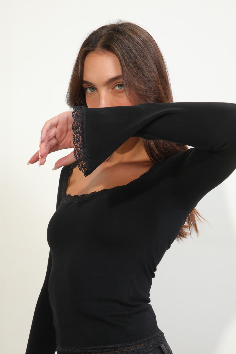 חולצת לרה עם תחרה עדינה המשולבת בקצוות השרוולים ובשולי החולצה.