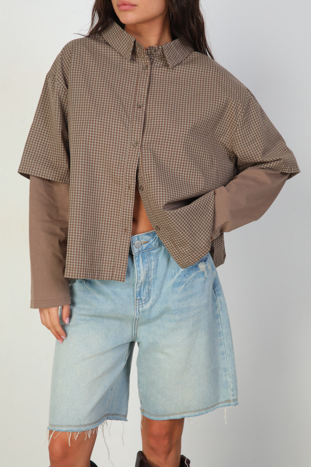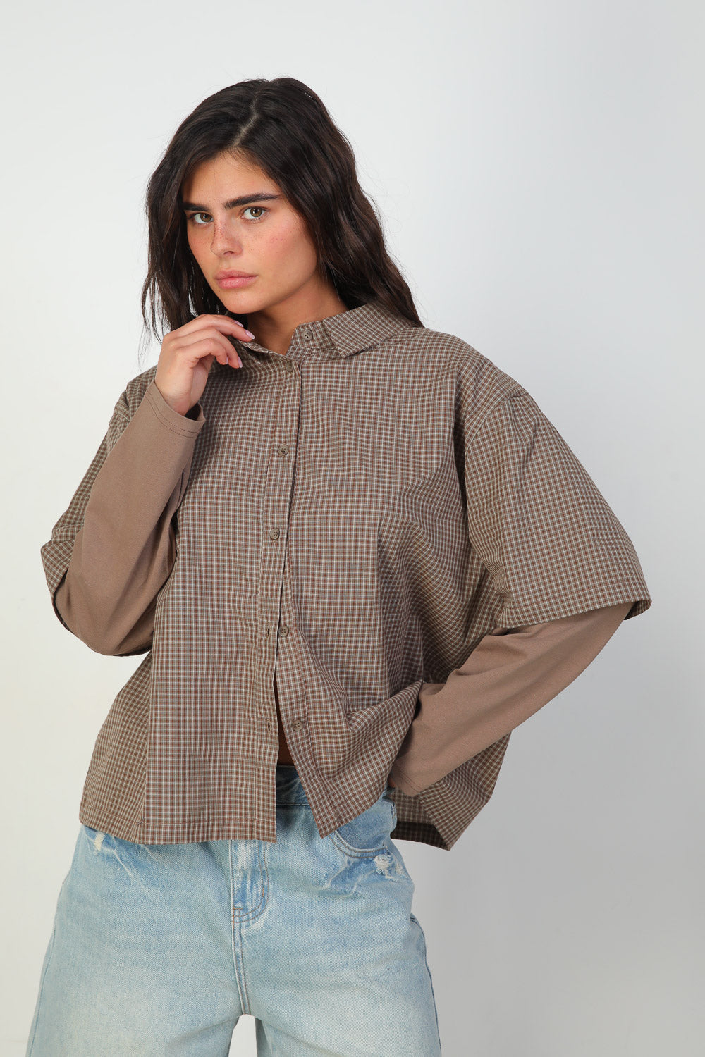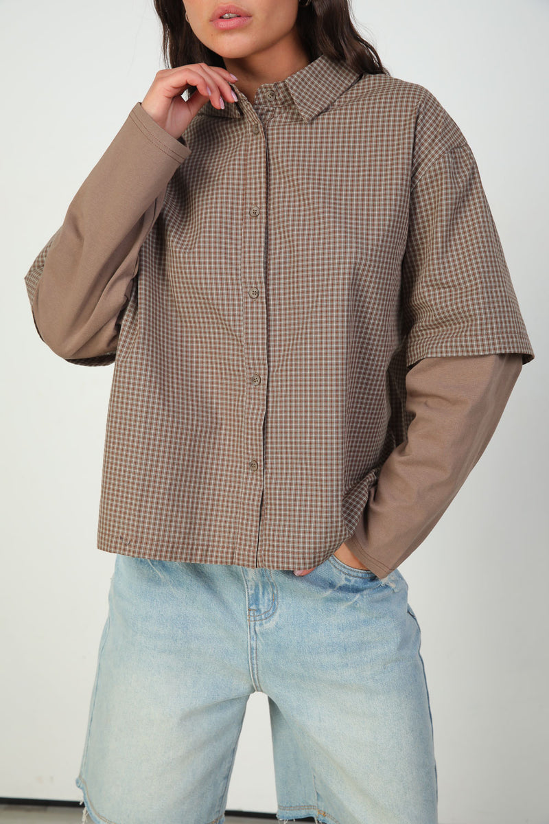 חולצה בגזרה נינוחה עם מראה שכבות ייחודי. עשויה בד בדוגמת משבצות בגוון חום, בשילוב שרוולים ארוכים בצבע חום בהיר היוצרים אפקט של חולצה מעל חולצה. בעלת צווארון קלאסי וסגירת כפתורים קדמית, עם אורך שמאפשר לבישה משוחררת או תחובה.