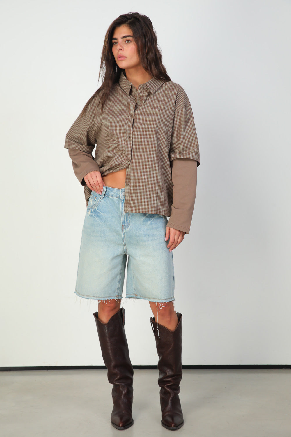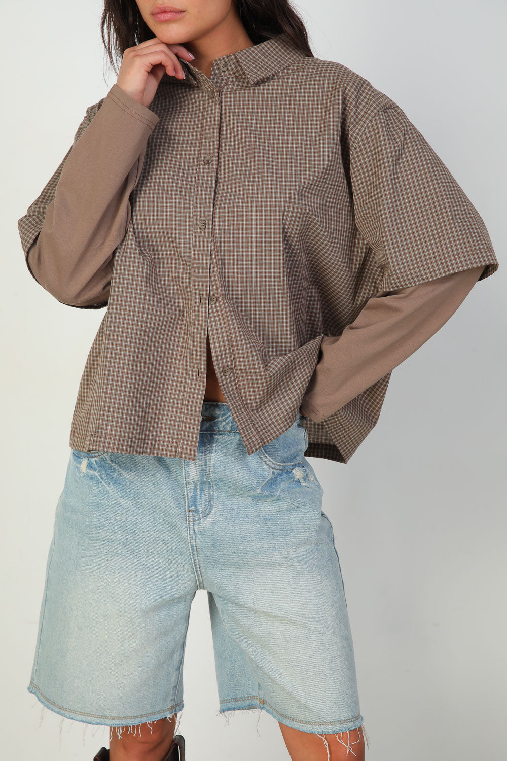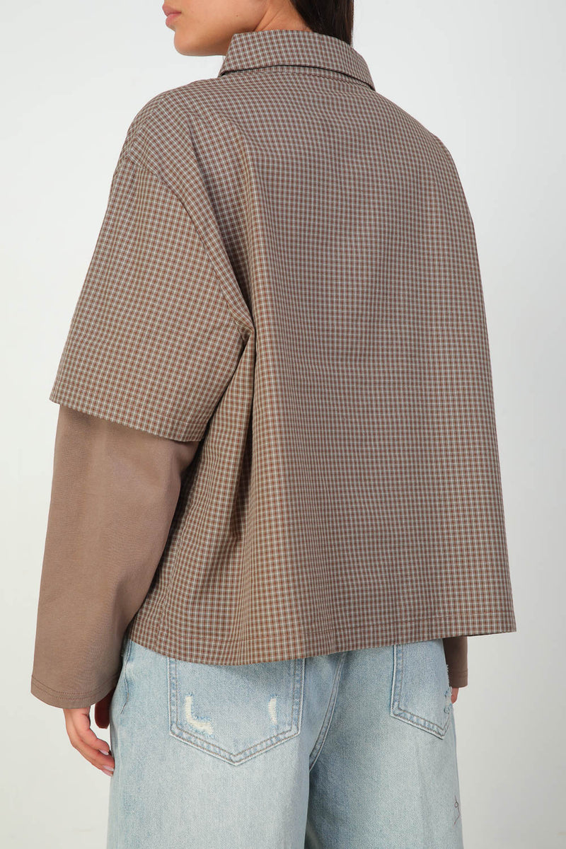 חולצה בגזרה נינוחה עם מראה שכבות ייחודי. עשויה בד בדוגמת משבצות בגוון חום, בשילוב שרוולים ארוכים בצבע חום בהיר היוצרים אפקט של חולצה מעל חולצה. בעלת צווארון קלאסי וסגירת כפתורים קדמית, עם אורך שמאפשר לבישה משוחררת או תחובה.