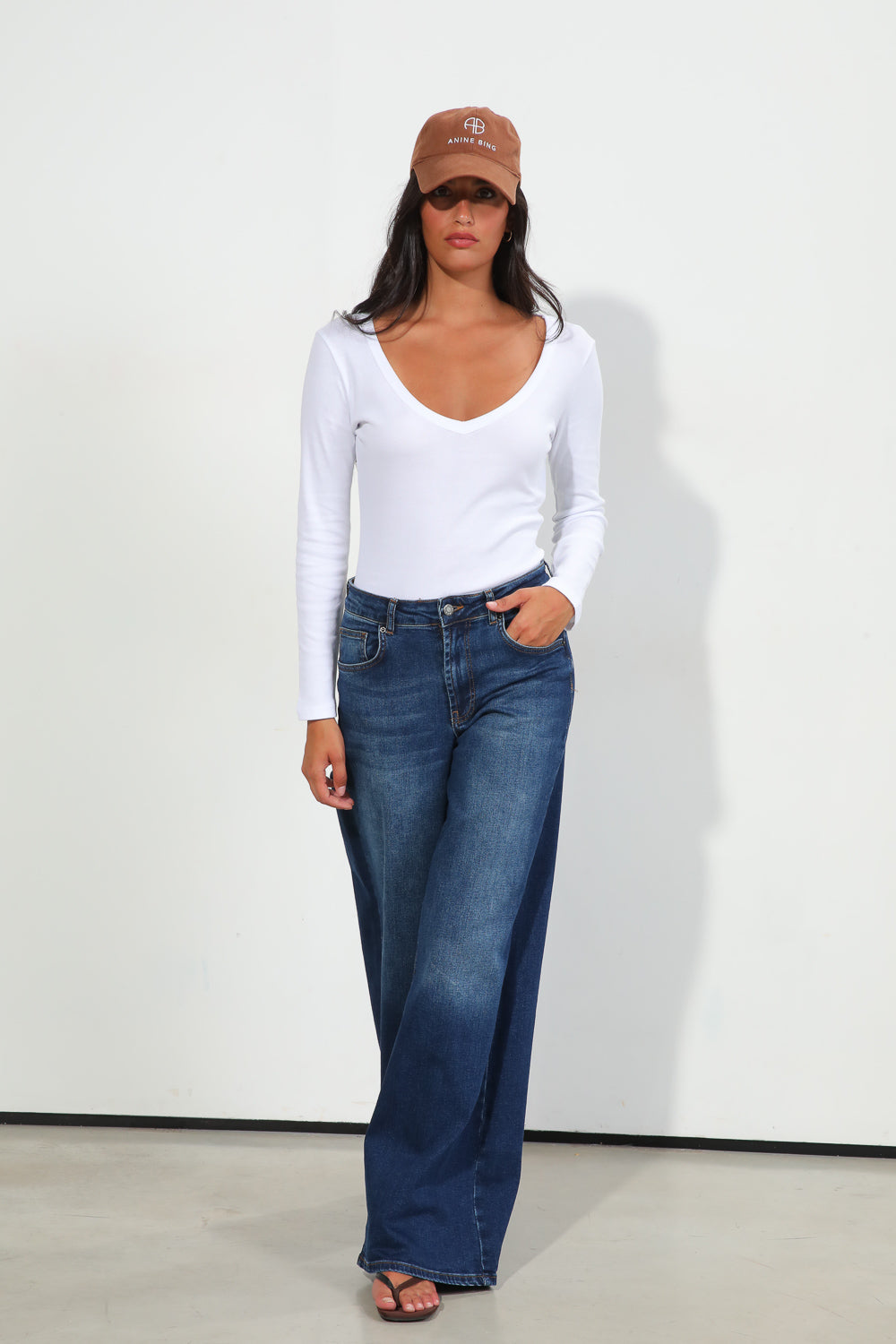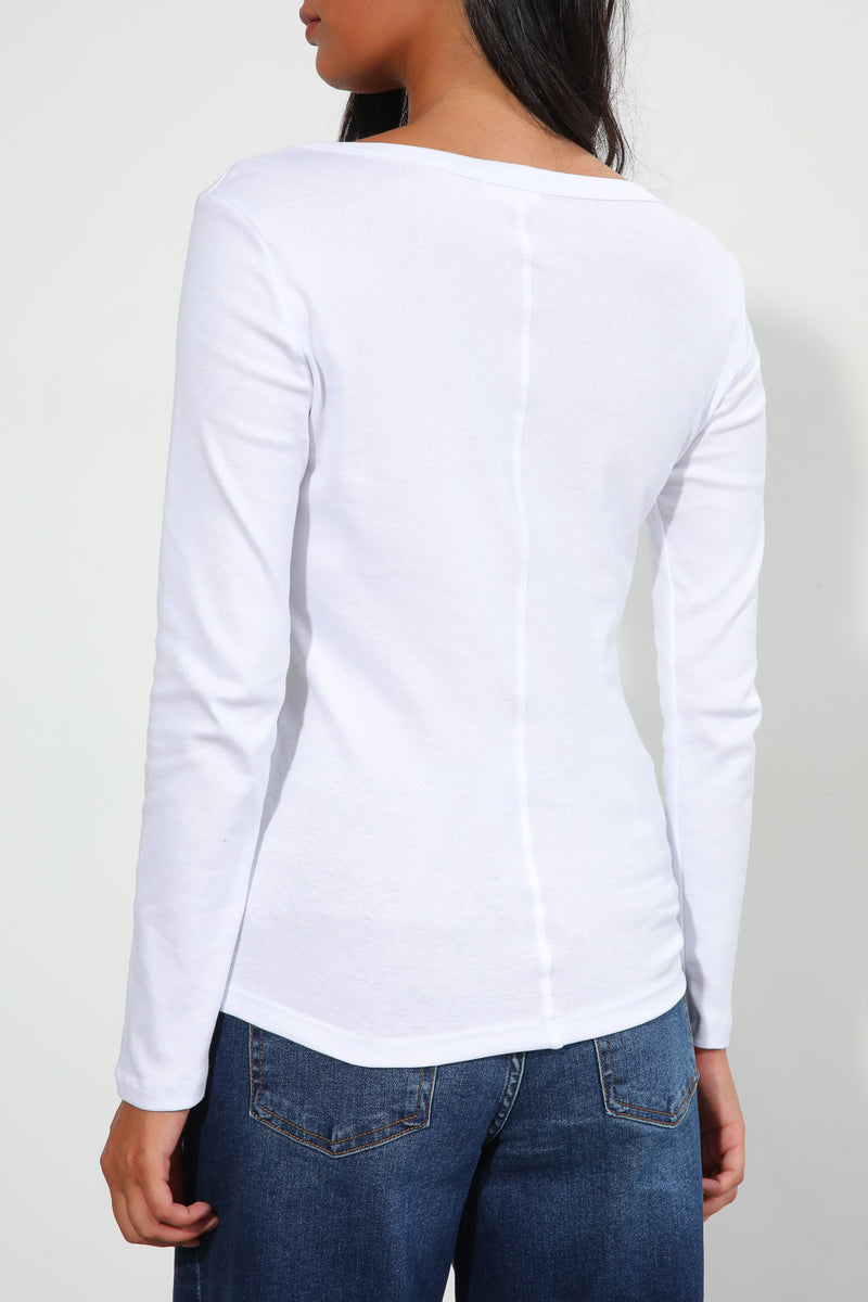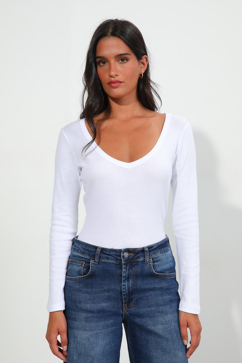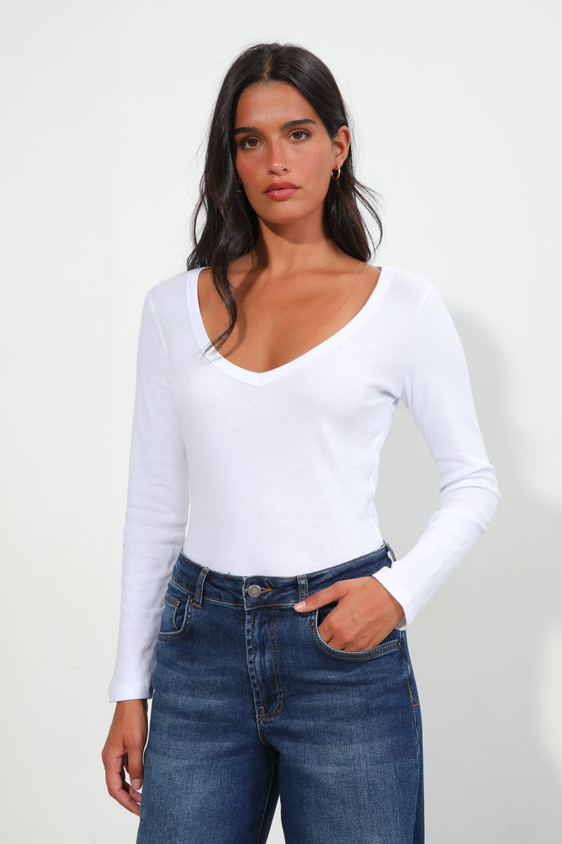 חולצת בייסיק עם צווארון וי רחב ושרוול ארוך,