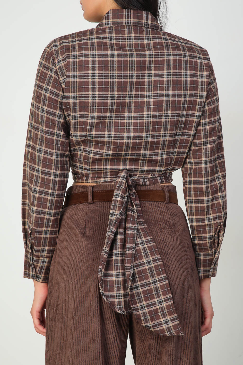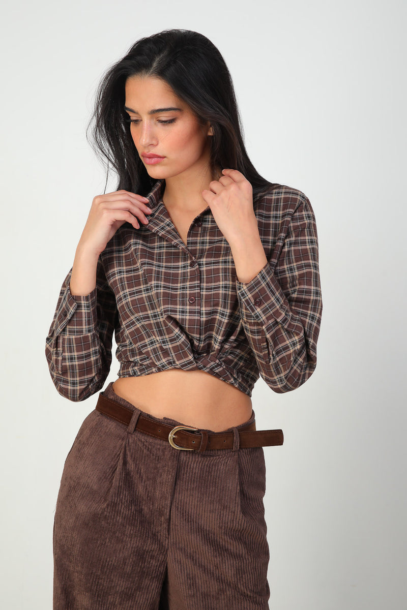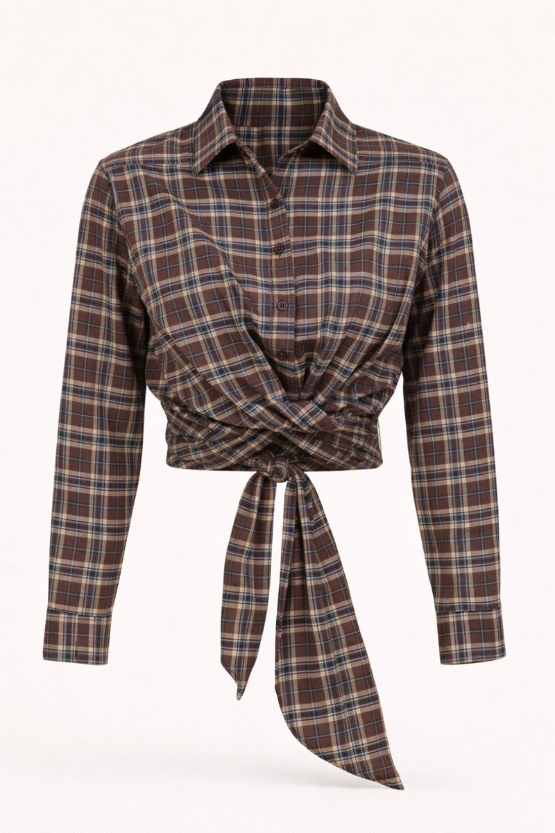חולצת משבצות בגזרה קצרה וקשירה קדמית ארוכה ליצירת מראה נשי ומודגש.