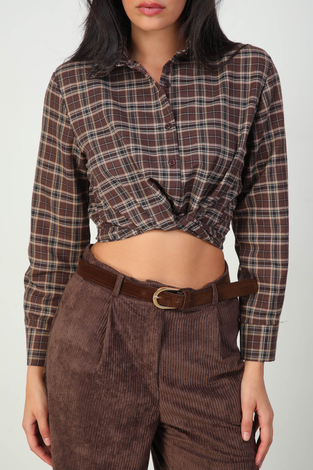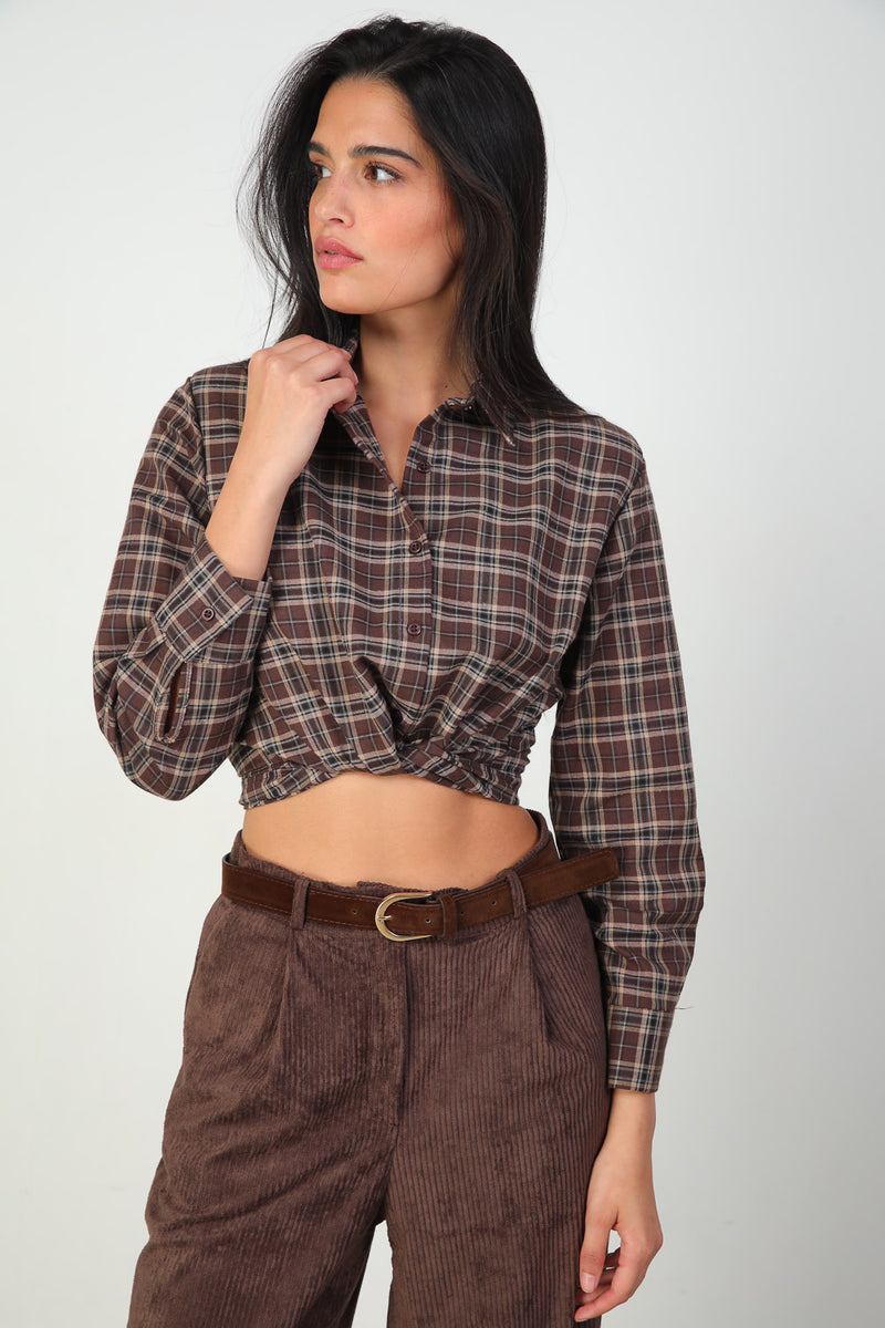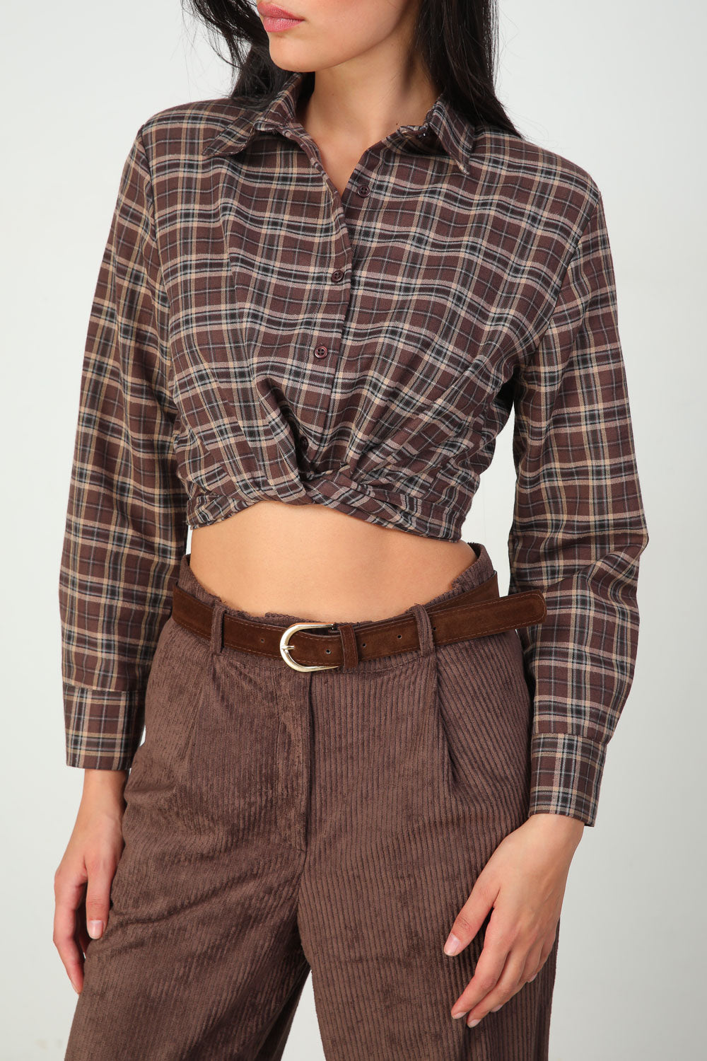 חולצת משבצות בגזרה קצרה וקשירה קדמית ארוכה ליצירת מראה נשי ומודגש.