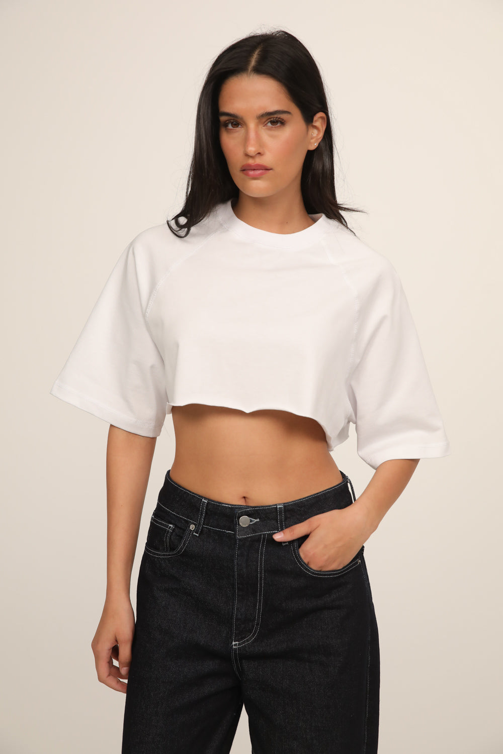 האורך הקצר יוצר סילואט מחמיאה ומתאים במיוחד לשילוב עם ג׳ינס או מכנס בגזרה גבוהה ללוק יומיומי קליל ועדכני.