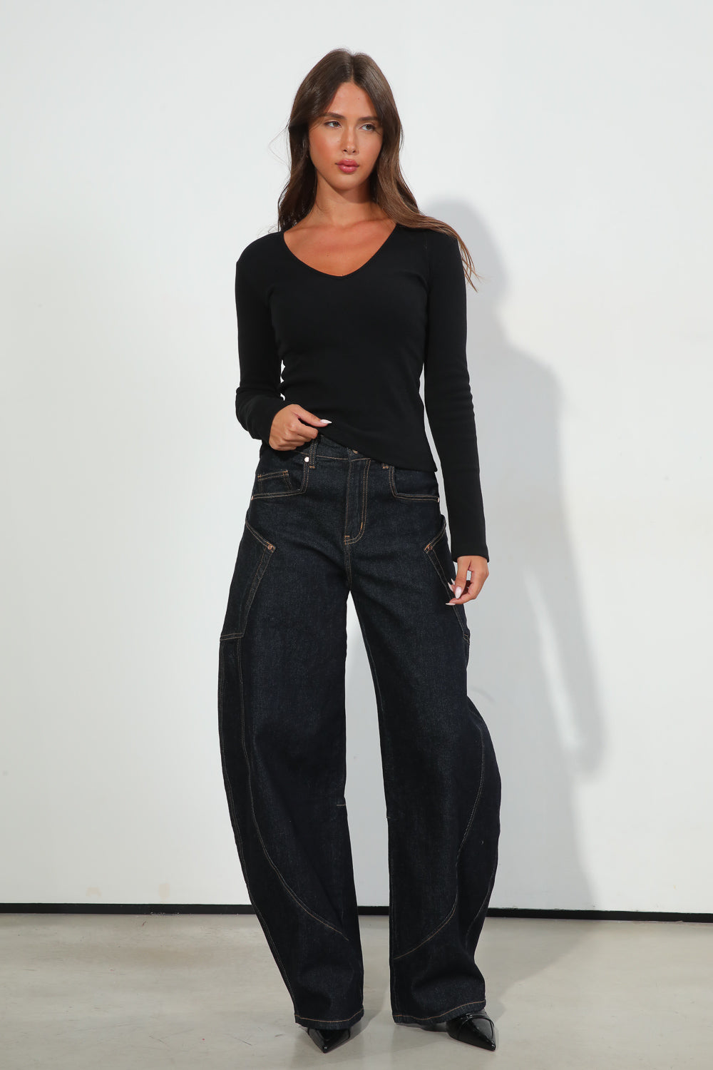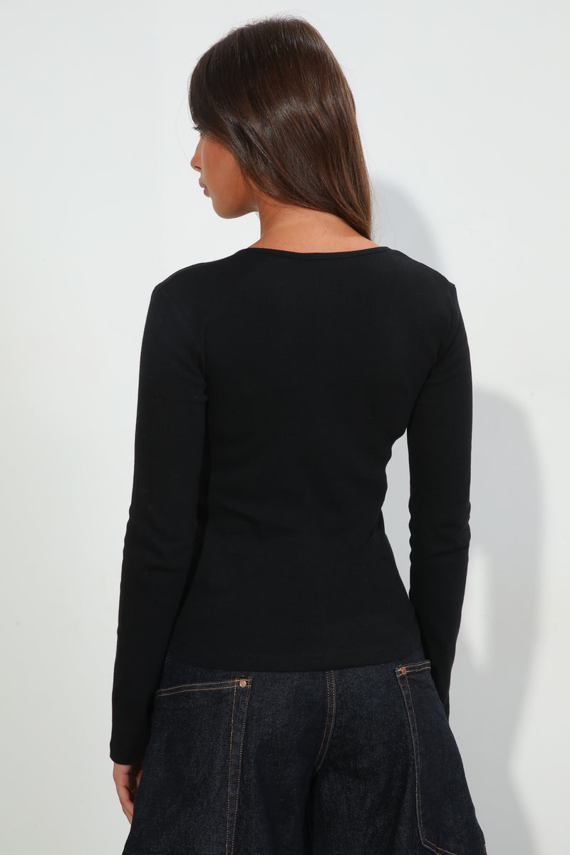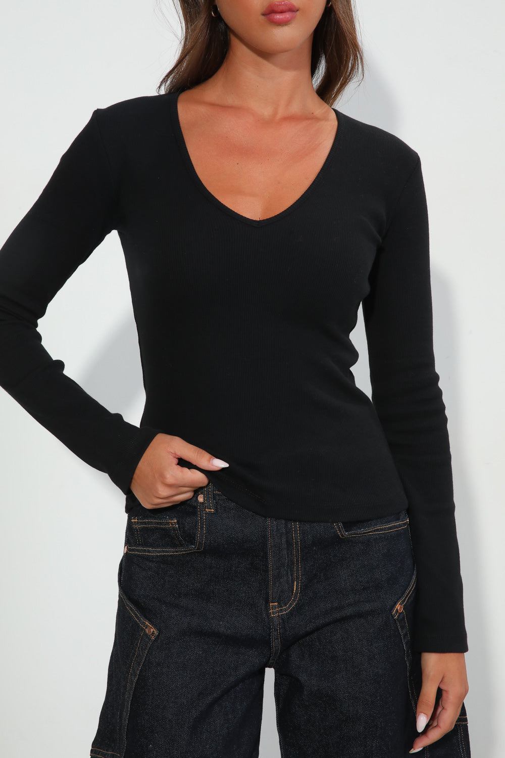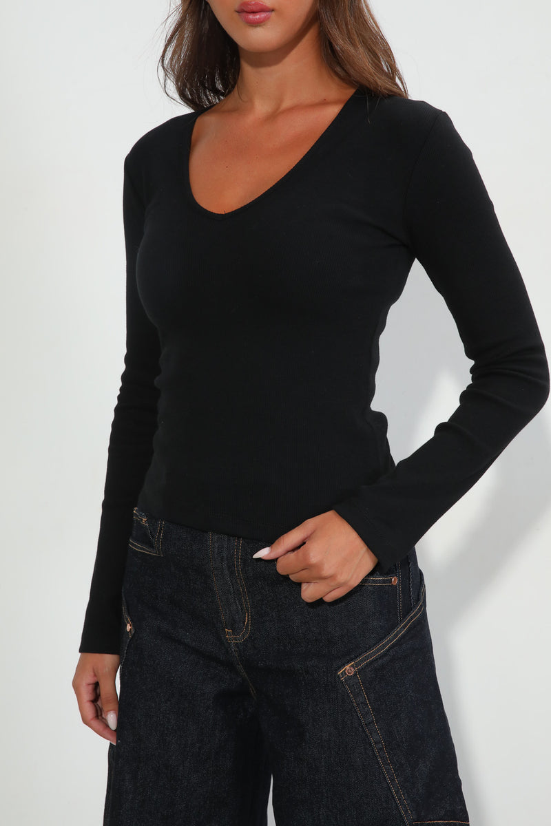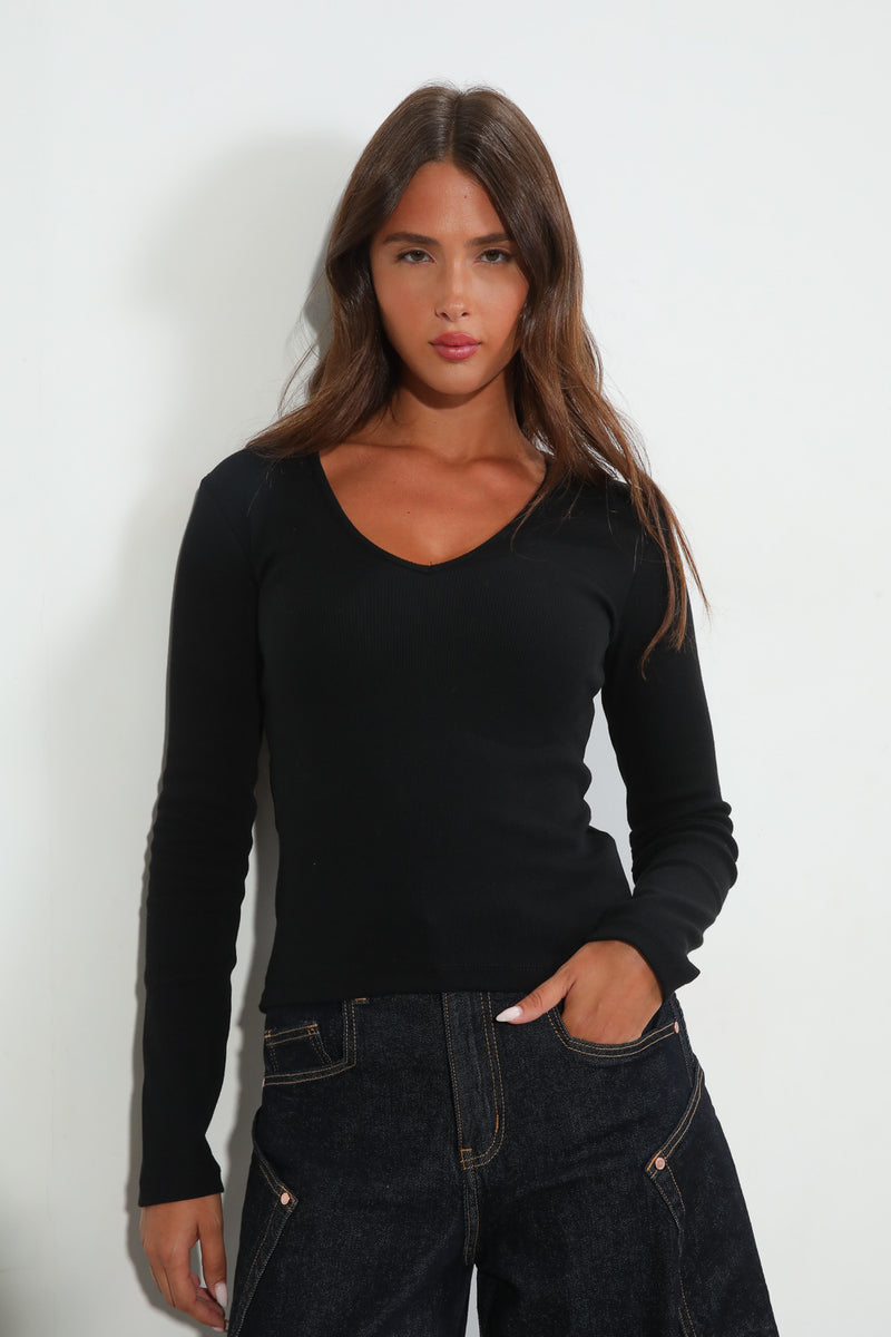 חולצת בייסיק בטקסטורת ריפ עדינה עם צווארון וי רחב ושרוולים ארוכים,