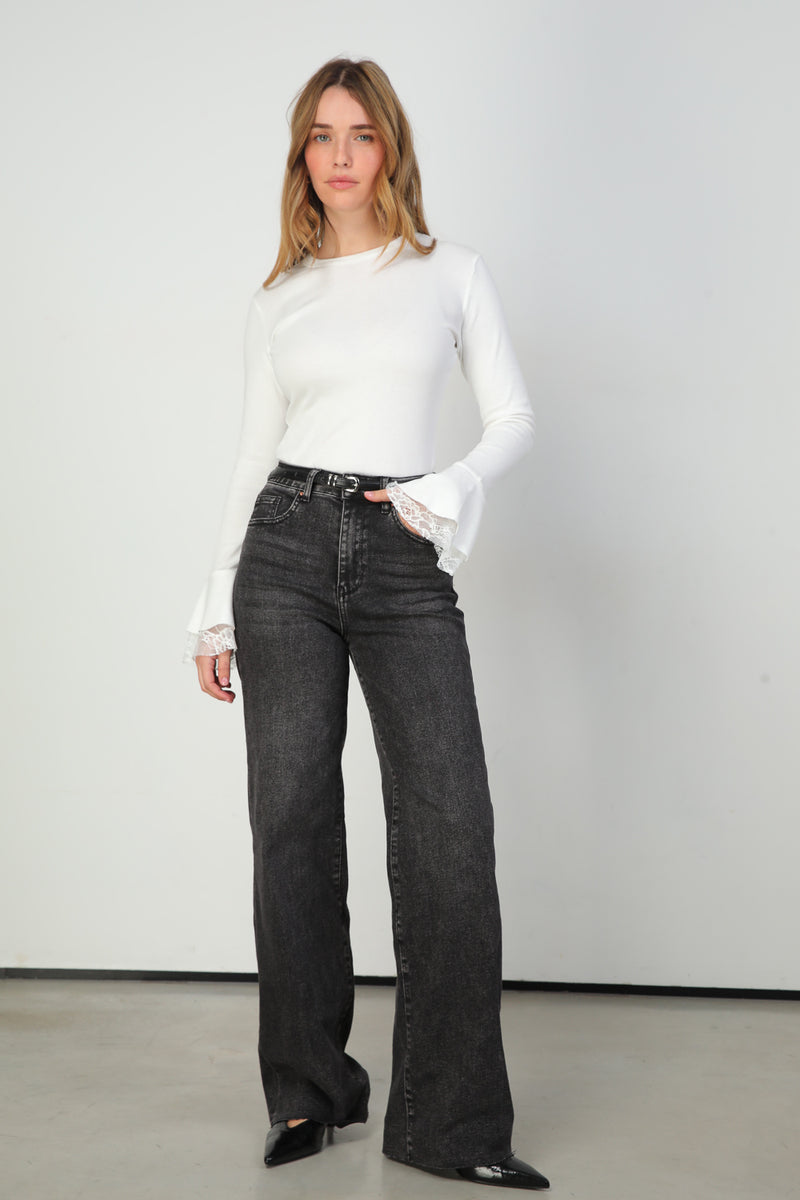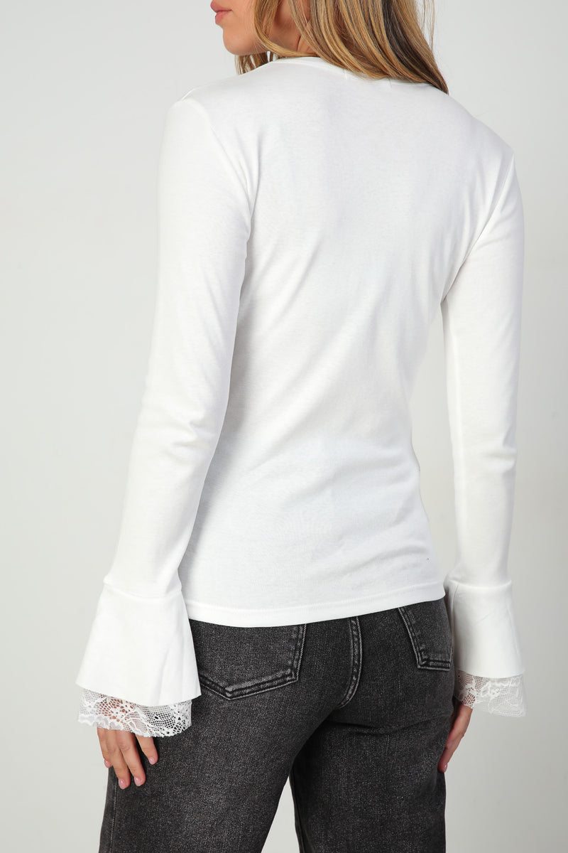 חולצת בייסיק בגזרה צמודה עם מראה נקי ועל זמני. עשויה בד רך ונעים בגוון אוף וויט, עם צווארון עגול ושרוולים ארוכים בגימור מתרחב עדין בקצה בשילוב תחרה. הגזרה המחמיאה הופכת אותה לפריט בסיס מושלם לשילוב יומיומי, בין אם עם ג’ינס, מכנסיים מחויטים או מתחת לג’קט.
