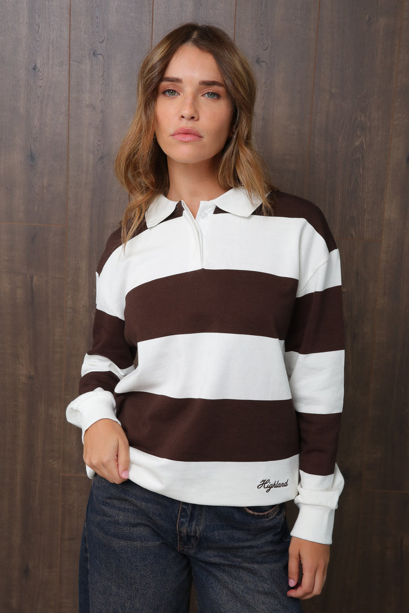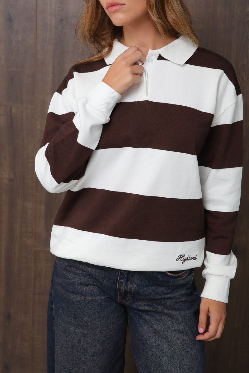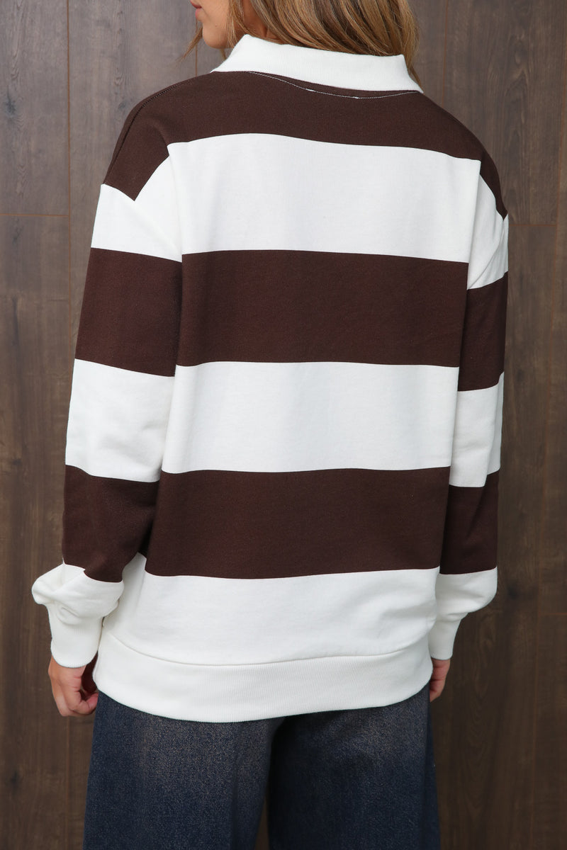 סווטשירט פסים אול אובר בשילוב רקמה בחזית, צווארון שינה ו3 כפתורים,
