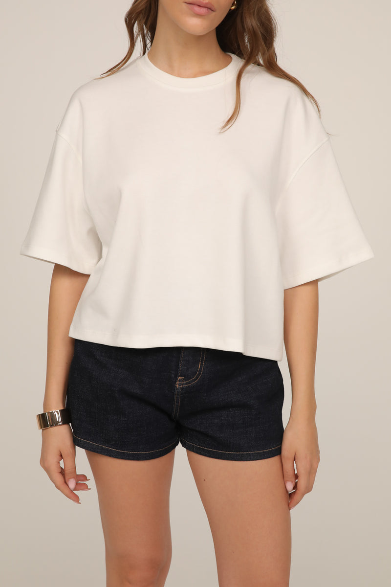 עשויה בד רך ונעים למגע, עם מפתח צוואר עגול ושרוולים קצרים ורחבים שמעניקים סילואט קלילה.