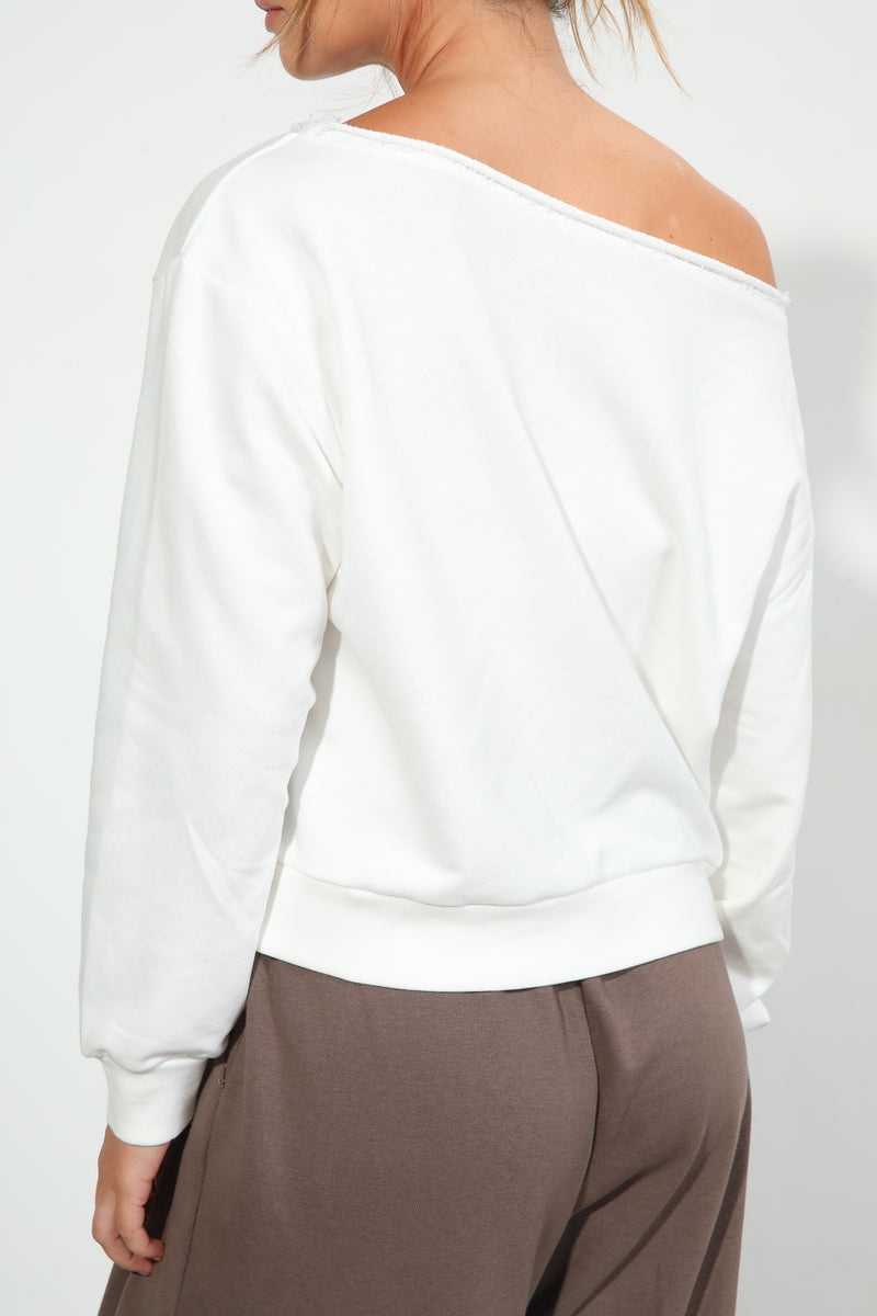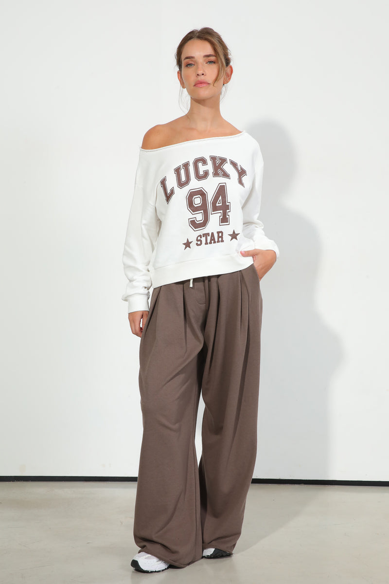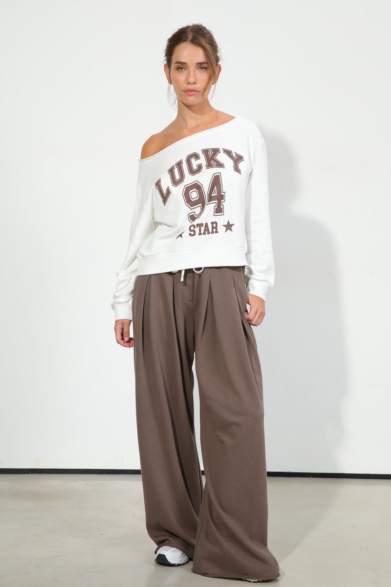 סווטשירט אוברסייז עם צווארון עגול רחב ודפוס בחזית,