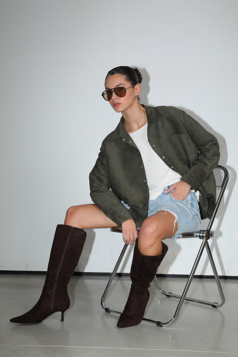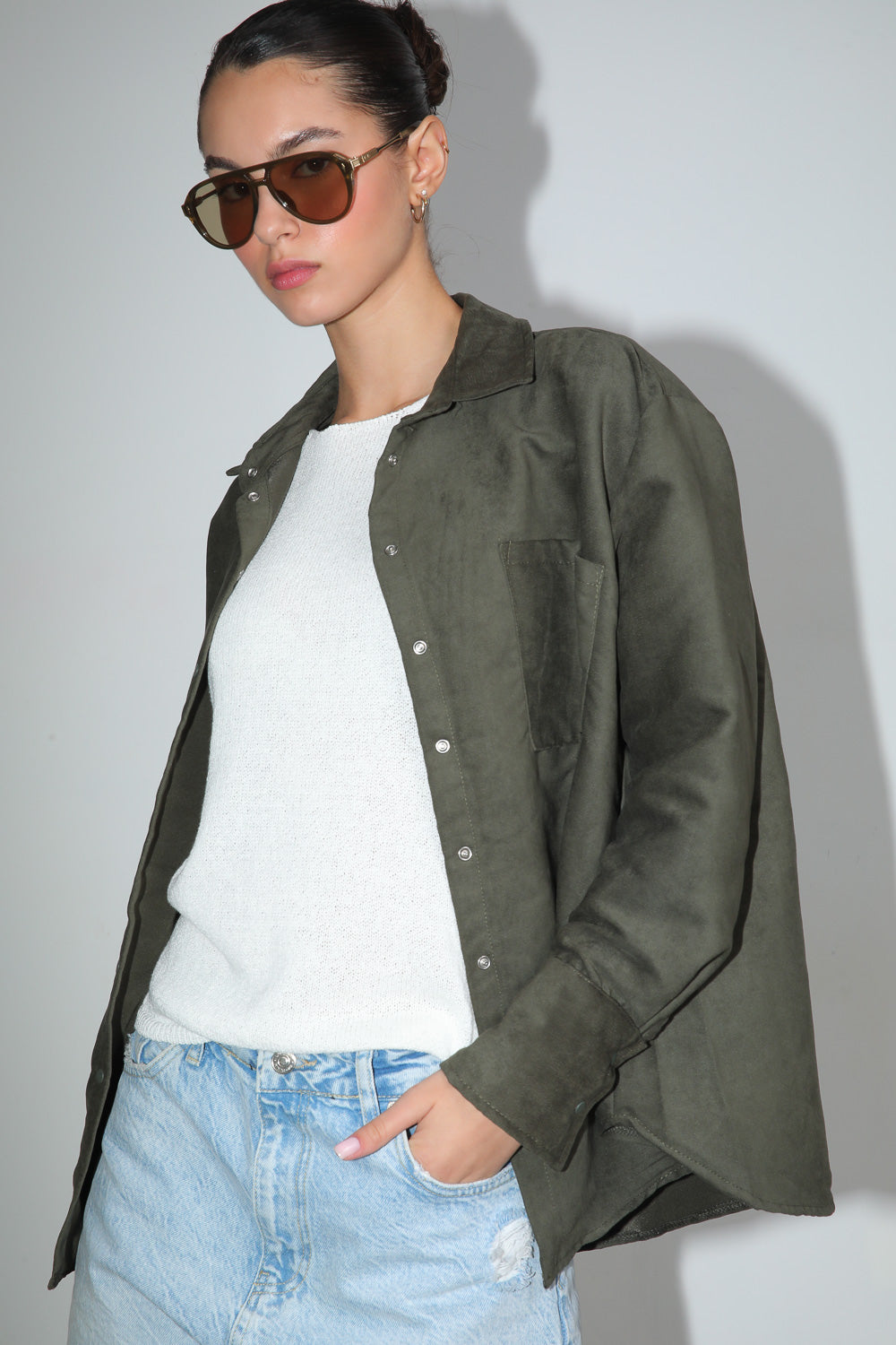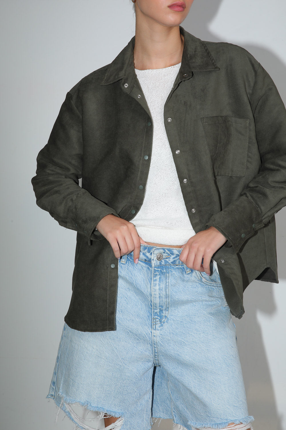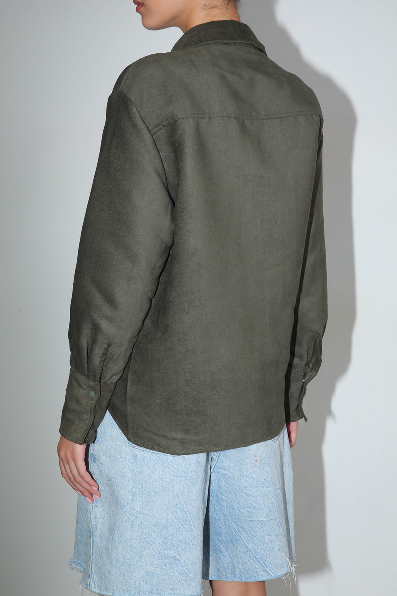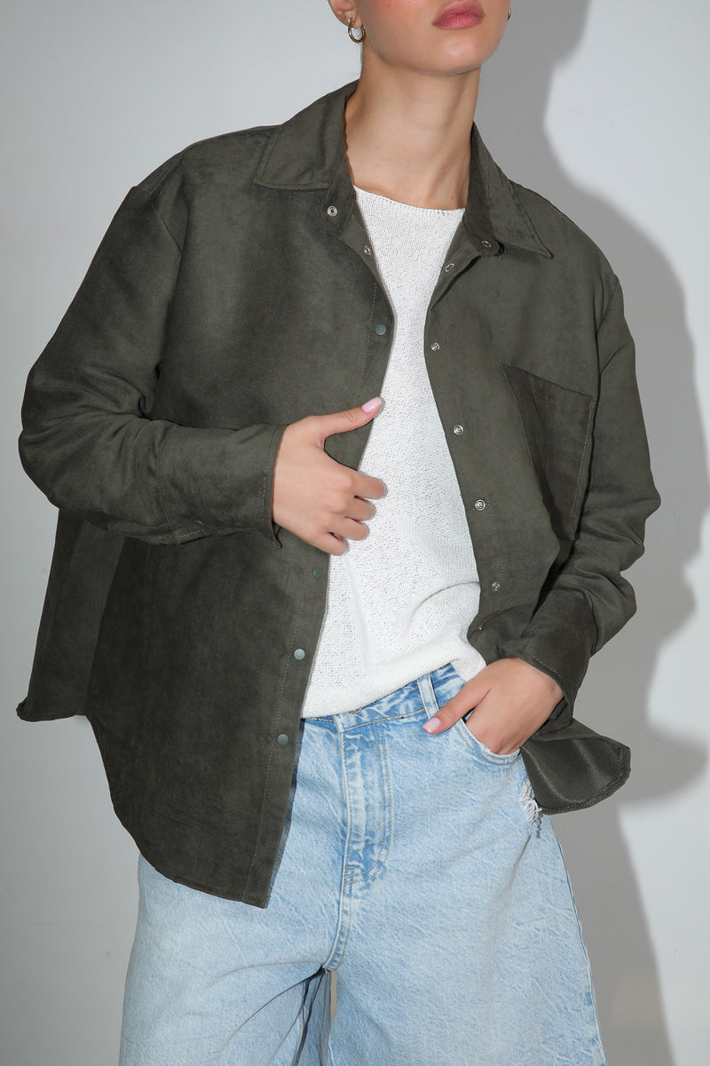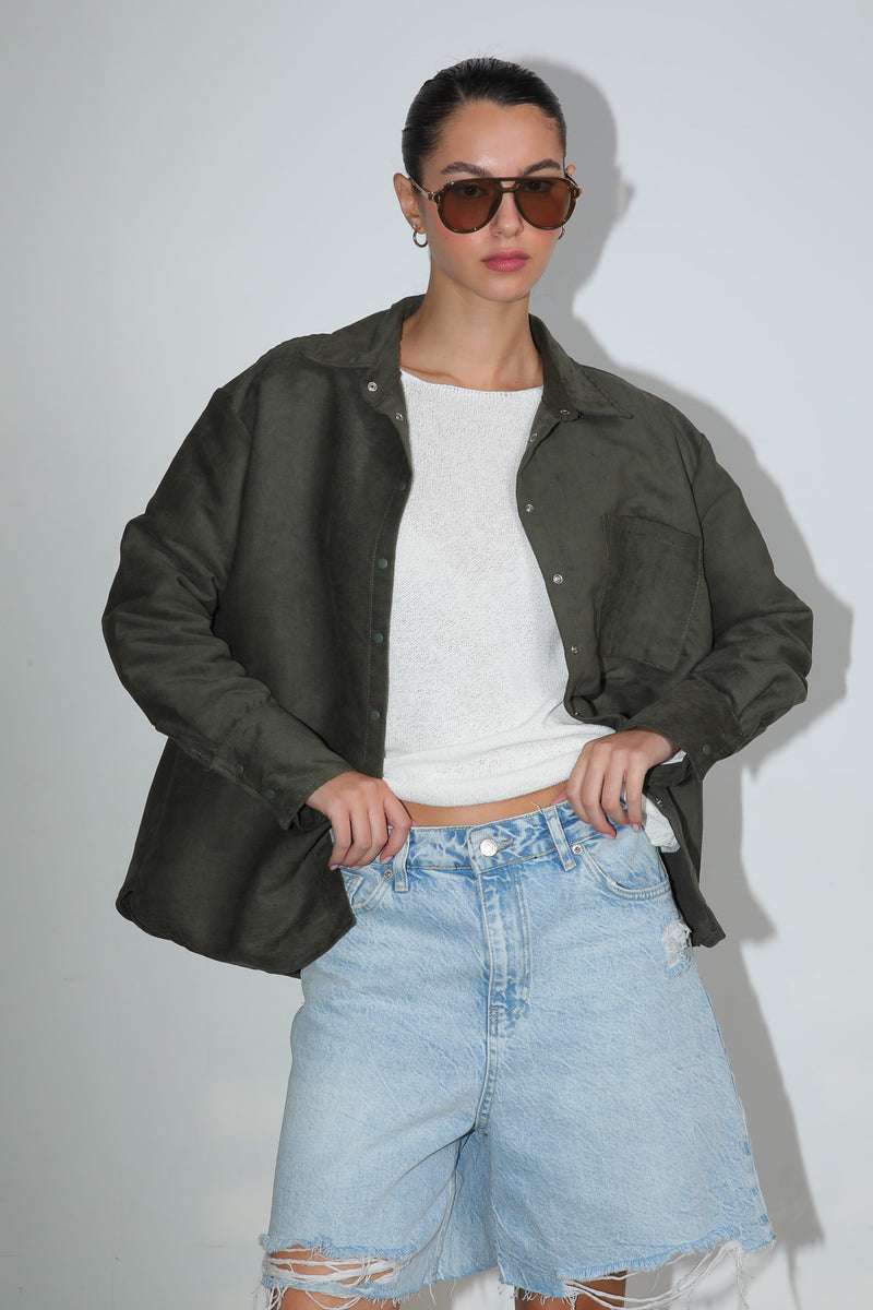 חולצה מכופתרת בטקסטורת ז'מש עם סגירת כפתורים וכיס בחזית,
