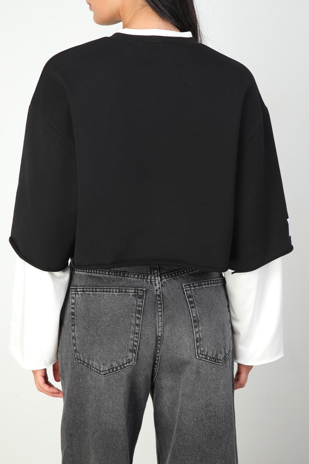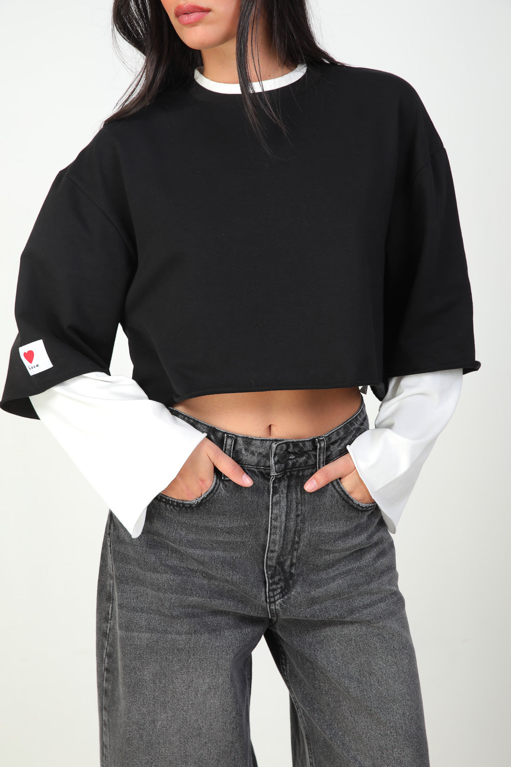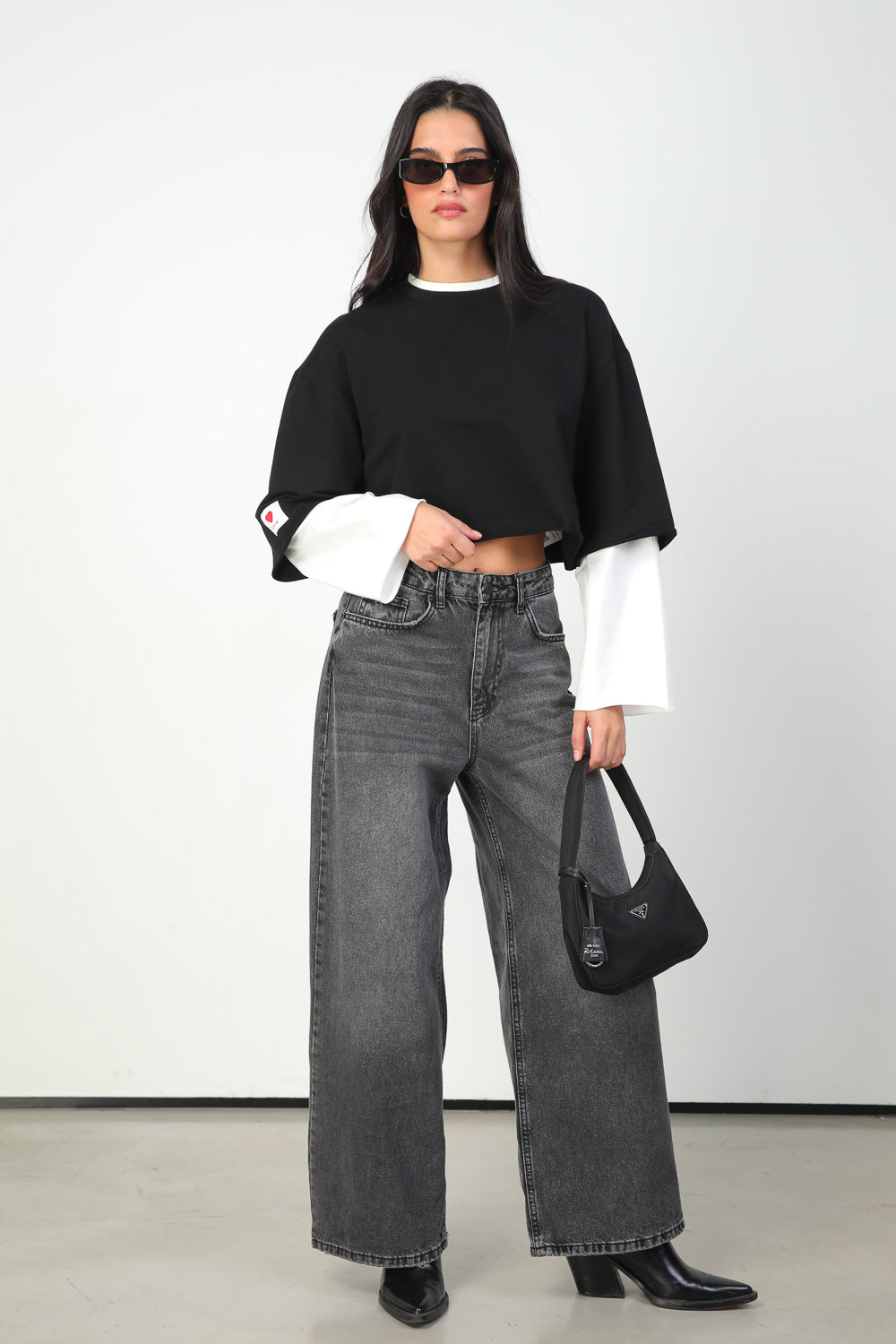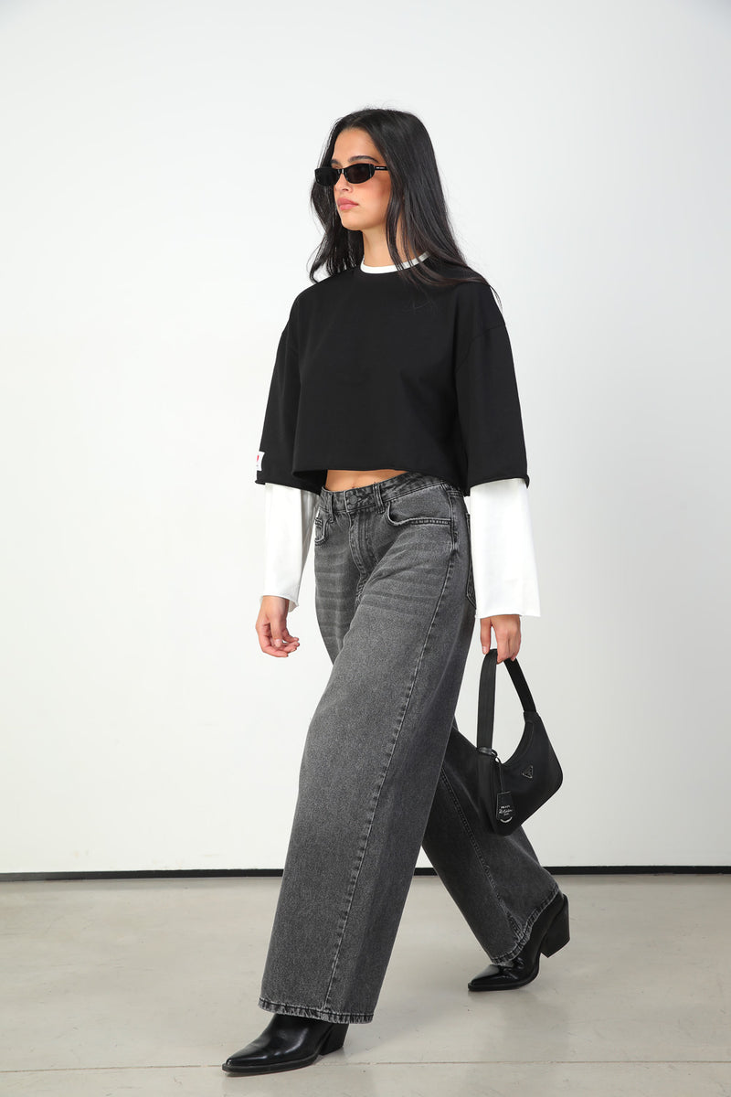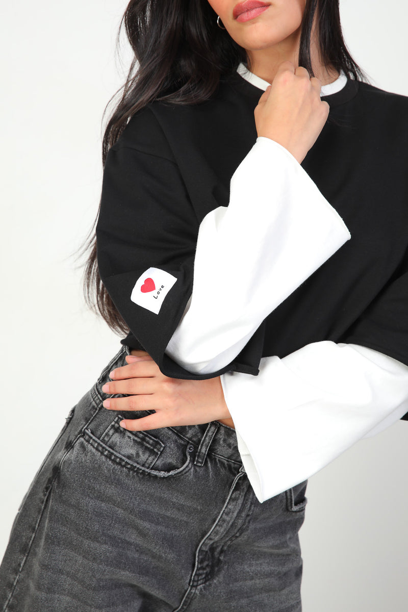 חולצה בגזרת בייסיק רפויה עם מראה נקי ויומיומי. כוללת צווארון עגול ושרוולים ארוכים בגימור רחב עם ניגוד עדין בקצה השרוול, שמוסיף טאץ’ עיצובי ייחודי. עשויה בד רך ונעים בגוון שחור קלאסי, ומתאימה לשילוב קל עם ג’ינס, מכנסיים גבוהים או חצאיות ללוק קז’ואל נינוח ומעודכן.