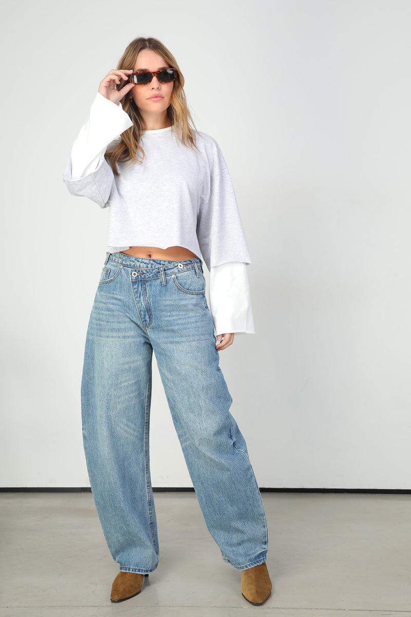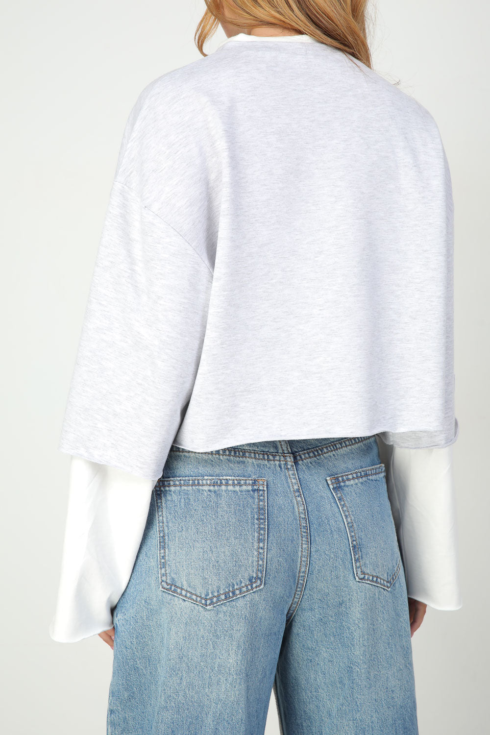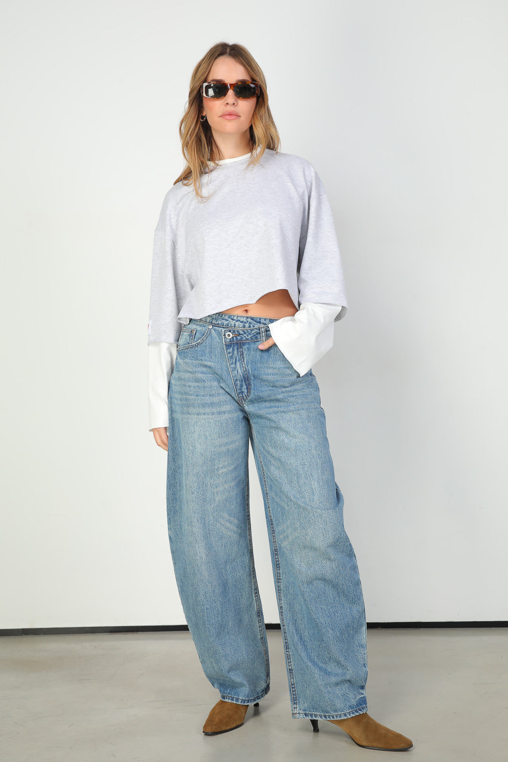 חולצה בגזרת בייסיק רפויה עם מראה נקי ויומיומי. כוללת צווארון עגול ושרוולים ארוכים בגימור רחב עם ניגוד עדין בקצה השרוול, שמוסיף טאץ’ עיצובי ייחודי. עשויה בד רך ונעים בגוון אפור בהיר, ומתאימה לשילוב קל עם ג’ינס, מכנסיים גבוהים או חצאיות ללוק קז’ואל נינוח ומעודכן.
